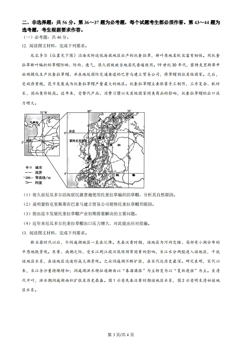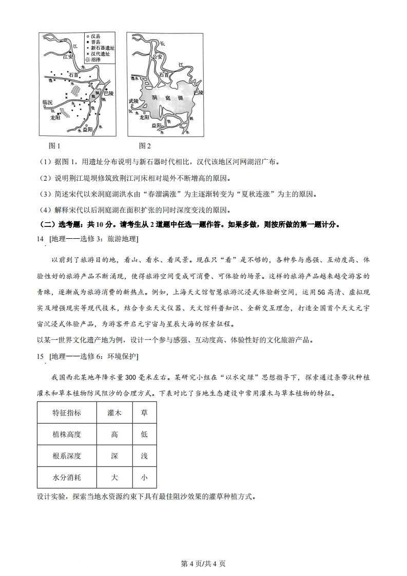 2024年普通高等学校招生全国统一考试(全国甲卷)一、选择题:本题共35小题,每小题4分,共140分。在每小题给出的四个选项中,只有一项是符合题目要求的苏州工业园区是中国和新加坡两国政府间的重要合作项目。图1示意苏州工业园区中的中新合作区1994-2000年实施的功能区布局规划。规划思路是通过基础设施建设,优先开发工业用地:当人口集聚到一定规模后,加大开发居住用地:当人口进一步集聚后,再重点开发商业用地。据此完成下面小题。强力支设苏州工业园区278km3苏州老城城市主干道部®m写四商业器住老区蜜力支棵自工业区1.中新合作区的工业区对商业区形成强力支撑的原因是工业区带动了()①人口集聚②服务业集聚③人才集聚④技术集聚A.①②B.②③C.③④D.①④2.将中新合作区的住宅区规划在商业区和工业区之间,主要有利于()A.节约土地资源B.增加绿地面积C.组织内外交通D.完善市政设施3.从苏州老城主干道向东延伸串联中新合作区各功能区,体现的布局思路是()①轴向发展②职住平衡③均衡发展④地租递减A.①③B.①④C.②③D.①④位于三江平原的某大型农场开垦沼泽地,最初主要种植小麦,近年来主要种植水稻。该农场抽取地下水注入露天水池,蓄存一段时间后引入稻田灌溉。据此完成下面小题。4.该农场开垦沼泽地种植小麦,首先需要()A.提高土壤肥力B.降低地下水位C.提高土壤温度D.控制土壤侵蚀5.将抽取的地下水在露天水池蓄存一段时间后再引入稻田灌溉的目的是()A.营造景观B.积蓄水量C.沉淀泥沙D.提高水温阿拉斯加某冰川前端(61.5°N,142.9°W附近)的冰面上,呈斑块状分布着少量的矿物质,并生长着一种苔薛球。这种苔藓球内部由生物体和有机残体交织,形成相对独立的生存环境。它们靠暖季在冰面上滚动方能维持生存,被形象地称为“冰川老鼠”。下图是冰面上的苔藓球照片。据此完成下面小题。第1页共4页6.最能增加该地冰面矿物质的是()A冰蚀洼地冻融B.冰川两侧河流沉积C.大气粉尘沉降D.冰面砾石物理风化7.“冰川老鼠”在暖季滚动使其()A.排出水分B.获得养分C.躲避阳光D.保持热量8.暖季“冰川老鼠”内部比周边大气()A.平均温度高B.氧气含量高C.水汽含量低D.气压波动大下图所示剖面位于青藏高原东缘的黄河岸边,该剖面含有丰富的环境演化信息。剖面中的泥沼土层是在相对静水环境下形成的。据此完成下面小题。距今时间/千年深度/cm08.1120011.81屬土壤层☐风沙与泥沼土互层14.50400☐灰绿色泥沼土层目冰水扇洪积扇砂砾石层E5009.风沙与泥沼土互层中,与风沙层相比,泥沼土层沉积物()A.颗粒较粗,有机质较少B.颗粒较细,有机质较少C.颗粒较粗,有机质较多D.颗粒较细,有机质较多10.推测灰绿色泥沼土层上部(深度约230~260厘米)出现的波状形变形成于()A.冻融造成的变形B.构造挤压变形C.流水不均匀沉积D.风沙差异沉积11.距今约15~8千年,该地区气候变化总体趋势是()A.持续升温B.持续降温C.波动升温D.波动降温第2页/共4页