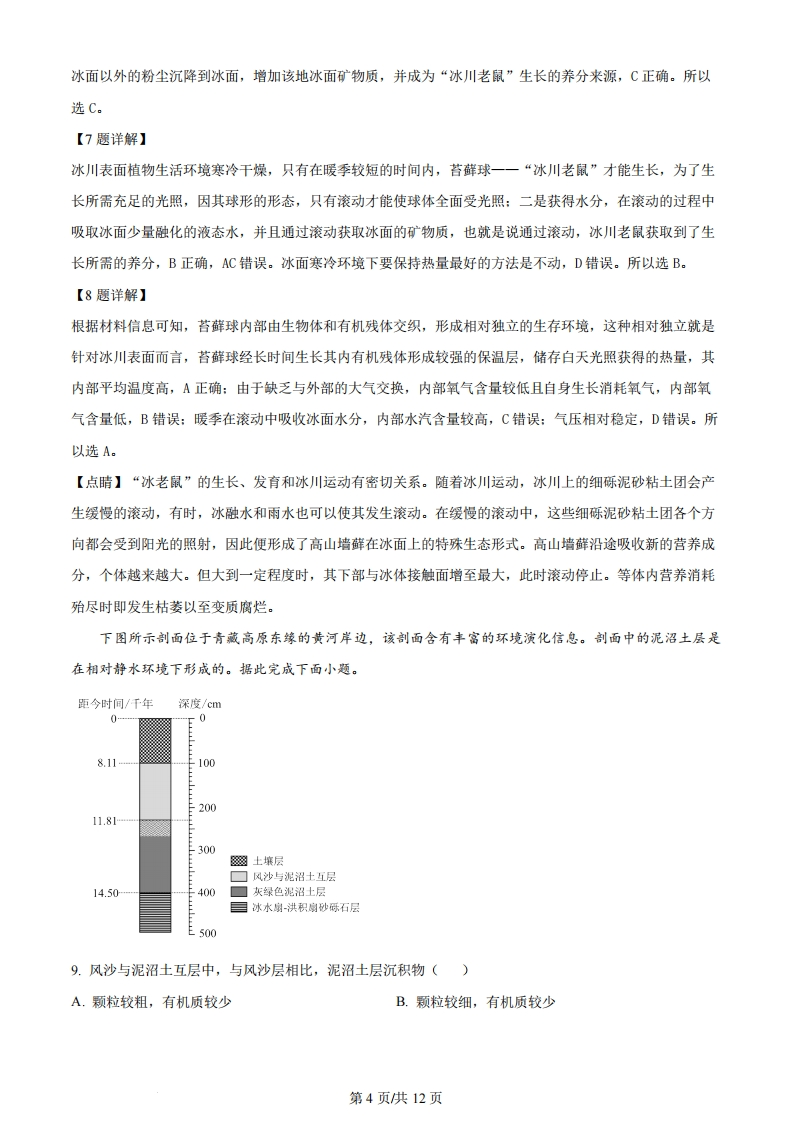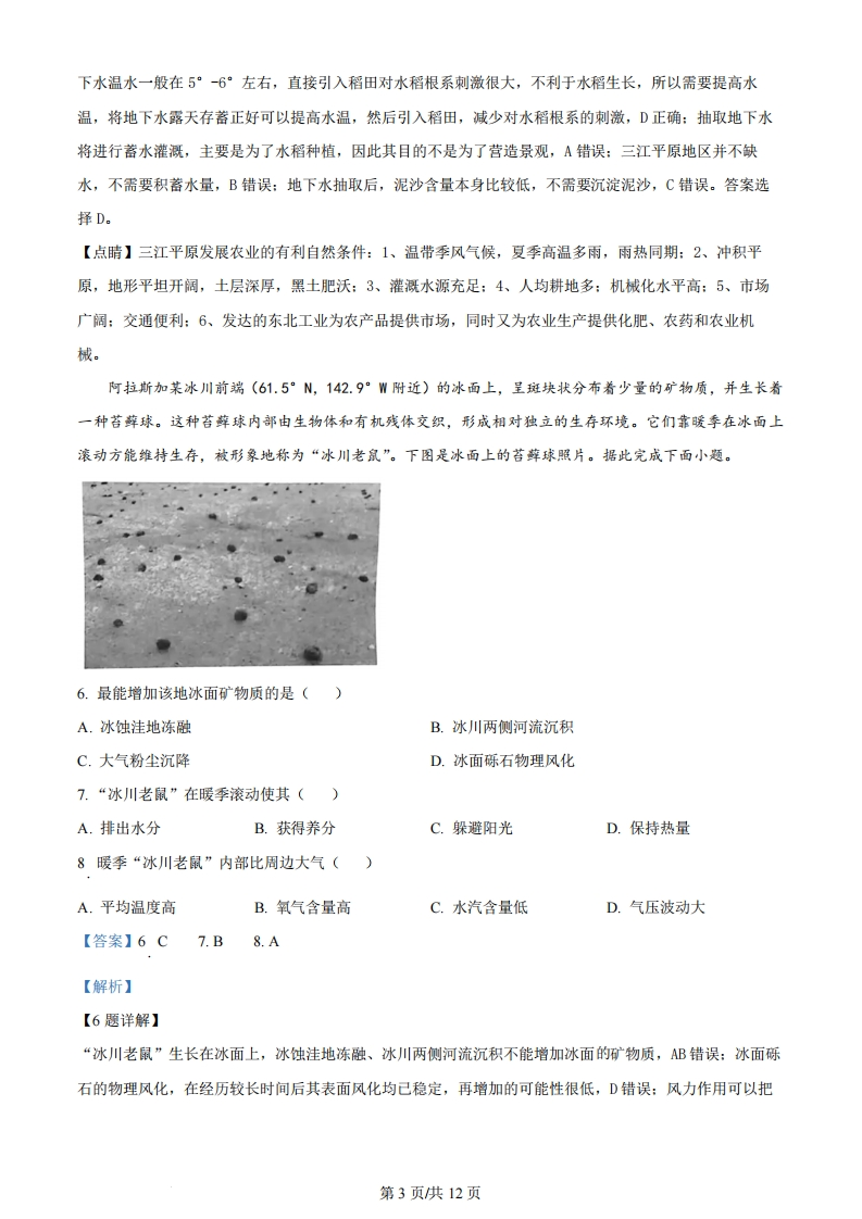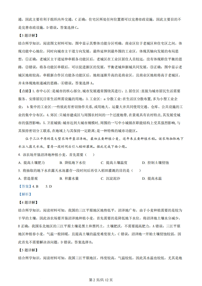 2024年普通高等学校招生全国统一考试(全国甲卷)一、选择题:本题共35小题,每小题4分,共140分。在每小题给出的四个选项中,只有一项是符合题目要求的苏州工业园区是中国和新加坡两国政府间的重要合作项目。图1示意苏州工业园区中的中新合作区1994-2000年实施的功能区布局规划。规划思路是通过基础设施建设,优先开发工业用地:当人口集聚到一定规模后,加大开发居住用地:当人口进一步集聚后,再重点开发商业用地。据此完成下面小题。强力支设苏州工业园区278km苏州老城城市主干道m号四商业器住老区蜜力支棵自工业区1.中新合作区的工业区对商业区形成强力支撑的原因是工业区带动了()①人口集聚②服务业集聚③人才集聚④技术集聚A.①②B.②③C.③④D.①④2.将中新合作区的住宅区规划在商业区和工业区之间,主要有利于()A.节约土地资源B.增加绿地面积C.组织内外交通D.完善市政设施3.从苏州老城主干道向东延伸串联中新合作区各功能区,体现的布局思路是()①轴向发展②职住平衡③均衡发展④地租递减A.①③B.①④C.②③D.①④【答案】1.A2.C3.A【解析】【1题详解】结合所学知识,阅读图文材料可知,中新合作区的工业区的建立,将吸引大量的人口集中到居住区,对商业区带来大量的人流量,①正确:同时工业区就业人数数量大,可以带动服务业的发展,促进服务业在商业区集中,②正确:人才的集聚和技术的集聚对商业区的影响起不到支撑作用,③和④错误。答案选择Ae【2题详解】结合所学知识,阅读图文材料可知,住宅区规划在商业区和工业区之间,并不能节约土地资源,A错误:住宅区范围较大,位于两者之间,绿化带的范围大小主要看设计思想,于位置关系不大,B错误:图中显示城市主干道贯穿住宅区、商业区和工业区,而住宅区位于中间,主要是为了加强居民工作和休闲的交第1页供12页通,因此主要有利于组织内外交通,C正确:住宅区所处任何位置都可以完善市政设施,因此主要目的不是完善市政设施,D错误。答案选择C。【3题详解】结合所学知识,阅读图文材料可知,图中显示其整体功能分区明确,商业区位于老城区和住宅区之间,体现功能中心地位,同时向城市主干道方向发展,最终延伸到最外围的工业区,体现其轴向发展的布局思想,①正确:老城区主干道延伸串联各功能区后,老城区在工业区居住人员较远,没有体现职住平衡的思路,②错误:将各功能区串联后,可以促进新区的发展,平衡老城和新城共同发展,③正确:图中显示老城区地租较高,串联新合作区功能各功能区后,地租逐渐升高的是商业区,且商业区地租将高于老城区,并未体现地租递减的思路,④错误。答案选择A。【点睛】1.市中心区:是城市的核心部分,城市发展通常围绕其进行:2.居住区:直接为城市居民生活需要服务、安排居民日常生活所需设施的用地:3.工业区:分散工业:在生活区分散布置,多为小型工业企业:b集中的工业区:一些彼此有密切协作关系,或用地大、运量大并共同使用交通、仓库、公共设施的工业的集中分布区:4.郊区:只城市建成区与周围农村间的一个过渡地带,在景观具有农村特点,其发展受城市的强烈影响:5.卫星城镇:城市达到大城市规模时,周围的一写中小城镇在职能结构上受其强烈影响,与其保持密切分工联系,在地域上与其保持一定距离:是一种特殊的城市功能区。位于三江平原的某大型农场开垦沼泽地,最初主要种植小麦,近年来主要种植水稻。该农场抽取地下水注入露天水池,蓄存一段时间后引入稻田灌溉。据此完成下面小题。4.该农场开垦沼泽地种植小麦,首先需要()A.提高土壤肥力B.降低地下水位C.提高土壤温度D.控制土壤侵蚀5.将抽取的地下水在露天水池蓄存一段时间后再引入稻田灌溉的目的是()A.营造景观B.积蓄水量C.沉淀泥沙D.提高水温【答案】4.B5.D【解析】【4题详解】结合所学知识,阅读材料可知,我国的三江平原地区地势低平,沼泽地广布,由于小麦种植需要的是较为干旱的土壤,因此该农场要开垦沼泽地种植小麦,首先需要的是降低地下水位,将沼泽地土壤水分减少,B正确:我国东北地区的三江平原土壤是黑土和黑钙土,土壤肥沃,不需要提高肥力,A错误:三江平原地区种植春小麦,气温一股回暖,且提高土壤的温度难度很大,C错误:沼泽地一开始土壤侵蚀较弱,因此首先不需要解决该问题,D错误。答案选择B。【5题详解】结合所学知识,阅读材料可知,我国三江平原地区,纬度较高,气温较低,因此其水温也较低,尤其是地第2页供12页