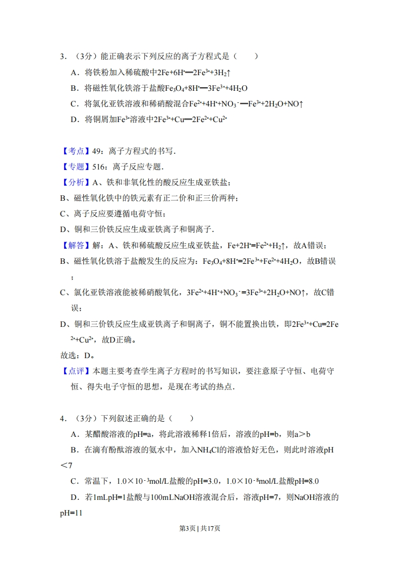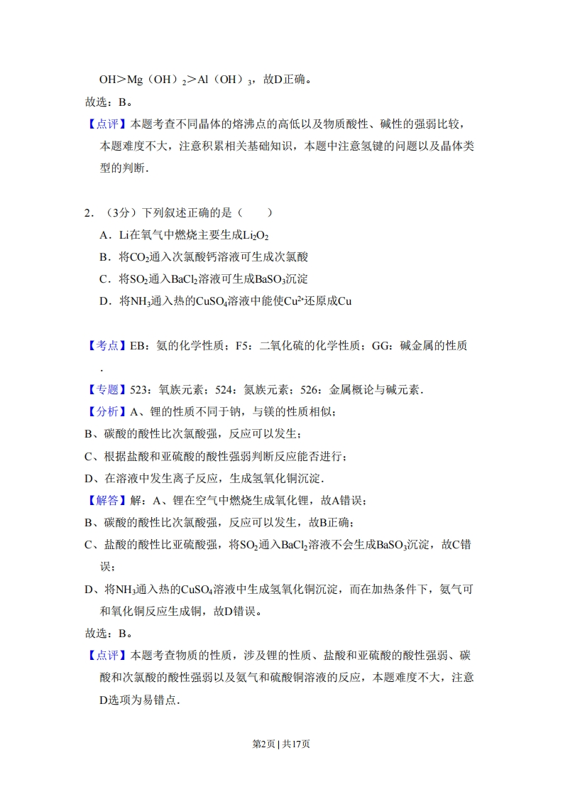 OH>Mg(OH)2>A1(OH)3,故D正确。故选:B。【点评】本题考查不同晶体的熔沸点的高低以及物质酸性、碱性的强弱比较,本题难度不大,注意积累相关基础知识,本题中注意氢键的问题以及晶体类型的判断.2.(3分)下列叙述正确的是()A.Li在氧气中燃烧主要生成Li2O2B.将CO2通入次氯酸钙溶液可生成次氯酸C.将SO2通入BaC2溶液可生成BaSO,沉淀D.将NH3,通入热的CuSO4溶液中能使Cu2还原成Cu【考点】EB:氨的化学性质:F5:二氧化硫的化学性质:GG:碱金属的性质【专题】523:氧族元素;524:氮族元素:526:金属概论与碱元素.【分析】A、锂的性质不同于钠,与镁的性质相似:B、碳酸的酸性比次氯酸强,反应可以发生:C、根据盐酸和亚硫酸的酸性强弱判断反应能否进行:D、在溶液中发生离子反应,生成氢氧化铜沉淀【解答】解:A、锂在空气中燃烧生成氧化锂,故A错误:B、碳酸的酸性比次氯酸强,反应可以发生,故B正确:C、盐酸的酸性比亚硫酸强,将SO2通入BaCl2溶液不会生成BaSO,沉淀,故C错误:D、将NH通入热的CuSO4溶液中生成氢氧化铜沉淀,而在加热条件下,氨气可和氧化铜反应生成铜,故D错误。故选:B。【点评】本题考查物质的性质,涉及锂的性质、盐酸和亚硫酸的酸性强弱、碳酸和次氯酸的酸性强弱以及氨气和硫酸铜溶液的反应,本题难度不大,注意D选项为易错点,第2页|共17页