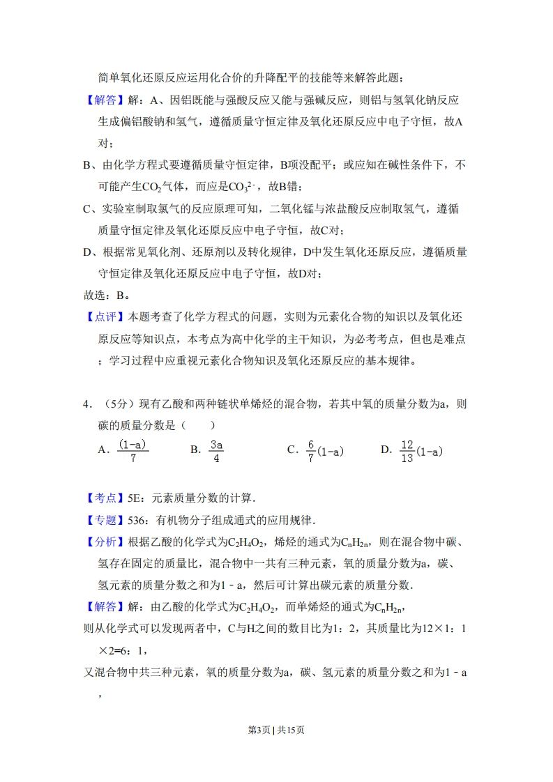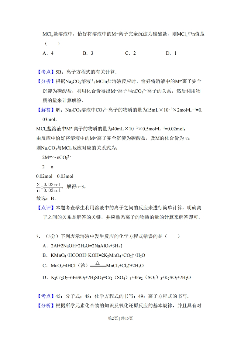 2009年全国统一高考化学试卷(全国卷1)事考答案与试题佩折一、选择题(共8小题,每小题5分,满分40分)1.(5分)下列各组离子,在溶液中能大量共存、加入NaOH溶液后加热既有气体放出又有沉淀生成的一组是()A.Ba2、NO3、NH4'、CIB.Ca2、HCO3、NH4'、AlO2C.K、Ba2、Cl、HSO3D.Mg2、NH4、SO42-、K【考点】DP:离子共存问题.【专题】21:热点问题:52:元素及其化合物.【分析】根据溶液中离子之间不能结合生成水、气体、沉淀、弱电解质,不能发生氧化还原反应、不能促进电离来分析离子在溶液中能大量共存:然后根据溶液中的离子与NOH溶液反应既有气体放出又有沉淀生成的即为正确答案【解答】解:A、因该组离子之间不反应,则离子能大量共存,当加入NOH会与NH4反应产生NH3,但没有沉淀,故A错误:B、因AIO2能促进HCO3的电离,生成A1(OH)3沉淀和碳酸根离子,则该组离子不能大量共存,故B错误:C、因该组离子之间不反应,则离子能大量共存,当加入NOH会与HSO3~生成S032,S032-与Ba2可生成BaS03沉淀,但无气体生成,故C错误:D、因该组离子之间不反应,则离子能大量共存,当加入NOH后,OH与NH4产生NH,OH与Mg2会产生Mg(OH)2沉淀,符合题意,故D正确:故选:D。【点评】本题考查离子的共存问题及复分解反应,明确题意中原离子组能共存,当加入碱既有气体又有沉淀生成两个条件来分析解答,熟悉离子的性质及常见离子之间的反应是解答的关键.2.(5分)将15mL2molL1Na2C03溶液逐滴加入到40mL0.5molL1第1页|共15页MCln盐溶液中,恰好将溶液中的M离子完全沉淀为碳酸盐,则MCln中n值是()A.4B.3C.2D.1【考点】5B:离子方程式的有关计算,【分析】根据Na2CO,溶液与MCln盐溶液反应时,恰好将溶液中的M离子完全沉淀为碳酸盐,利用化合价得出M离子与C032-离子的关系,然后利用物质的量来计算解答【解答】解:Na2C03溶液中C032-离子的物质的量为15mL×10-3×2molL-l=0,03mol,MCln盐溶液中M离子的物质的量为40mLX10-3×0.5 molL-=0.02mol,由反应中恰好将溶液中的M·离子完全沉淀为碳酸盐,及M的化合价为+,则NaCO3与MCln反应对应的关系式为:2MD~nCO322n0.02mol 0.03mol20.02mo1,解得n=3,n0.03mo1故选:B。【点评】本题考查学生利用溶液中的离子之间的反应来进行简单计算,明确离子之间的关系是解答的关键,并应熟悉离子的物质的量的计算来解答即可.3.(5分)下列表示溶液中发生反应的化学方程式错误的是()A.2Al+2NaOH+2H2O=2NaAlO2+3H21B.KMnO4+HCOOH+KOH=2K2MnO4+CO21+H2OC.MnO2+4HC1(浓)△一MnCl2+C2t+2H,0D.K2Cr20h+6FeS04+7H2S04=Cr2(S04)3+3Fe2(S04)3+K2S04+7H20【考点】45:分子式:48:化学方程式的书写:49:离子方程式的书写.【分析】根据所学元素化合物的知识及氧化还原反应的基本规律,并且具有对第2页|共15页简单氧化还原反应运用化合价的升降配平的技能等来解答此题:【解答】解:A、因铝既能与强酸反应又能与强碱反应,则铝与氢氧化钠反应生成偏铝酸钠和氢气,遵循质量守恒定律及氧化还原反应中电子守恒,故A对:B、由化学方程式要遵循质量守恒定律,B项没配平:或应知在碱性条件下,不可能产生CO2气体,而应是C02,故B错:C、实验室制取氯气的反应原理可知,二氧化锰与浓盐酸反应制取氢气,遵循质量守恒定律及氧化还原反应中电子守恒,故C对:D、根据常见氧化剂、还原剂以及转化规律,D中发生氧化还原反应,遵循质量守恒定律及氧化还原反应中电子守恒,故D对:故选:B。【点评】本题考查了化学方程式的问题,实则为元素化合物的知识以及氧化还原反应等知识点,本考点为高中化学的主干知识,为必考考点,但也是难点;学习过程中应重视元素化合物知识及氧化还原反应的基本规律。4.(5分)现有乙酸和两种链状单烯烃的混合物,若其中氧的质量分数为a,则碳的质量分数是()A.1-a)7B.3aC.9a-aD.1-a)13【考点】5E:元素质量分数的计算.【专题】536:有机物分子组成通式的应用规律【分析】根据乙酸的化学式为C2H4O2,烯烃的通式为CH2m,则在混合物中碳、氢存在固定的质量比,混合物中一共有三种元素,氧的质量分数为,碳、氢元素的质量分数之和为1-a,然后可计算出碳元素的质量分数.【解答】解:由乙酸的化学式为C2H4O2,而单烯烃的通式为CmH2m'则从化学式可以发现两者中,C与H之间的数目比为1:2,其质量比为12×1:1×2=6:1,又混合物中共三种元素,氧的质量分数为a,碳、氢元素的质量分数之和为1-a第3页|共15页