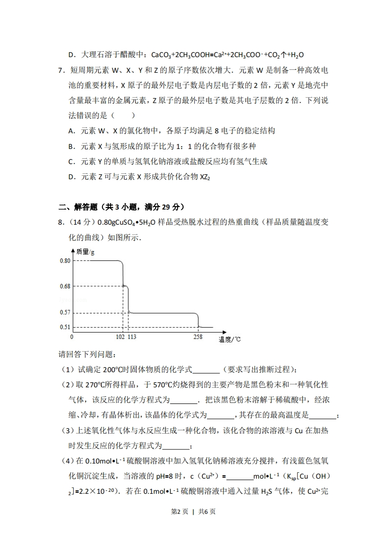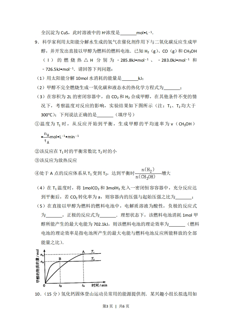 D.大理石溶于醋酸中:CaC03+2CH3C00H=Ca2+2CH3C00-+C02个+H2O7.短周期元素W、X、Y和Z的原子序数依次增大,元素W是制备一种高效电池的重要材料,X原子的最外层电子数是内层电子数的2倍,元素Y是地壳中含量最丰富的金属元素,Z原子的最外层电子数是其电子层数的2倍.下列说法错误的是()A.元素W、X的氯化物中,各原子均满足8电子的稳定结构B.元素X与氢形成的原子比为1:1的化合物有很多种C,元素Y的单质与氢氧化钠溶液或盐酸反应均有氢气生成D.元素Z可与元素X形成共价化合物Z二、解答题(共3小题,满分29分)8.(14分)0.80gCuS045H20样品受热脱水过程的热重曲线(样品质量随温度变化的曲线)如图所示.↑质里/g0.800.680.570.510102113258温度/℃请回答下列问题:(1)试确定200C时固体物质的化学式(要求写出推断过程):(2)取270C所得样品,于570℃灼烧得到的主要产物是黑色粉末和一种氧化性气体,该反应的化学方程式为·把该黑色粉末溶解于稀硫酸中,经浓缩、冷却,有晶体析出,该晶体的化学式为,其存在的最高温度是(3)上述氧化性气体与水反应生成一种化合物,该化合物的浓溶液与Cu在加热时发生反应的化学方程式为(4)在0.10molL1硫酸铜溶液中加入氢氧化钠稀溶液充分搅拌,有浅蓝色氢氧化铜沉淀生成,当溶液的pH=8时,c(Cu2)=mol-L-1 (Ksp[Cu (OH)2]=2.2×10-20).若在0.1molL-1硫酸铜溶液中通入过量H2S气体,使Cu2完第2页1共6页全沉淀为CuS,此时溶液中的H浓度是molL-1.9.科学家利用太阳能分解水生成的氢气在催化剂作用下与二氧化碳反应生成甲醇,并开发出直接以甲醇为燃料的燃料电池.已知H2(g)、C0(g)和CH3OH(〡)的燃烧热△H分别为-285.8kmo1、-283.0 kJ.mol1和-726.5 kJ.mol1.请回答下列问题:(1)用太阳能分解10mol水消耗的能量是kJ:(2)甲醇不完全燃烧生成一氧化碳和液态水的热化学方程式为(3)在容积为2L的密闭容器中,由C02和H2合成甲醇,在其他条件不变的情况下,考察温度对反应的影响,实验结果如下图所示(注:T1、T2均大于300℃):下列说法正确的是(填序号)①温度为T1时,从反应开始到平衡,生成甲醇的平均速率为V(CHOH)-nAmolL-1.min1tA②该反应在T1时的平衡常数比T2时的小③该反应为放热反应n(H2)④处于A点的反应体系从T1变到T2,达到平衡时一一增大(CHOH)(4)在T1温度时,将1molc02和3molH2充入一密闭恒容容器中,充分反应达到平衡后,若C02转化率为a,则容器内的压强与起始压强之比为(5)在直接以甲醇为燃料的燃料电池中,电解质溶液为酸性,负极的反应式为,正极的反应式为.理想状态下,该燃料电池消耗1mol甲醇所能产生的最大电能为702.1kJ,则该燃料电池的理论效率为(燃料电池的理论效率是指电池所产生的最大电能与燃料电池反应所能释放的全部能量之比)TnAB时间/min10.(15分)氢化钙固体登山运动员常用的能源提供剂.某兴趣小组长拟选用如第3页1共6页