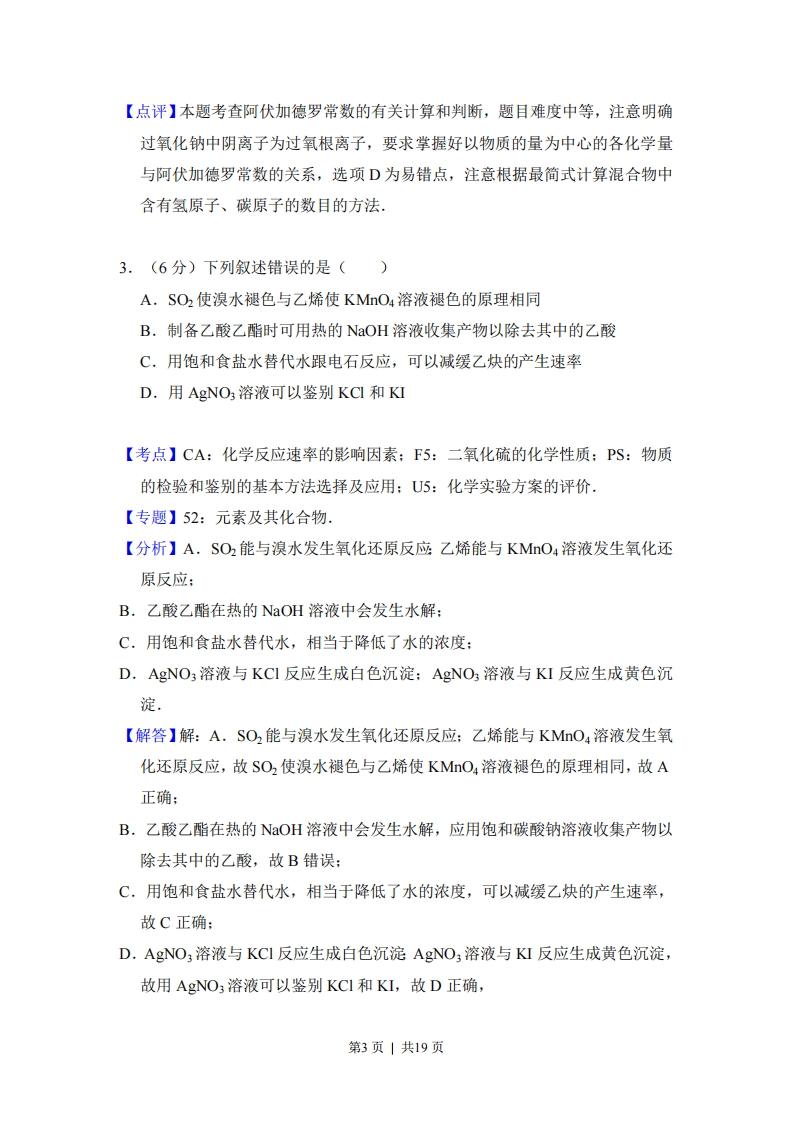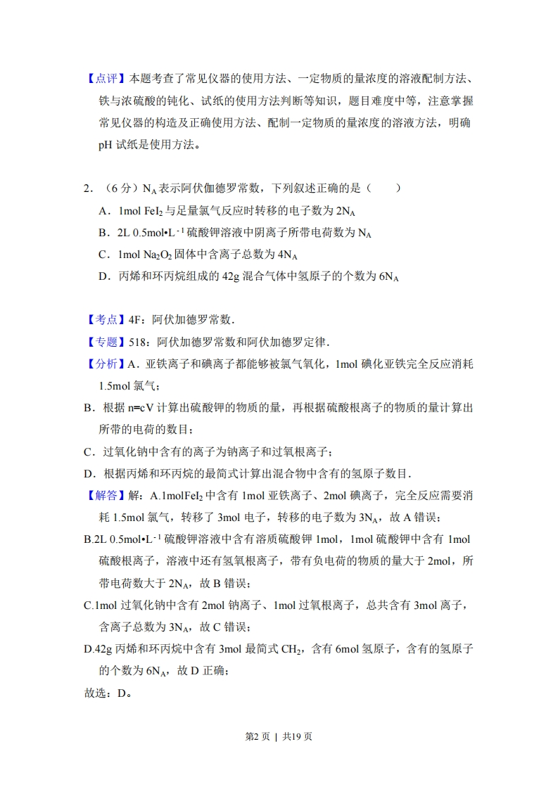 【点评】本题考查了常见仪器的使用方法、一定物质的量浓度的溶液配制方法、铁与浓硫酸的钝化、试纸的使用方法判断等知识,题目难度中等,注意掌握常见仪器的构造及正确使用方法、配制一定物质的量浓度的溶液方法,明确pH试纸是使用方法。2.(6分)NA表示阿伏伽德罗常数,下列叙述正确的是()A.1 mol Fe2与足量氯气反应时转移的电子数为2NAB.2L0.5molL1硫酸钾溶液中阴离子所带电荷数为NAC.1 mol Na2O2固体中含离子总数为4NAD.丙烯和环丙烷组成的42g混合气体中氢原子的个数为6NA【考点】4F:阿伏加德罗常数.【专题】518:阿伏加德罗常数和阿伏加德罗定律,【分析】A.亚铁离子和碘离子都能够被氯气氧化,1ol碘化亚铁完全反应消耗1.5mol氯气:B.根据=cV计算出硫酸钾的物质的量,再根据硫酸根离子的物质的量计算出所带的电荷的数目:C.过氧化钠中含有的离子为钠离子和过氧根离子:D.根据丙烯和环丙烷的最简式计算出混合物中含有的氢原子数目.【解答】解:A.1 molFel2中含有1mol亚铁离子、2mol碘离子,完全反应需要消耗1.5mol氯气,转移了3mol电子,转移的电子数为3NA,故A错误:B.2L0.5molL~1硫酸钾溶液中含有溶质硫酸钾1mol,1mol硫酸钾中含有1mol硫酸根离子,溶液中还有氢氧根离子,带有负电荷的物质的量大于2ol,所带电荷数大于2NA,故B错误:C.1mol过氧化钠中含有2mol钠离子、1mol过氧根离子,总共含有3mol离子,含离子总数为3NA,故C错误:D.42g丙烯和环丙烷中含有3mol最简式CH2,含有6mol氢原子,含有的氢原子的个数为6NA,故D正确:故选:D。第2页|共19页【点评】本题考查阿伏加德罗常数的有关计算和判断,题目难度中等,注意明确过氧化钠中阴离子为过氧根离子,要求掌握好以物质的量为中心的各化学量与阿伏加德罗常数的关系,选项D为易错点,注意根据最简式计算混合物中含有氢原子、碳原子的数目的方法.3.(6分)下列叙述错误的是()A.SO2使溴水褪色与乙烯使KMO4溶液褪色的原理相同B.制备乙酸乙酯时可用热的NaOH溶液收集产物以除去其中的乙酸C,用饱和食盐水替代水跟电石反应,可以减缓乙炔的产生速率D.用AgNO3溶液可以鉴别KCI和KI【考点】CA:化学反应速率的影响因素:F5:二氧化硫的化学性质:PS:物质的检验和鉴别的基本方法选择及应用;U5:化学实验方案的评价.【专题】52:元素及其化合物.【分析】A.SO2能与溴水发生氧化还原反应乙烯能与KMO4溶液发生氧化还原反应:B.乙酸乙酯在热的NaOH溶液中会发生水解:C.用饱和食盐水替代水,相当于降低了水的浓度:D.AgNO3溶液与KCI反应生成白色沉淀:AgNO3溶液与KI反应生成黄色沉淀。【解答】解:A.SO2能与溴水发生氧化还原反应:乙烯能与KMO4溶液发生氧化还原反应,故SO2使溴水褪色与乙烯使KMO4溶液褪色的原理相同,故A正确:B.乙酸乙酯在热的NOH溶液中会发生水解,应用饱和碳酸钠溶液收集产物以除去其中的乙酸,故B错误:C.用饱和食盐水替代水,相当于降低了水的浓度,可以减缓乙炔的产生速率,故C正确:D.AgNO3溶液与KCI反应生成白色沉淀AgNO3溶液与KI反应生成黄色沉淀,故用AgNO3溶液可以鉴别KCI和KI,故D正确,第3页|共19页