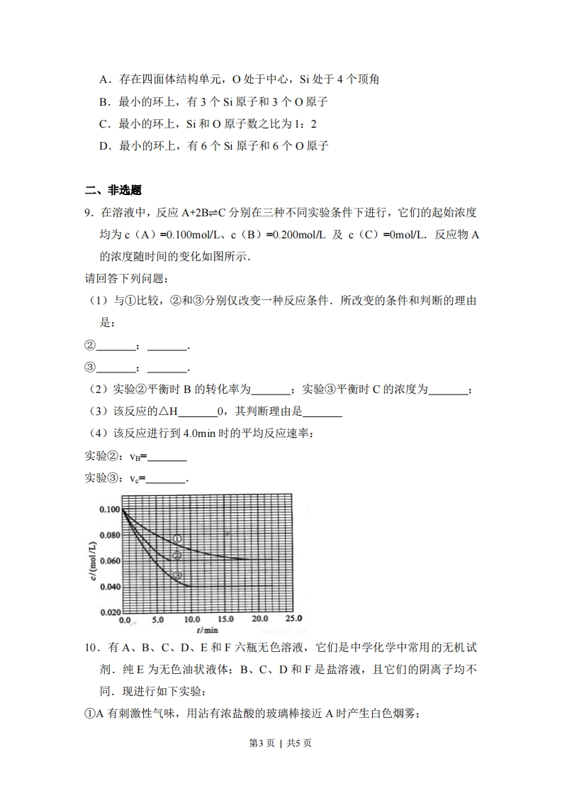 2010年全国统一高考化学试卷(全国卷I)一、选择题1.(3分)下列判断错误的是()A.熔点:SiN4>NaCl>Sil4B.沸点:NH3>PH3>AsHC.酸性:HCIO4>H2SO4>HPO4D.碱性:NaOH>Mg(OH)2>Al(OH)32.(3分)下列叙述正确的是()A,Li在氧气中燃烧主要生成Li2O2B.将CO2通入次氯酸钙溶液可生成次氯酸C.将SO2通入BaC2溶液可生成BaSO3沉淀D.将NH3通入热的CuSO4溶液中能使Cu还原成Cu3.(3分)能正确表示下列反应的离子方程式是()A.将铁粉加入稀硫酸中2Fe+6H一2Fe3+3H2↑B.将磁性氧化铁溶于盐酸FeO4+8H一3Fe3+4HOC.将氯化亚铁溶液和稀硝酸混合Fe2+4H+NO3一Fe3+2H2O+NO↑D.将铜屑加Fe3溶液中2Fe3+Cu一2Fe2+Cu24.(3分)下列叙述正确的是()A,某醋酸溶液的pH=a,将此溶液稀释1倍后,溶液的pH=b,则a>bB.在滴有酚酞溶液的氨水中,加入NHCI的溶液恰好无色,则此时溶液pH<7C.常温下,1.0×10-3molL盐酸的pH=3.0,1.0×10-8molL盐酸pH=8.0D.若1mLpH=1盐酸与10 OmLNaOH溶液混合后,溶液pH=7,则NaOH溶液的pH=115,(3分)如图是一种染料敏化太阳能电池的示意图。电池的一个电极由有机光敏燃料(S)涂覆在TO2纳米晶体表面制成,另一电极由导电玻璃镀铂构成,电池中发生的反应为:TO2/s→TO/S·(激发态)第1页|共5页