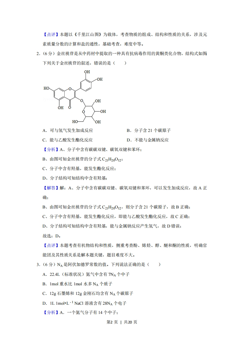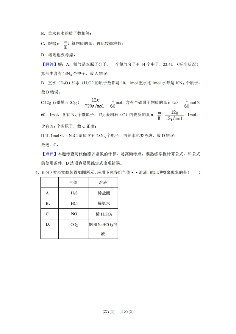 2020年全国统一高考化学试卷(新课标Ⅲ)◆考答案与试题解析一、选择题:本题共7小题,年小题6分,共42分。在每小题给出的四个选项中,只有一项是符合题目要求的。1.(6分)宋代《千里江山图)描绘了山清水秀的美丽景色,历经千年色彩依然,其中绿色来自孔雀石颜料(主要成分为Cu(OH)2CuCO3),青色来自蓝铜矿颜料(主要成分为Cu(OH)2·2CuCO3)。下列说法错误的是()A,保存《千里江山图》需控制温度和湿度B.孔雀石、蓝铜矿颜料不易被空气氧化C.孔雀石、蓝铜矿颜料耐酸耐碱D.Cu(OH2)CuCO3中铜的质量分数高于Cu(OH)·2CuCO3【分析】A.Cu(OH)2CuCO3和Cu(OH)2·2CuCO3均不稳定,受热易分解,纤维素或蛋白质均能水解:B.Cu(OH)2CuCO3和Cu(OH)22CuC03中除0元素外,C、H、Cu均为最高价:C.Cu(OH)2CuC03和Cu(OH)22CuC03均能与酸反应,不与碱反应:D.通过计算判断比较铜的质量分数大小。【解答】解:A.Cu(OH)2CuCO3和Cu(OH)2·2CuCO3均不稳定,受热易分解,纤维素或蛋白质均能水解,长期在潮湿环境中易腐烂变质,则保存《千里江山图》需控制温度和湿度,故A正确:B.Cu(OH)2CuCO3和Cu(OH)22CuCO3中除O元素外,C、H、Cu均为最高价,无还原性,不能被空气中氧气氧化,则孔雀石、蓝铜矿颜料不易被空气氧化,故B正确C.Cu(OH)2CuC03和Cu(OH)22CuC03均能与酸反应,不与碱反应,则孔雀石、蓝铜矿颜料耐碱不耐酸,故C错误:D.Cu(OH2)CuC03中铜的质量分数为128×100%,Cu(OH)2CuC03中铜的质量222分数为19×100%,则Cu(OH):CuC0,中铜的质量分数高于Cu(OH,)~2CuC0,346故D正确:故选:C。第1页|共20页B.重水和水的质子数相等:C.跟据n=计算物质的量,再比较微粒数:D.溶剂也要考虑。【解答】解:A.氮气是双原子分子,一个氮气分子有14个中子,22.4L(标准状况)氮气中含有14NA个中子,故A错误:B.重水(D20)和水(H20)的质子数都是10,1mol重水比1mol水都是10NA个质子,故B错误:C.12g石墨烯n(C60)=12g,=1mol,含有个碳原子物质的量n(c)=1mol×20g/mo1606060=1mol,含有NA个碳原子,12g金刚石(C)的物质的量n=四=,12g=1mol,M12g/mo1含有NA个碳原子,故C正确:D.1 L 1mol-L-1 NaCl溶质含有28NA个电子,溶剂水也要考虑,故D错误:故选:C。【点评】本题考查阿伏伽德罗常数的计算,是高频考点,要熟练掌握计算公式,和公式的使用条件,D选项容易思维定式出现错误。4.6分)喷泉实验装置如图所示。应用下列各组气体·~溶液,能出现喷泉现象的是()气体溶液A.H2S稀盐酸B.HCI稀氨水C.NO稀H2SO4D.C02饱和NaHCO3溶液第3页|共20页