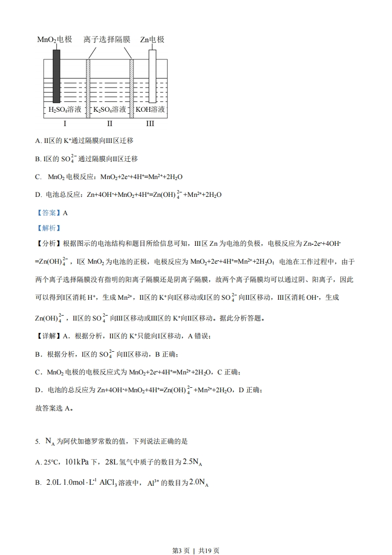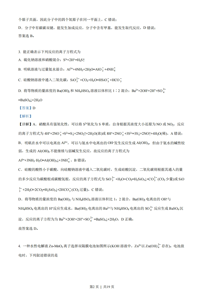 一、选择题1.化学与生活密切相关。下列叙述正确的是A.漂白粉与盐酸可混合使用以提高消毒效果B.温室气体是形成酸雨的主要物质C.棉花、麻和蚕丝均为碳水化合物D.干冰可用在舞台上制造“云雾”【答案】D【解析】【详解】A.漂白粉的有效成分次氯酸钙与盐酸混合,会发生氧化还原反应生成有毒的氯气,两者不能混合使用,A错误:B.温室气体主要是指二氧化碳,二氧化碳不是形成酸雨的主要物质,形成酸雨的主要物质是硫氧化物、氮氧化物等,B错误:C.棉花、麻来源于植物,主要成分均是纤维素,为碳水化合物,但蚕丝来源于动物,主要成分是蛋白质,蛋白质不是碳水化合物,C错误:D.干冰是固态的二氧化碳,干冰升华时,吸收大量的热,使周围温度降低,大量的水蒸气凝结成了小液滴,形成“云雾”效果,D正确:答案选D。2.辅酶Q10具有预防动脉硬化的功效,其结构简式如下。下列有关辅酶Q1。的说法正确的是A.分子式为C0Ho0B.分子中含有14个甲基C.分子中的四个氧原子不在同一平面D.可发生加成反应,不能发生取代反应【答案】B【解析】【详解】A.由该物质的结构简式可知,其分子式为CsH0O4,A错误:B.由该物质的结构简式可知,键线式端点代表甲基,10个重复基团的最后一个连接H原子的碳是甲基,故分子中含有1+1+1+10+1=14个甲基,B正确:C.双键碳以及与其相连的四个原子共面,羰基碳采取$p杂化,羰基碳原子和与其相连的氧原子及另外两第1页」共19页个原子共面,因此分子中的四个氧原子在同一平面上,C错误:D.分子中有碳碳双键,能发生加成反应,分子中含有甲基,能发生取代反应,D错误:答案选B。3.能正确表示下列反应的离子方程式为A.硫化钠溶液和硝酸混合:S2+2H+=HS↑B.明矾溶液与过量氨水湿合:AI3+4NH3+2H2O=AIO;+4NHC.硅酸钠溶液中通入二氧化碳:SiO3+C02+H2O=HSiO3+HC03D.将等物质的量浓度的BaOh和NH.HSO,溶液以体积比1:2混合:Ba2+2OH+2H+SO=BaSO4l+2H20【答案】D【解析】【详解】A.硝酸具有强氧化性,可以将S2氧化为S单质,自身根据其浓度大小还原为NO或NO2,反应的离子方程式为4H+2NO3+S2=S1+2NO2↑+2H2O(浓)或8Ht+2NO;+3S2=3S1+2NO↑+4Hz0(稀),A错误B.明矾在水中可以电离出AI3+,可以与氨水中电离出的OH发生反应生成AI(OH3,但由于氨水的碱性较弱,生成的A(OH不能继续与弱碱发生反应,故反应的离子方程式为A+3NH3HO=A(OHD3+3NH4,B错误:C.硅酸的酸性小于碳酸,向硅酸钠溶液中通入二氧化碳时,生成硅酸沉淀,二氧化碳则根据其通入的量的多少反应为碳酸根或碳酸氢根,反应的离子方程式为Si0+H20+C0,=H2SiO3+C0(C02少量)或SiO号+2H,0+2C0=HSi03+2HC03(C02过量),C错误:D.将等物质的量浓度的Ba(OH2与NHHSO,溶液以体积比I:2混合,Ba(OHh电离出的OH与NHHSO4电离出的H反应生成水,Ba(OH2电离出的Ba2+与NHHSO4电离出的SO反应生成BaSO4沉淀,反应的离子方程为为Ba2+20H+2H+S0}=BaS04+2H20,D正确:故答案选D。4.一种水性电解液Zn-MO2离子选择双隔膜电池如图所示(KOH溶液中,Zn2+以Zn(OH):存在)。电池放电时,下列叙述错误的是第2页」共19页