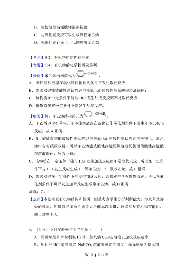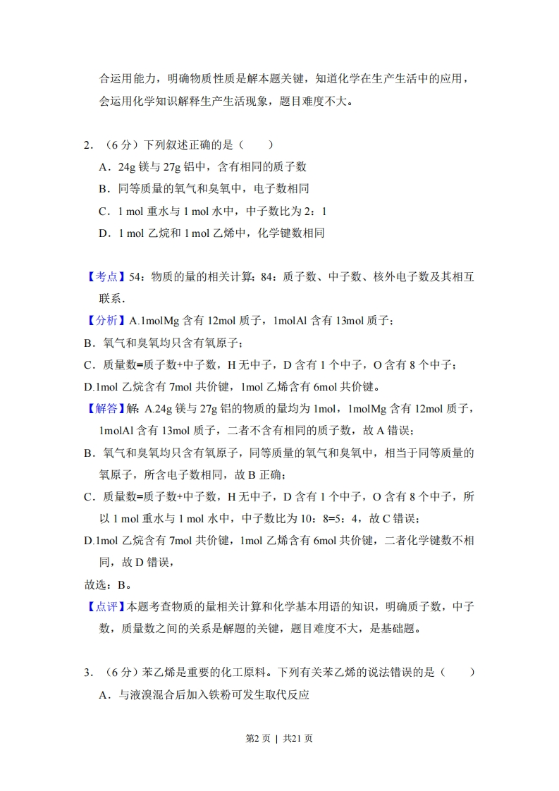 2018年全国统一高考化学试卷(新课标)考答来与试题解折一、选择题1.(6分)化学与生活密切相关。下列说法错误的是()A.泡沫灭火器可用于一般的起火,也适用于电器起火B.疫苗一般应冷藏存放,以避免蛋白质变性C.家庭装修时用水性漆替代传统的油性漆,有利于健康及环境D.电热水器用镁棒防止内胆腐蚀,原理是牺牲阳极的阴极保护法【考点】14:物质的组成、结构和性质的关系,【分析】A.泡沫灭火器喷出的泡沫中含有大量水分会导致产生导电:B.蛋白质在温度较高时易变性:C.水溶性漆是以水作稀释剂、不含有机溶剂的涂料,不含苯、甲苯等有机物,油性油漆是以有机物为稀释剂且含苯、甲苯等物质:D.Mg比Fe活泼,当发生化学腐蚀时Mg作负极。【解答】解:A,泡沫灭火器喷出的泡沫中含有大量水分,水会导致产生导电,从而易产生触电危险,故A错误:B.蛋白质在温度较高时易变性,疫苗为蛋白质,为了防止蛋白质变性,所以一般应该冷藏存放,故B正确:C.水溶性漆是以水作稀释剂、不含有机溶剂的涂料,不含苯、甲苯等有机物,油性油漆是以有机物为稀释剂且含苯、甲苯等物质,苯、甲苯等有机物污染环境,所以家庭装修时用水性漆替代传统的油性漆,有利于健康及环境,故C正确:D.Mg比Fe活泼,当发生化学腐蚀时Mg作负极而被腐蚀,从而阻止Fe被腐蚀,属于牺牲阳极的阴极保护法,故D正确:故选:A。【点评】本题考查物质组成、结构和性质关系,侧重考查学生分析判断及知识综第1页|共21页合运用能力,明确物质性质是解本题关键,知道化学在生产生活中的应用,会运用化学知识解释生产生活现象,题目难度不大。2.(6分)下列叙述正确的是()A,24g镁与27g铝中,含有相同的质子数B.同等质量的氧气和臭氧中,电子数相同C.1mol重水与1mol水中,中子数比为2:1D.1mol乙烷和1mol乙烯中,化学键数相同【考点】54:物质的量的相关计算:84:质子数、中子数、核外电子数及其相互联系【分析】A.1 molMg含有12mol质子,1 molAl含有13mol质子:B.氧气和臭氧均只含有氧原子:C.质量数=质子数+中子数,H无中子,D含有1个中子,O含有8个中子:D.1mol乙烷含有7mol共价键,1mol乙烯含有6mol共价键。【解答】解A24g镁与27g铝的物质的量均为1mol,1 molMg含有12mol质子,1molA1含有13mol质子,二者不含有相同的质子数,故A错误:B.氧气和臭氧均只含有氧原子,同等质量的氧气和臭氧中,相当于同等质量的氧原子,所含电子数相同,故B正确:C.质量数=质子数+中子数,H无中子,D含有1个中子,O含有8个中子,所以1mol重水与1mol水中,中子数比为10:8=5:4,故C错误:D.1mol乙烷含有7mol共价键,1mol乙烯含有6mol共价键,二者化学键数不相同,故D错误,故选:B。【点评】本题考查物质的量相关计算和化学基本用语的知识,明确质子数,中子数,质量数之间的关系是解题的关键,题目难度不大,是基础题。3.(6分)苯乙烯是重要的化工原料。下列有关苯乙烯的说法错误的是()A.与液溴混合后加入铁粉可发生取代反应第2页|共21页