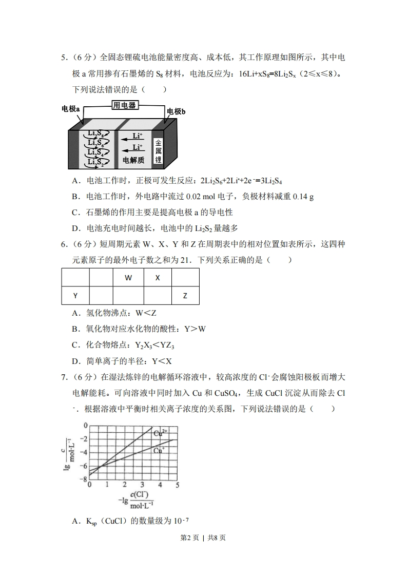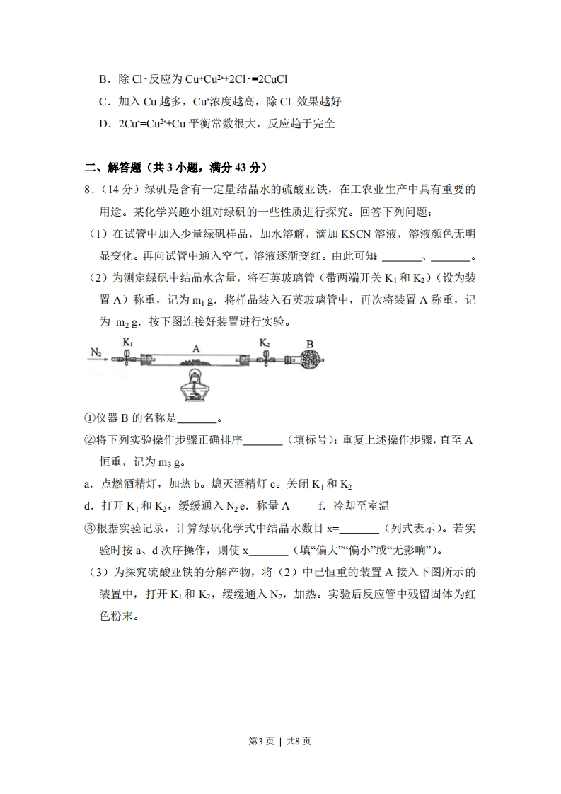 2017年全国统一高考化学试卷(新课标Ⅱ)一、选择题:本题共7个小题,每小题6分,共42分。在每小题给出的四个选项中,只有一项是符合题目要求的.1.(6分)化学与生活密切相关。下列说法错误的是()A.PM2.5是指粒径不大于2.5um的可吸入悬浮颗粒物B.绿色化学要求从源头上消除或减少生产活动对环境的污染C.燃煤中加入CO可以减少酸雨的形成及温室气体的排放D.天然气和液化石油气是我国目前推广使用的清洁燃料2.(6分)下列说法正确的是()A.植物油氢化过程中发生了加成反应B.淀粉和纤维素互为同分异构体C.环己烷与苯可用酸性KMnO4溶液鉴别D.水可以用来分离溴苯和苯的混合物3.(6分)下列实验操作规范且能达到目的是()目的操作A.取20.00mL盐酸在50mL酸式滴定管中装入盐酸,调整初始读数为30.00mL后,将剩余盐酸放入锥形瓶B.清洗碘升华实验所用试管先用酒精清洗,再用水清洗C.测定醋酸钠溶液pH用玻璃棒蘸取溶液,点在湿润的p州试纸上D.配制浓度为0.010mol/L称取KMn04固体0.158g,放入100mL容量瓶中,的KMnO4溶液加水溶解并稀释至刻度A.AB.BC.CD.D4.(6分)NA为阿伏加德罗常数的值.下列说法正确的是()A.0.1mol的B中,含有0.6NA个中子B.pH=1的HPO4溶液中,含有0.1NA个HC.2.24L(标准状况)苯在O2中完全燃烧,得到0.6NA个C02分子D.密闭容器中1 mol PCl3与1molC2反应制备PCl5(g),增加2Na个P-CI键第1页|共8页B.除C1-反应为CuCu2+2C1=2CuCIC.加入Cu越多,Cu浓度越高,除C效果越好D.2Cu=Cu2+Cu平衡常数很大,反应趋于完全二、解答题(共3小题,满分43分)8.,(14分)绿矾是含有一定量结晶水的硫酸亚铁,在工农业生产中具有重要的用途。某化学兴趣小组对绿矾的一些性质进行探究。回答下列问题:(1)在试管中加入少量绿矾样品,加水溶解,滴加KSCN溶液,溶液颜色无明显变化。再向试管中通入空气,溶液逐渐变红。由此可知(2)为测定绿矾中结晶水含量,将石英玻璃管(带两端开关K,和K2)(设为装置A)称重,记为m1g.将样品装入石英玻璃管中,再次将装置A称重,记为m2g.按下图连接好装置进行实验。K①仪器B的名称是②将下列实验操作步骤正确排序(填标号):重复上述操作步骤,直至A恒重,记为m3ga.点燃酒精灯,加热b。熄灭酒精灯c。关闭K1和K2d.打开K,和K2,缓缓通入N2e.称量A£.冷却至室温③根据实验记录,计算绿矾化学式中结晶水数目x=(列式表示)。若实验时按a、d次序操作,则使x(填“偏大偏小”或“无影响”)。(3)为探究硫酸亚铁的分解产物,将(2)中已恒重的装置A接入下图所示的装置中,打开K1和K2,缓缓通入N2,加热。实验后反应管中残留固体为红色粉末。第3页|共8页