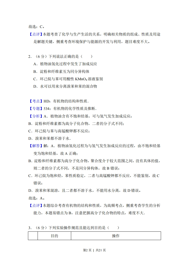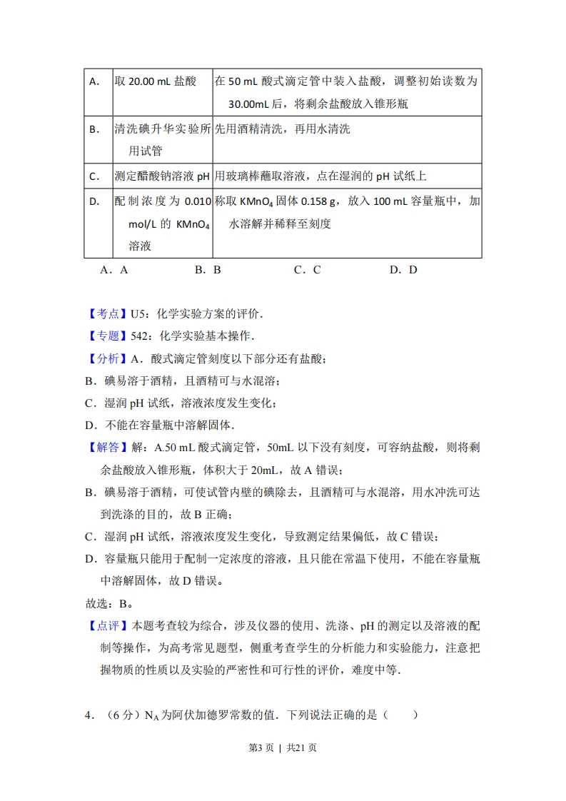 2017年全国统一高考化学试卷(新课标Ⅲ)事考答来与试想解析一、选择题:本题共7个小题,每小题6分,共42分,在每小题给出的四个选项中,只有一项是符合题目要求的,1.(6分)化学与生活密切相关。下列说法错误的是()A.PM2.5是指粒径不大于2.5um的可吸入悬浮颗粒物B,绿色化学要求从源头上消除或减少生产活动对环境的污染C.燃煤中加入CO可以减少酸雨的形成及温室气体的排放D.天然气和液化石油气是我国目前推广使用的清洁燃料【考点】F7:常见的生活环境的污染及治理.【专题】56:化学应用.【分析】A.PM2.5是直径等于或小于2.5um的悬浮颗粒物:B.绿色化学是从源头上消除或减少污染物的使用:C.二氧化碳的排放量不会减少:D.天然气和液化石油气的燃烧产物无污染。【解答】解:A.PM2.5是指空气中直径等于或小于2.5um的悬浮颗粒物,它能较长时间悬浮于空气中,其在空气中含量浓度越高,就代表空气污染越严重,故A正确:B.绿色化学的核心是利用化学原理从源头上消除或减少生产生活对环境的污染,而不能污染后再治理,故B正确:C.加入氧化钙可与煤燃烧生成的二氧化硫在氧气中发生反应生成硫酸钙,二氧化硫排放量减少,但在高温下反应仍然生成二氧化碳,即燃煤中加入CO后可减少酸雨的发生,但不能减少温室气体的排放量,故C错误:D.天然气(CNG)主要成分是甲烷,液化石油气(LPG)的成分是丙烷、丁烷等,这些碳氢化合物完全燃烧生成二氧化碳和水,则这两类燃料是清洁燃料,故D正确:第1页|共21页故选:C。【点评】本题考查了化学与生产生活的关系,明确相关物质的组成、性质及用途是解题关键,侧重考查环境保护与能源的开发与利用,题目难度不大。2.(6分)下列说法正确的是()A.植物油氢化过程中发生了加成反应B.淀粉和纤维素互为同分异构体C.环己烷与苯可用酸性KMnO4溶液鉴别D.水可以用来分离溴苯和苯的混合物【考点】HD:有机物的结构和性质.【专题】534:有机物的化学性质及推断.【分析】A.植物油含有不饱和烃基,可与氢气发生加成反应:B.淀粉和纤维素都为高分子化合物,二者的分子式不同:C.环己烷与苯与高锰酸钾都不反应:D.溴苯和苯都不溶于水,【解答】解:A.植物油氢化过程为与氢气发生加成反应的过程,由不饱和烃基变为饱和烃基,故A正确:B.淀粉和纤维素都为高分子化合物,聚合度介于较大范围之间,没有具体的值,则二者的分子式不同,不是同分异构体,故B错误:C.环己烷为饱和烃,苯性质稳定,二者与高锰酸钾都不反应,不能鉴别,故C错误;D.溴苯和苯混溶,且二者都不溶于水,不能用水分离,故D错误。故选:A。【点评】本题综合考查有机物的结构和性质,为高频考点,侧重考查学生的分析能力,本题易错点为B,注意把握高分子化合物的特点,难度不大,3.(6分)下列实验操作规范且能达到目的是()目的操作第2页|共21页A取20.00mL盐酸在50mL酸式滴定管中装入盐酸,调整初始读数为30.00mL后,将剩余盐酸放入锥形瓶B.清洗碘升华实验所先用酒精清洗,再用水清洗用试管C.测定醋酸钠溶液pH用玻璃棒蘸取溶液,点在湿润的pH试纸上0配制浓度为0.010称取KMn04固体0.158g,放入100mL容量瓶中,加mol/L的KMno4水溶解并稀释至刻度溶液A.AB.BC.CD.D【考点】U5:化学实验方案的评价.【专题】542:化学实验基本操作.【分析】A.酸式滴定管刻度以下部分还有盐酸:B.碘易溶于酒精,且酒精可与水混溶:C.湿润pH试纸,溶液浓度发生变化:D.不能在容量瓶中溶解固体,【解答】解:A.50mL酸式滴定管,50mL以下没有刻度,可容纳盐酸,则将剩余盐酸放入锥形瓶,体积大于20mL,故A错误:B,碘易溶于酒精,可使试管内壁的碘除去,且酒精可与水混溶,用水冲洗可达到洗涤的目的,故B正确:C.湿润pH试纸,溶液浓度发生变化,导致测定结果偏低,故C错误:D.容量瓶只能用于配制一定浓度的溶液,且只能在常温下使用,不能在容量瓶中溶解固体,故D错误。故选:B。【点评】本题考查较为综合,涉及仪器的使用、洗涤、pH的测定以及溶液的配制等操作,为高考常见题型,侧重考查学生的分析能力和实验能力,注意把握物质的性质以及实验的严密性和可行性的评价,难度中等,4.(6分)NA为阿伏加德罗常数的值.下列说法正确的是()第3页|共21页