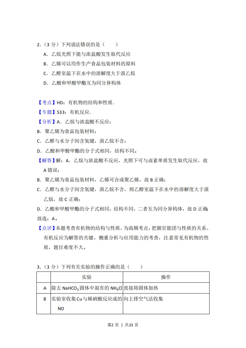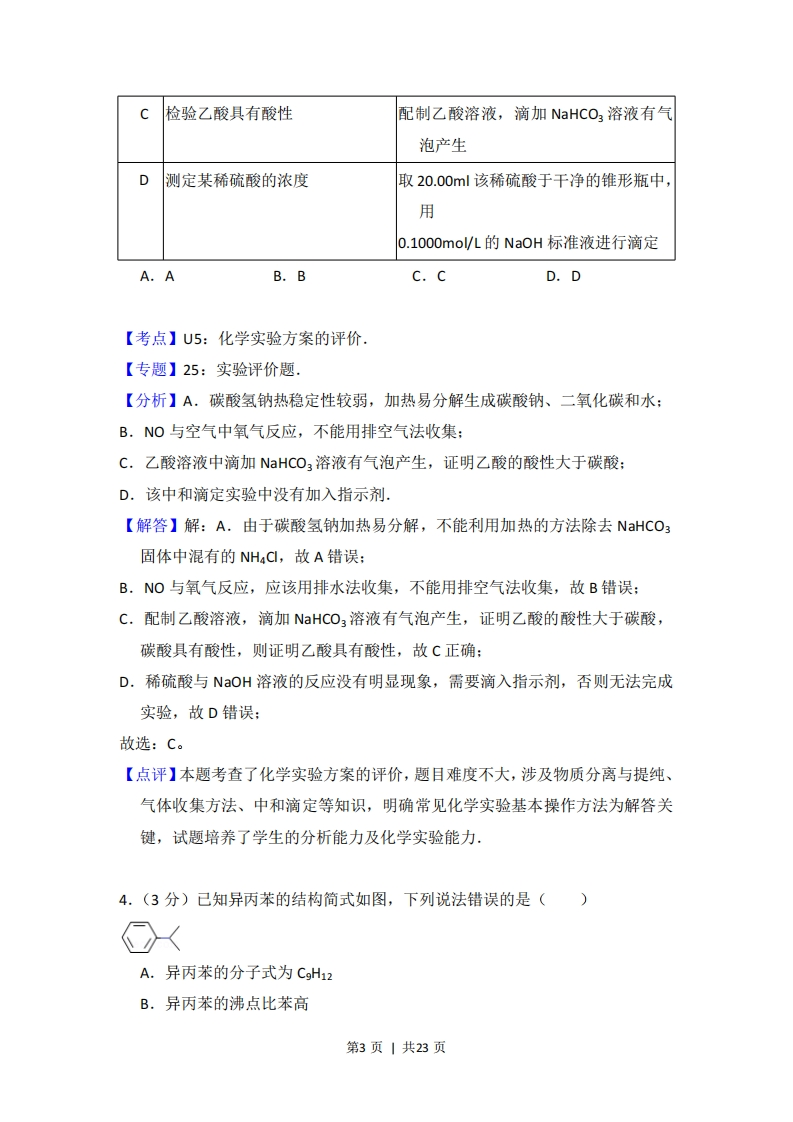 2016年全国统一高考化学试卷(新课标Ⅲ)事考答来与试想解析一、选择题,1.(3分)化学在生活中有着广泛的应用,下列对应关系错误的是(选项化学性质实际应用ACIO2具有强氧化性自来水消毒杀菌BS02具有还原性用作漂白剂NaHCO3受热易分解并且生成气体焙制糕点DAI(OH)3分解吸收大量热量并有H2O阻燃剂生成A.AB.BC.CD.D【考点】EM:氯、溴、碘及其化合物的综合应用:F5:二氧化硫的化学性质:GF:钠的重要化合物:GK:镁、铝的重要化合物.【专题】52:元素及其化合物.【分析】A.具有强氧化性,可用于杀菌消毒:B.做漂白剂与漂白性有关:C.NaHCO3不稳定,与酸反应生成二氧化碳气体:D.氢氧化铝分解吸收热量。【解答】解:A.CO2具有强氧化性,可使蛋白质变性,可用于杀菌消毒,故A正确:B.做漂白剂与漂白性有关,与还原性无关,故B错误:C.NHCO3不稳定,与酸反应生成二氧化碳气体,可用于焙制糕点,故C正确:D.氢氧化铝分解吸收热量,可用于阻燃剂,故D正确。故选:B。【点评】本题考查物质的性质与应用,为高考常见题型和高频考点,侧重考查学生的双基的掌握,有利于培养学生良好的科学素养,难度不大。第1页|共23页2.(3分)下列说法错误的是()A.乙烷光照下能与浓盐酸发生取代反应B.乙烯可以用作生产食品包装材料的原料C.乙醇室温下在水中的溶解度大于溴乙烷D.乙酸和甲酸甲酯互为同分异构体【考点】HD:有机物的结构和性质.【专题】533:有机反应.【分析】A,乙烷与浓盐酸不反应:B.聚乙烯为食品包装材料:C.乙醇与水分子间含氢键,溴乙烷不含:D.乙酸和甲酸甲酯的分子式相同,结构不同。【解答】解:A.乙烷与浓盐酸不反应,光照下可与卤素单质发生取代反应,故A错误;B.聚乙烯为食品包装材料,乙烯可合成聚乙烯,故B正确:C,乙醇与水分子间含氢键,溴乙烷不含,则乙醇室温下在水中的溶解度大于溴乙烷,故C正确:D.乙酸和甲酸甲酯的分子式相同,结构不同,二者互为同分异构体,故D正确故选:A。【点评】本题考查有机物的结构与性质,为高频考点,把握官能团与性质的关系、有机反应为解答的关键,侧重分析与应用能力的考查,注意常见有机物的性质,题目难度不大。3.(3分)下列有关实验的操作正确的是()实验操作A除去NaHCO3固体中混有的NH,C直接将固体加热&实验室收集Cu与稀硝酸反应成的向上排空气法收集NO第2页|共23页检验乙酸具有酸性配制乙酸溶液,滴加NaHCO3溶液有气泡产生0测定某稀硫酸的浓度取20.00ml该稀硫酸于千净的锥形瓶中,用0.1000mol/L的Na0H标准液进行滴定A.AB.BC.CD.D【考点】U5:化学实验方案的评价.【专题】25:实验评价题.【分析】A.碳酸氢钠热稳定性较弱,加热易分解生成碳酸钠、二氧化碳和水:B.NO与空气中氧气反应,不能用排空气法收集:C.乙酸溶液中滴加NaHCO3溶液有气泡产生,证明乙酸的酸性大于碳酸:D.该中和滴定实验中没有加入指示剂,【解答】解:A.由于碳酸氢钠加热易分解,不能利用加热的方法除去NaHCO3固体中混有的NH4CI,故A错误:B.NO与氧气反应,应该用排水法收集,不能用排空气法收集,故B错误:C.配制乙酸溶液,滴加NHC03溶液有气泡产生,证明乙酸的酸性大于碳酸,碳酸具有酸性,则证明乙酸具有酸性,故C正确:D.稀硫酸与NaOH溶液的反应没有明显现象,需要滴入指示剂,否则无法完成实验,故D错误:故选:C。【点评】本题考查了化学实验方案的评价,题目难度不大,涉及物质分离与提纯、气体收集方法、中和滴定等知识,明确常见化学实验基本操作方法为解答关键,试题培养了学生的分析能力及化学实验能力,4.(3分)已知异丙苯的结构简式如图,下列说法错误的是()OXA.异丙苯的分子式为CgH12B.异丙苯的沸点比苯高第3页|共23页
