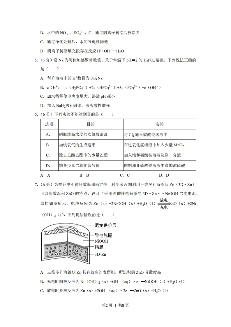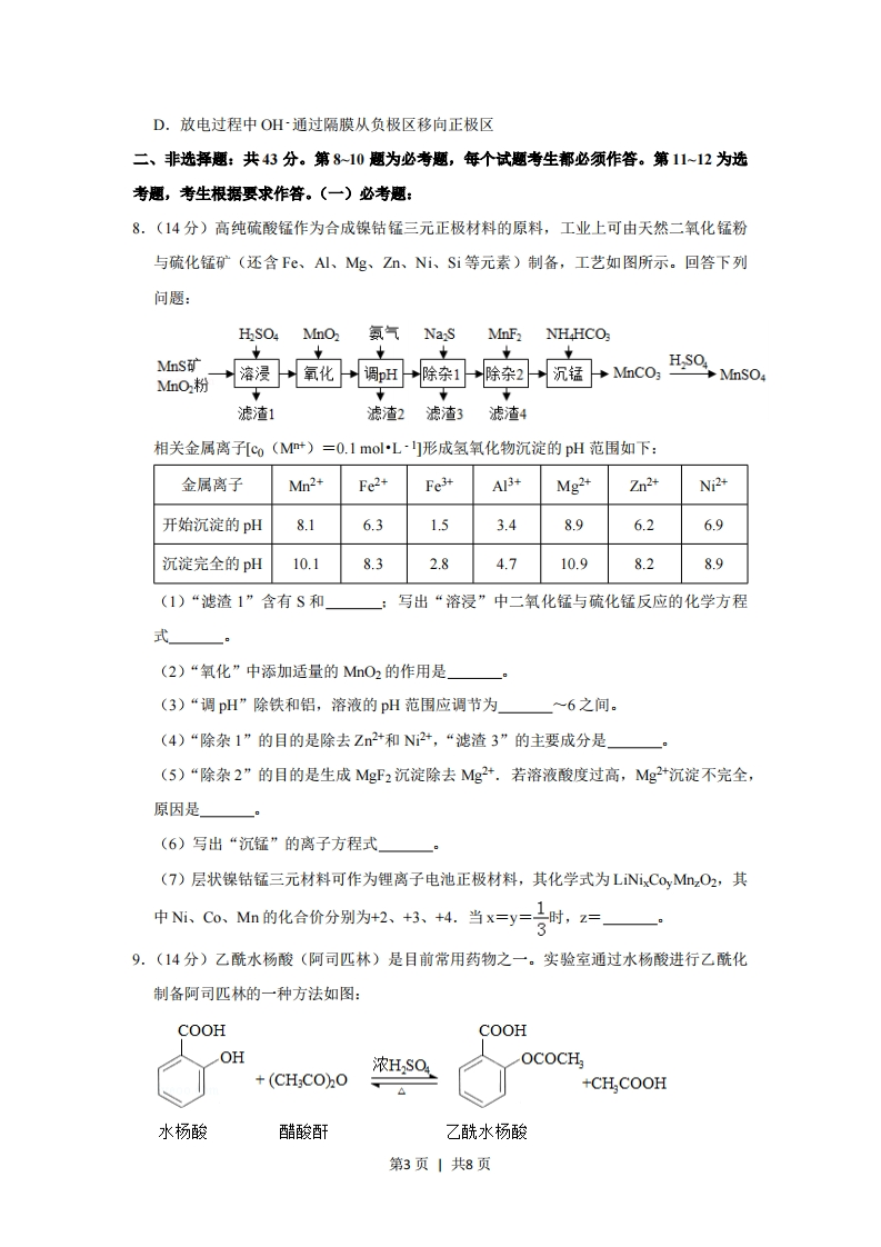 2019年全国统一高考化学试卷(新课标Ⅲ)一、选择题:本题共7个小题,每小题6分。共42分。在每小题给出的四个选项中,只有一项是符合题目要求的。1.(6分)化学与生活密切相关。下列叙述错误的是()A.高纯硅可用于制作光感电池B.铝合金大量用于高铁建设C.活性炭具有除异味和杀菌作用D.碘酒可用于皮肤外用消毒2.(6分)下列化合物的分子中,所有原子可能共平面的是()A.甲苯B.乙烷C.丙炔D.1,3-丁二烯3.(6分)X、Y、Z均为短周期主族元素,它们原子的最外层电子数之和是10.X与Z同族,Y最外层电子数等于X次外层电子数,且Y原子半径大于Z.下列叙述正确的是()A.熔点:X的氧化物比Y的氧化物高B.热稳定性:X的氢化物大于Z的氢化物C.X与Z可形成离子化合物ZXD.Y的单质与Z的单质均能溶于浓硝酸4.(6分)离子交换法净化水过程如图所示。下列说法中错误的是()Ca Na',MgNO;,CI,SO阳离子阳离子交换交换树脂H阴离子NO,CI',SO交换树脂阴离子交换H2OA.经过阳离子交换树脂后,水中阳离子的总数不变第1页1共8页D.放电过程中OH通过隔膜从负极区移向正极区二、非选择题:共43分。第8~10题为必考题,每个试题考生都必须作答。第11~12为选考题,考生根据要求作答。(一)必寿题:8.(14分)高纯硫酸锰作为合成镍钴锰三元正极材料的原料,工业上可由天然二氧化锰粉与硫化锰矿(还含Fe、Al、Mg、Zn、Ni、Si等元素)制备,工艺如图所示。回答下列问题:HSOMnO,氨气NaSMnF,NH HCO:Mns矿氧化调pH→除杂1→除杂2→沉话→MhCOH.SO,溶浸MnSOMmO粉滤渣1滤渣2滤渣3滤渣4相关金属离子c(M时)=0.1molL]形成氢氧化物沉淀的pH范围如下:金属离子Mn2+Fe2+Fe3+A3+Mg2+Zn2+N72+开始沉淀的pH8.16.31.53.48.96.26.9沉淀完全的pH10.18.32.84.710.98.28.9(1)“滤渣1”含有S和写出“溶浸”中二氧化锰与硫化锰反应的化学方程式(2)“氧化”中添加适量的MnO2的作用是(3)“调pH”除铁和铝,溶液的pH范围应调节为~6之间。(4)“除杂1”的目的是除去Zn2+和N2+,“滤渣3”的主要成分是(5)“除杂2”的目的是生成MgF2沉淀除去Mg+.若溶液酸度过高,Mg+沉淀不完全,原因是(6)写出“沉锰”的离子方程式」(7)层状镍钴锰三元材料可作为锂离子电池正极材料,其化学式为LiNixCoy Mn2O2,其中Ni,C0、Mn的化合价分别为2、+3、4.当x=y=号时2=—9.(14分)乙酰水杨酸(阿司匹林)是目前常用药物之一。实验室通过水杨酸进行乙酰化制备阿司匹林的一种方法如图:COOHCOOHOH浓HSOOCOCH+(CH;CO)O+CH COOH水杨酸醋酸酐乙酰水杨酸第3页1共8页