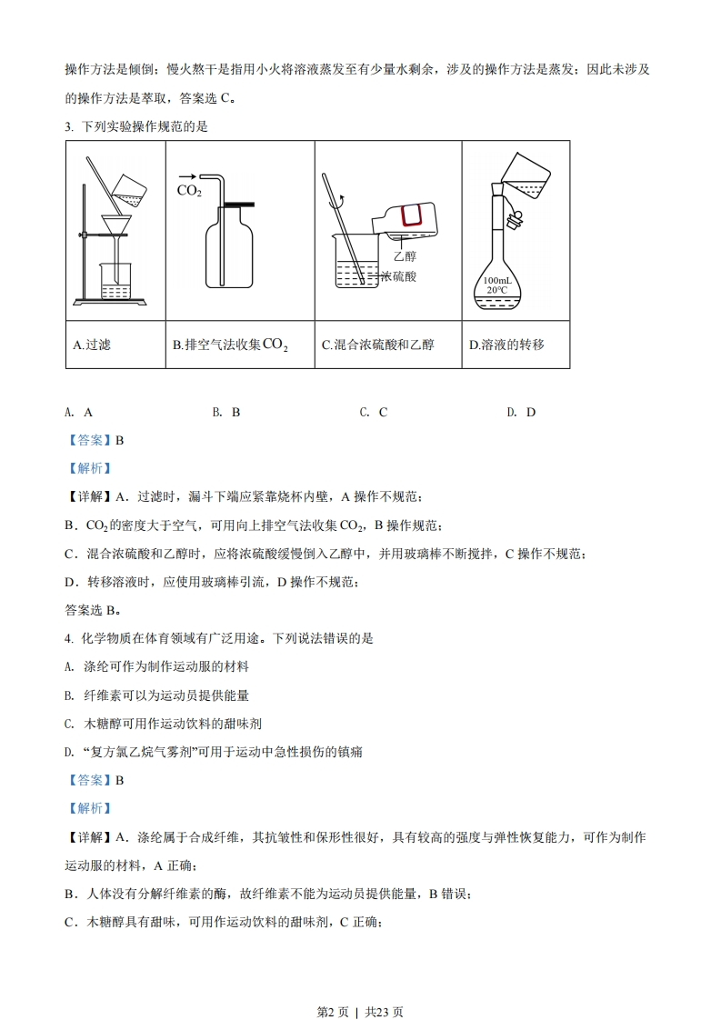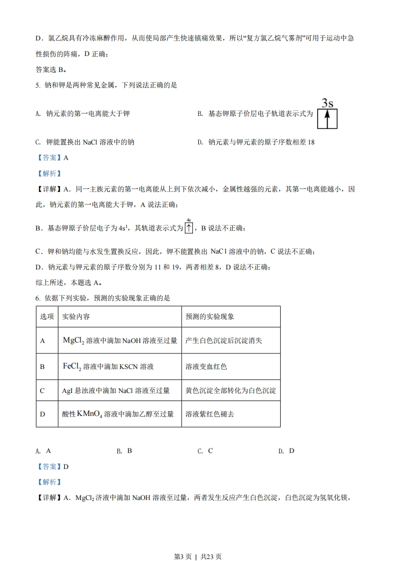 海南省2022年普通高中学业水平选择性考试化学试题注意事项:1答卷前,考生务必将自己的姓名、准考证号填写在答题卡上。2.回答选择题时,选出每小题答案后,用铅笔把答题卡上对应题目的答案标号涂黑。如需改动,用橡皮擦干净后,再选涂其他答案标号,回答非选择题时,将答案写在答题卡上,写在本试卷上无效。3.考试结束后,将本试卷和答题卡一并交回。可能用到的相对原子质量:H1C12N14016P31Fe56一、选择题:本题共8小题,每小题2分,共16分。在每小题给出的四个选项中,只有一项是符合题目要求的。1.化学与日常生活息息相关。下列说法错误的是A.使用含氟牙膏能预防龋齿B.小苏打的主要成分是Na,COC.可用食醋除去水垢中的碳酸钙D.使用食品添加剂不应降低食品本身营养价值【答案】B【解析】【详解】A.人体缺氟会导致龋齿,因此使用含氟牙膏可预防幅齿,A正确:B.小苏打的主要成分是NaHCO3,B错误:C.食醋的主要成分为CHCOOH,可与碳酸钙反应生成可溶的醋酸钙、二氧化碳和水,因此食醋可除去水垢中的碳酸钙,C正确:D.食品添加剂加入到食品中的目的是为改善食品品质和色、香、味以及为防腐、保鲜和加工工艺的需要,所以合理使用有助于改善食品品质、丰富食品营养成分,不应降低食品本身营养价值,D正确:答案选B。2.《医学入门》中记载我国传统中医提纯铜绿的方法:“水洗净,细研水飞,去石澄清,慢火熬干,”其中未涉及的操作是A.洗涤B.粉碎C.萃取D.蒸发【答案】C【解析】【详解】水洗净是指洗去固体表面的可溶性污渍、泥沙等,涉及的操作方法是洗涤:细研水飞是指将固体研成粉末后加水溶解,涉及的操作方法是溶解:去石澄清是指倾倒出澄清液,去除未溶解的固体,涉及的第1页」共23页
