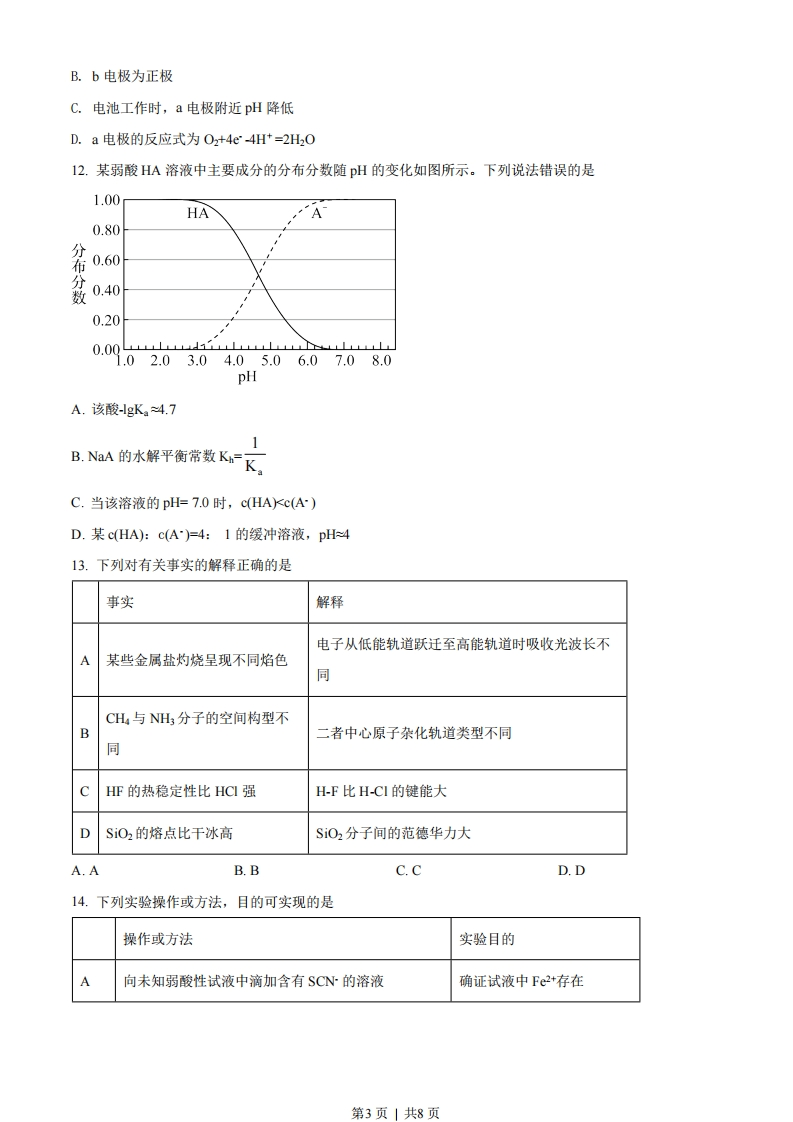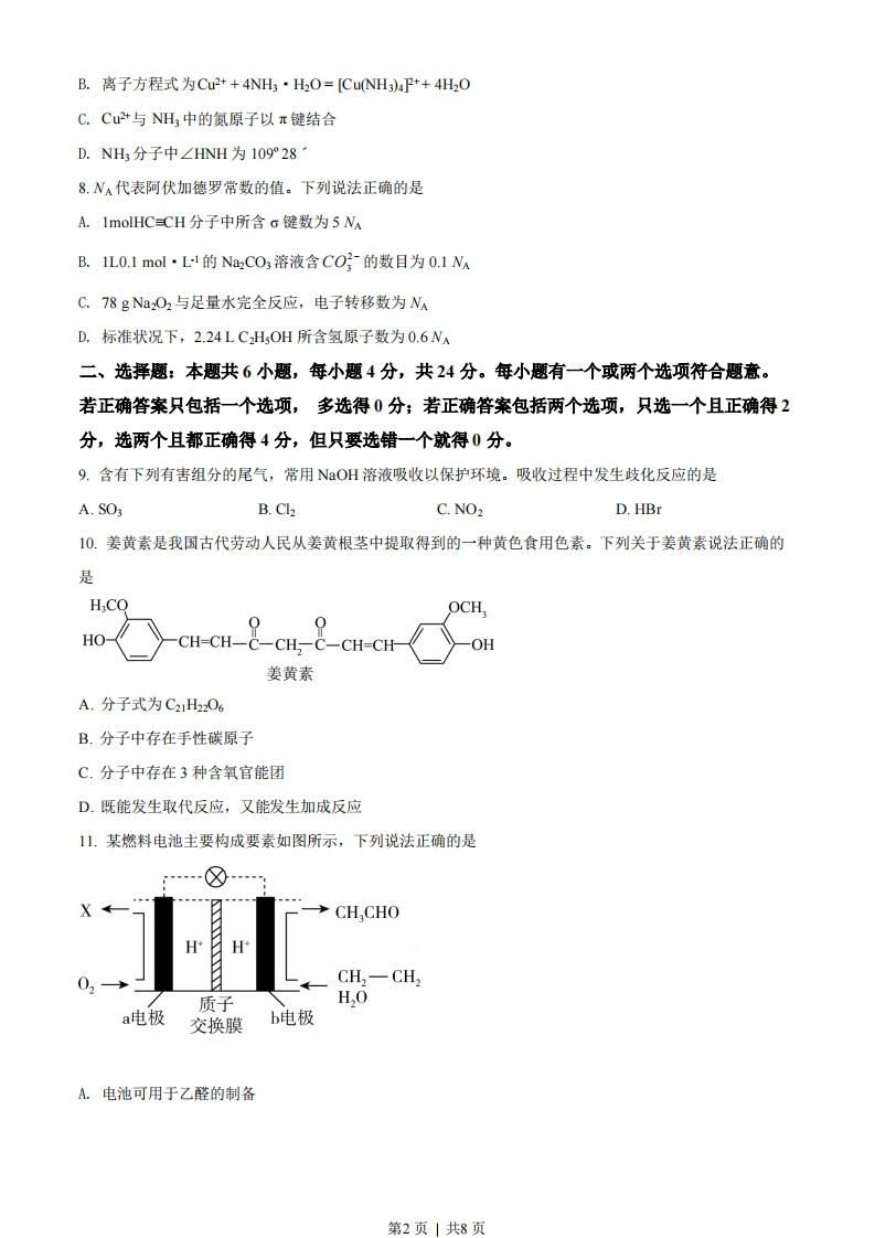 B.离子方程式为Cu2++4NH3·H2O=[CuNH3)P++4H2OC.Cu2+与NH3中的氮原子以π键结合D.NH3分子中∠HNH为109°288.Na代表阿伏加德罗常数的值。下列说法正确的是A.1 molHC=CH分子中所含c键数为5NAB.1L0.1mol·L1的Na2CO3溶液含CO-的数目为0.1NaC.78gNaO2与足量水完全反应,电子转移数为NaD.标准状况下,2.24 L C2HsOH所含氢原子数为0.6NA二、选择题:本题共6小题,每小题4分,共24分。每小题有一个或两个选项符合题意。若正确答案只包括一个选项,多选得0分;若正确答案包括两个选项,只选一个且正确得2分,选两个且都正确得4分,但只要选错一个就得0分。9.含有下列有害组分的尾气,常用NaOH溶液吸收以保护环境。吸收过程中发生歧化反应的是A.S03B.Cl2C.NO2D.HBr10.姜黄素是我国古代劳动人民从姜黄根茎中提取得到的一种黄色食用色素。下列关于姜黄素说法正确的是OCH.HOcu-cn8c.2cn-CHOH姜黄素A.分子式为C21H2206B.分子中存在手性碳原子C.分子中存在3种含氧官能团D.既能发生取代反应,又能发生加成反应11.某燃料电池主要构成要素如图所示,下列说法正确的是产CH,CHOH"HCH2一CH质子H,0a电极交换膜b电极A.电池可用于乙醛的制备第2页|共8页B.b电极为正极C.电池工作时,a电极附近pH降低D.a电极的反应式为O2+4e'4Ht=2H2012.某弱酸HA溶液中主要成分的分布分数随pH的变化如图所示。下列说法错误的是1.00HAA0.80分0.60复0400.200.00LJ1.02.03.04.05.06.07.08.0PHA.该酸gKa4.71B.NaA的水解平衡常数K-KaC.当该溶液的pH=7.0时,c(HAKc(A)D.某c(HA):c(A)=4:1的缓冲溶液,pH413.下列对有关事实的解释正确的是事实解释电子从低能轨道跃迁至高能轨道时吸收光波长不某些金属盐灼烧呈现不同焰色同CH与NH3分子的空间构型不B二者中心原子杂化轨道类型不同同CHF的热稳定性比HCI强H-F比H-CI的键能大SiO2的熔点比干冰高SO2分子间的范德华力大A.AB.Bc.cD.D14.下列实验操作或方法,目的可实现的是操作或方法实验目的向未知弱酸性试液中滴加含有SCN的溶液确证试液中Fe2+存在第3页」共8页