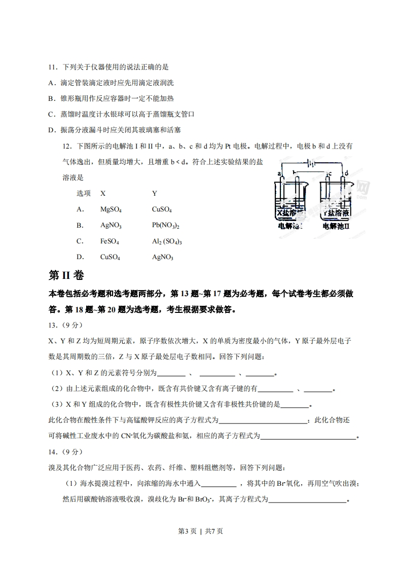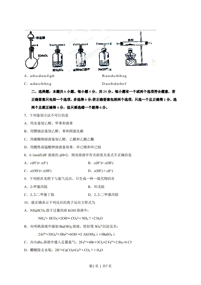 2013¥海南有高考化学科试题解析可能用到的相对原子质量:H112016.3Mg24A127S32C135.5K39 Fe56Cu64 Ac18 Ba137 Pb207第I卷一、选择题:本题共6小题。每小题2分,共12分。在每小题给出的四个选项中,只有一项是符合题目要求的。1.下列有机化合物中沸点最高的是A.乙烷B.乙烯C.乙醇D.乙酸2.下列化合物的俗称与化学式不对应的是A.绿矾-FeS04·7H2OB.芒硝Na2SO4·10Hz0C.明矾-Al2(S04)3·12H20D.胆矾-CuSO4·5HO3.重水(D2O)是重要的核工业原料,下列说法错误的是A.氘(D)原子核外有1个电子B.1H与D互称同位素C.H0与D0互称同素异形体D.1H2180与D2160的相对分子质量相同4.Mg-AgCI电池是一种能被海水激活的一次性贮备电池,电池反应方程式为:2AgC+Mg=Mg2+2Ag+2C。有关该电池的说法正确的是A.Mg为电池的正极B.负极反应为AgC+e=Ag+CIC.不能被KCI溶液激活D.可用于海上应急照明供电5.己知下列反应的热化学方程式:6C(s+5H2(g+3N2(g+9O2(g=2CHs(ONO2)5(0△H2 H2(g)+O2(g)=2H2O(g)△HC(s+O2(g)=C02(g)△H3则反应4C3H(ONO2)3)=12C0(g+10HzO(g)+0(g)+6N2(g)的△H为A.12△H3+5△H2-2△HB.2△H15△H2-12△H3C.12△H5△H2-2△HD.△H1-5△H12△36.下图所示仪器可用于实验室制备少量无水FC3,仪器连接顺序正确的是第1页|共7页盐壁铁粉容浓HSO4心和溶”N0出*:汉A.a-b-c-d-e-e-f-g-hB.a-e-d-c-b-h-i-gC.a-d-e-c-b-h-i-gD.a-c-b-d-e-h-i-f二、选择题:本题共6小题。每小题4分,共24分。每小题有一个或两个选项符合题意,若正确答案只包括一个选项,多选得0分:若正确答案包括两个选项,只选一个且正确得2分,选两个且都正确得4分,但只要选错一个就得0分。7.下列鉴别方法不可行的是A.用水鉴别乙醇、甲苯和溴苯B.用燃烧法鉴别乙醇、苯和四氯化碳C.用碳酸钠溶液鉴别乙醇、乙酸和乙酸乙酯D.用酸性高锰酸钾溶液鉴别苯、环己烯和环己烷8.0.1mol/LHF溶液的pH=2,则该溶液中有关浓度关系式不正确的是A.c(H+)c(F)B.c(H+c(HF)C.c(OH-)>c(HF)D.c(HF)>c(F)9.下列烃在光照下与氯气反应,只生成一种一氯代物的有A.2-甲基丙烷B.环戊烷C.2,2-二甲基丁烷D.2,2-二甲基丙烷10.能正确表示下列反应的离子反应方程式为A.NH.HCO3溶于过量的浓KOH溶液中:NH*+HCO3+20H-=CO32+NH3 t+2 H2OB.向明矾溶液中滴加Ba(OHh溶液,恰好使SO-沉淀完全:2A3+3S0,2+3Ba2+6OH=2AI(OH3↓+3BaSO4↓C.向FeBr2溶液中通入足量氯气:2Fe2+4Br+3Cl2=2Fe3+2B2+6CD.醋酸除去水垢:2Ht+CaCO,Ca2++CO2↑+Hz0第2页|共7页