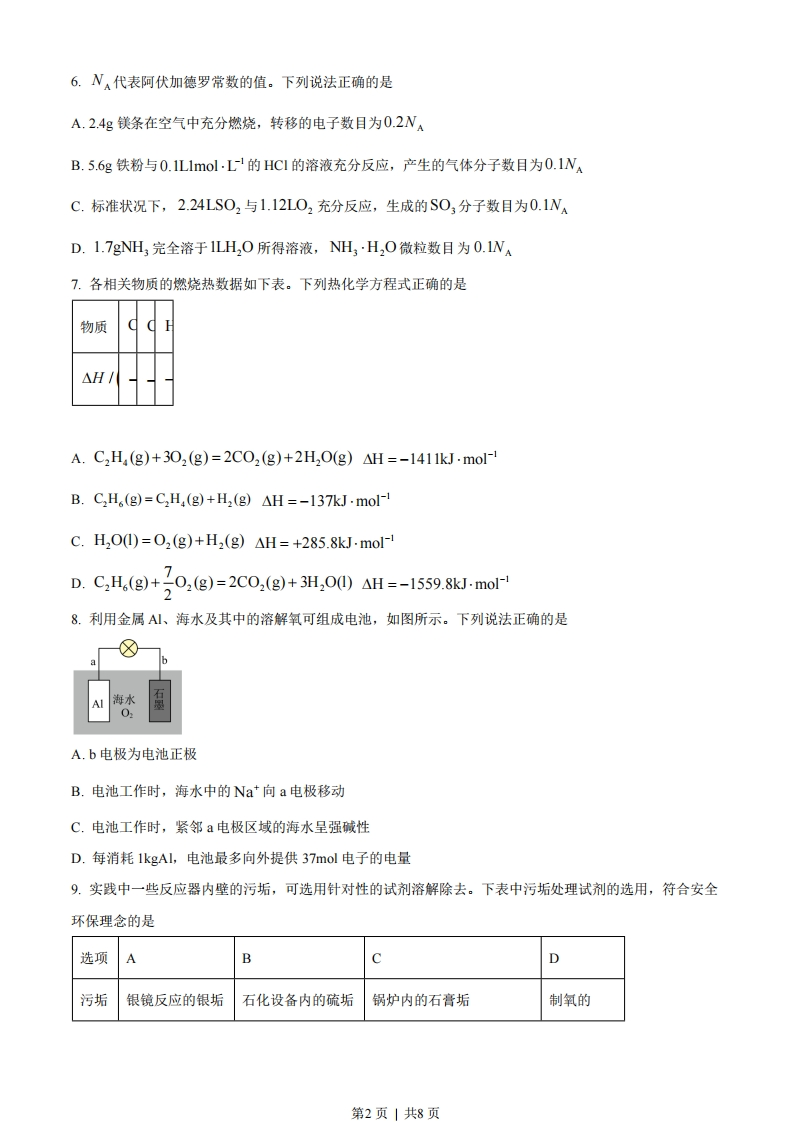 2023海南高考化学卷1.化学的迅速发展为满足人民日益增长的美好生活需要做出突出贡献。下列说法不合理的是A.为增强药效,多种处方药可随意叠加使用B.现代化肥种类丰富,施用方法其依据对象营养状况而定C.规范使用防腐制可以减缓食物变质速度,保持食品营养所值D.在种植业中,植物浸取试剂类医药也应慎重选用2.化学实验中的颜色变化,可将化学抽象之美具体为形象之美。下列叙述错误的是A.土豆片遇到碘溶液,呈蓝色B.蛋白质遇到浓硫酸,呈黄色C.C03溶液(0.1molL)中滴加乙醇,呈绿色D.苯酚溶液(0.lmol.L-1)中滴加FeCl3溶液(0.lmol.L1),呈紫色3.下列气体除杂(括号里为杂质)操作所选用的试剂合理的是A.CO2(HCI:饱和Na2CO3溶液B.NH3(H,O):碱石灰C.C,H2(HS):酸性KMnO,溶液D.C2H(SO2):PO1o4.下列有关元素单质或化合物的叙述正确的是A.P4分子呈正四面体,键角为10928B.NaCl焰色试验为黄色,与Cl电子跃迁有关C.Cu基态原子核外电子排布符合构造原理D.OF2是由极性键构成的极性分子5.《齐民要术》中记载了酒曲的处理,“乃平量一斗,舀中捣碎。若浸曲,一斗,与五升水。浸曲三日,如鱼眼汤沸.…”。下列说法错误的是A.“捣碎”目的是促进混合完全B.“曲”中含有复杂的催化剂C.“斗”和“升”都是容量单位D.“鱼眼”是水蒸气气泡的拟像化第1页」共8页MnO2垢6mol.L'HNO,5%NaOH溶液:饱和Na,C03溶液:5%柠浓HCI溶试剂溶液3%H202溶液檬酸溶液液A.AB.BC.cD.D10.近年来,我国航天科技事业取得了辉煌的成就。下列说法错误的是A.我国科学家由嫦娥五号待回的月壤样品中,首次发现了天然玻璃纤维,该纤维中的主要氧化物SO2属于离子晶体B.某型长征运载火箭以液氧和煤油为推进剂,液氧分子间靠范德华力凝聚在一起C.“嫦娥石”(CagY)Fe(PO,),是我国科学家首次在月壤中发现的新型静态矿物,该矿物中的Fe位于周期表中的ds区D.航天员出舱服中应用了碳纤维增强复合材料。碳纤维中碳原子杂化轨道类型是$p11.下列实验操作不能达到实验的是选项ABD检验1氯丁烷中氯元检验SO2是否沉制备检验醛基用的制备晶体目的素淀完全Cu(OH)2Cu(NH),SC硝酸酸化的0.1 mol-L"BaCl5滴5%8mL95%乙醇0.1 mol-L"AgNO,溶液CuSO,溶液操作溶液沿烧杯慧向4 mL0.1 mol-L"上层清液1-氯丁烷维续滴如2 mL 10%NaOH[CUCNHJ)JSO.溶液1一2滴溶液A.AB.BC.CD.D12.闭花耳草是海南传统药材,具有消炎功效。车叶草苷酸是其活性成分之一,结构简式如图所示。下列有关车叶草苷酸说法正确的是HOCOOHHCCOO-HO第3页|共8页