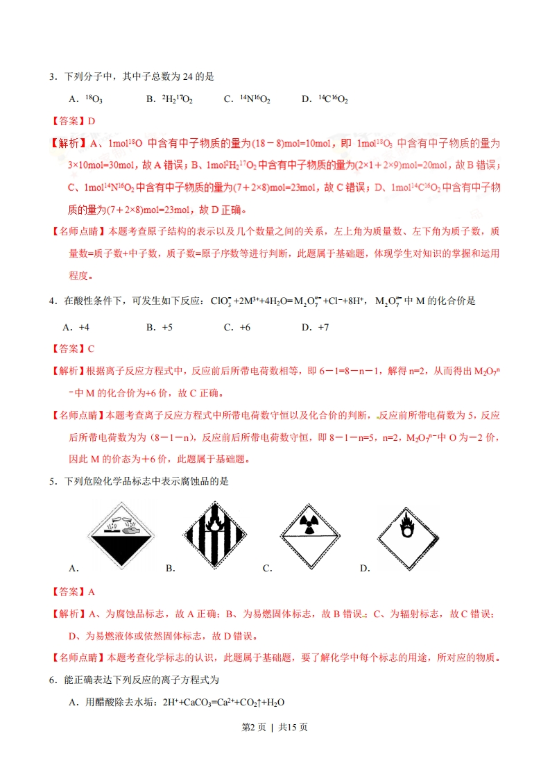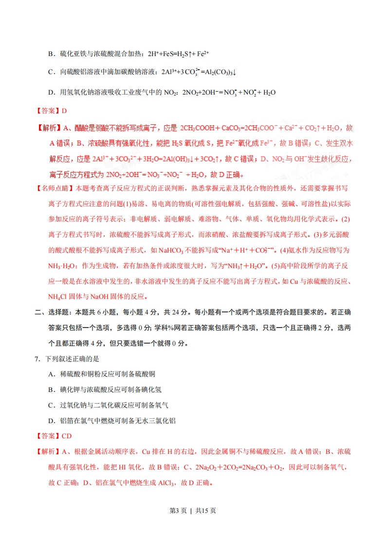 绝密★启用前2017年普通高等学校招生全国统一考试化学注意事项:1.答卷前,考生务必将自己的姓名、准考证号填写在答题卡上。2.回答选择题时,选出每小题答案后,用铅笔把答题卡上对应题目的答案标号涂黑,如需改动,用橡皮擦干净后,再选涂其它答案标号。回答非选择题时,将答案写在答题卡上,写在本试卷上无效。3.考试结束后,将本试卷和答题卡一并交回。可能用到的相对原子质量:H1C12N14016S32Cl35.5K39Fe56一、选择题:本题共6小题,每小题2分,共12分。在每小题给出的四个选项中,只有一项是符合题目要求的。1.下列说法错误的是A.蔗糖可作调味剂B.细铁粉可作食品抗氧剂C.双氧水可作消毒剂D.熟石灰可作食品干燥剂【答案】D【解析】A、蔗糖具有甜味,且对人体无害,因为蔗糖可以作调味剂,故A说法正确;B、细铁粉可以空气中氧气发生反应,防止食品被氧化变质,故B说法正确;C、双氧水具有强氧化性,能消灭细菌和病毒,因此双氧水可作消毒剂,故C说法正确;D、熟石灰不具有吸水性,不能作干燥剂,故D说法错误。【名师点睛】本题考查物质的用途,此题比较基础,平时夯实基础,掌握物质的性质和用途,体现对化学知识的学以致用。2.分别将足量下列气体通入稀NS溶液中,可以使溶液变浑浊的是A.COB.SO2C.HCID.CO2【答案】B【解析】A、CO不与Na2S发生反应,因此没有沉淀产生,故A错误:B、SO2具有弱氧化性,与NaS发生氧化还原反应,即SO2+2S2-+4H=3S!+2H20,故B正确:C、利用酸性强的制取酸性弱的,即发生2H++S2-=H2S,没有沉淀产生,故C错误:D、不产生沉淀,故D错误。【名师点睛】本题考查元素及其化合物的性质,此题比较基础,考查硫及其化合物的性质以及酸性的强的制取酸性弱,本题体现了SO2的弱氧化性,平时注意基础的夯实。第1页|共15页B.硫化亚铁与浓硫酸混合加热:2Ht+FeS-H2S↑+Fe2+C.向硫酸铝溶液中滴加碳酸钠溶液:2A3+3COˉ=Al2(CO3D.用氢氧化钠溶液吸收工业废气中的NO2:2NO2+2OH-=NO+NO;+H2O【答案】D【解析】A、酸是弱酸不能折写成离子,应是2CHC00H+CaC0=2CHC00ˉ+C2+C02↑+H20,故A错误;B、浓硫酸具有强氧化性,能把HS氧化成S,把Fe2氧化成F©”,故B错误;C、发生双水解反应,应是2A13*+3C0:2+3H0=2A1(O田:+3C021,故C错误;D、NO2与OH发生歧化反应,离子反应方程式为2NO2+20H=NO+NO2ˉ+H0,故D正确。【名师点睛】本题考查离子反应方程式的正误判断,熟悉掌握元素及其化合物的性质外,还需要掌握书写离子方程式应注意的问题()易溶、易电离的物质(可溶性强电解质,包括强酸、强碱、可溶性盐)以实际参加反应的离子符号表示:非电解质、弱电解质、难溶物、气体、单质、氧化物均用化学式表示。(2)离子方程式书写时,浓硫酸不能拆写成离子形式,而浓硝酸、浓盐酸要拆写成离子形式。(3)多元弱酸的酸式酸根不能拆写成离子形式,如NHCO3不能拆写成Na++H++CO3-”。(4)☒水作为反应物写为NH3HO:作为生成物,若有加热条件或浓度很大时,写为“NH↑+HO”。(5)高中阶段所学的离子反应一般是在水溶液中发生的,非水溶液中发生的离子反应不能写出离子方程式,如C与浓硫酸的反应、NH,CI固体与NaOH固体的反应.二、选择题:本题共6小题,每小题4分,共24分。每小题有一个或两个选项是符合题目要求的。若正确答案只包括一个选项,多选得0分;学科%网若正确答案包括两个选项,只选一个且正确得2分,选两个且都正确得4分,但只要选错一个就得0分。7.下列叙述正确的是A.稀硫酸和铜粉反应可制备硫酸铜B.碘化钾与浓硫酸反应可制备碘化氢C.过氧化钠与二氧化碳反应可制备氧气D.铝箔在氯气中燃烧可制备无水三氯化铝【答案】CD【解析】A、根据金属活动顺序表,C山排在H的右边,因此金属铜不与稀硫酸反应,故A错误:B、浓硫酸具有强氧化性,能把HⅢ氧化,故B错误:C、2Na2O2+2CO2=2N2CO3+O2,因此可以制备氧气,故C正确:D、铝在氯气中燃烧生成AC3,故D正确.第3页|共15页