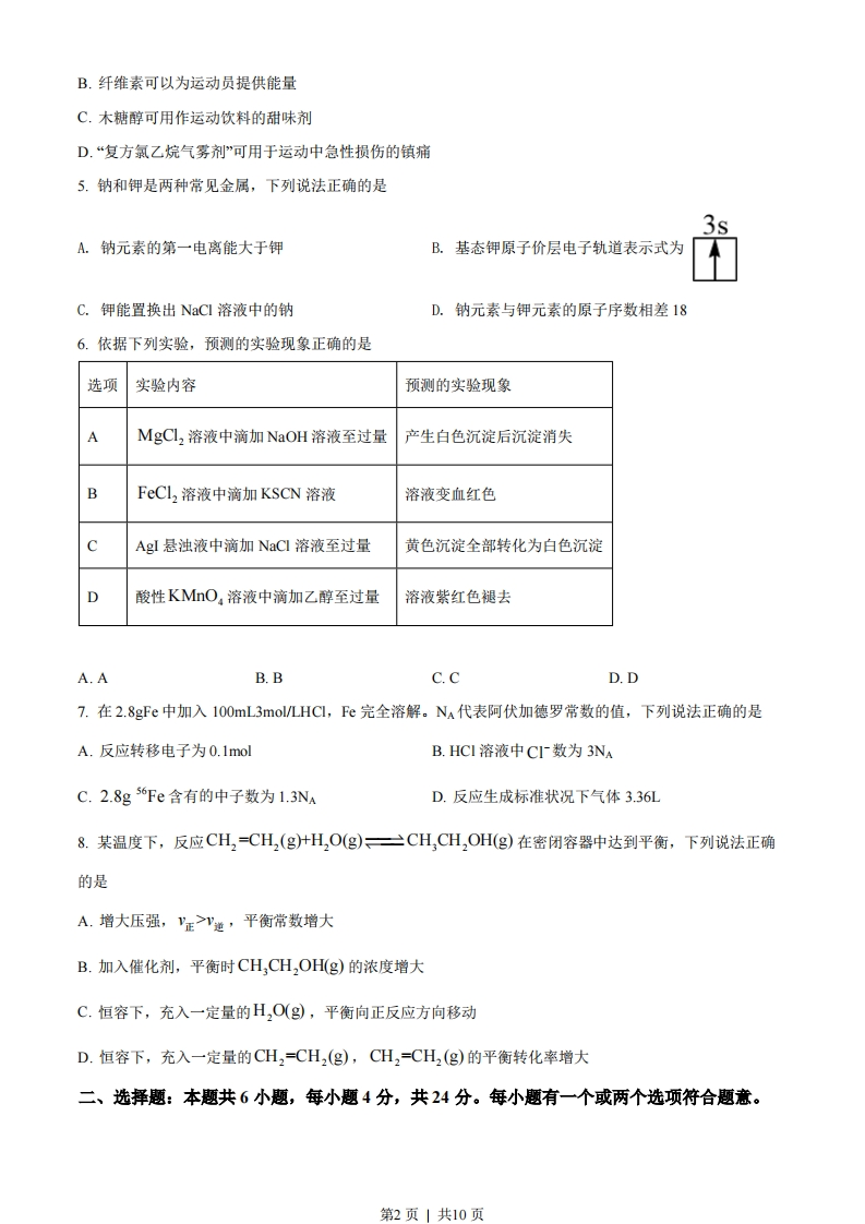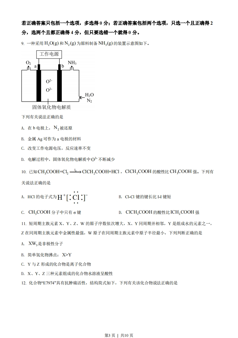海南省2022年普通高中学业水平选择性考试化学试题注意事项:1答卷前,考生务必将自已的姓名、准考证号填写在答题卡上。2.回答选择题时,选出每小题答案后,用铅笔把答题卡上对应题目的答案标号涂黑。如需改动,用橡皮擦干净后,再选涂其他答案标号,回答非选释题时,将答案写在答题卡上,写在本试卷上无效。3.考试结束后,将本试卷和答题卡一并交回。可能用到的相对原子质量:H1C12N14016P31Fe56一、选择题:本题共8小题,每小题2分,共16分。在每小题给出的四个选项中,只有一项是符合题目要求的。1.化学与日常生活息总相关。下列说法错误的是A.使用含氟牙膏能预防龋齿B.小苏打的主要成分是Na,COC.可用食醋除去水垢中的碳酸钙D.使用食品添加剂不应降低食品本身营养价值2.《医学入门》中记载我国传统中医提纯铜绿的方法:“水洗净,细研水飞,去石澄清,慢火熬干,”其中未涉及的操作是A.洗涤B.粉碎C.萃取D.蒸发3.下列实验操作规范的是浓硫酸00m20●A.过滤B.排空气法收集CO2C.混合浓硫酸和乙醇D.溶液的转移A.AB.BC.CD.D4.化学物质在体育领域有广泛用途。下列说法错误的是A.涤纶可作为制作运动服的材料第1页」共10页B.纤维素可以为运动员提供能量C.木糖醇可用作运动饮料的甜味剂D.“复方氯乙烷气雾剂”可用于运动中急性损伤的镇痛5.钠和钾是两种常见金属,下列说法正确的是3sA.钠元素的第一电离能大于钾B.基态钾原子价层电子轨道表示式为C.钾能置换出NaCI溶液中的钠D.钠元素与钾元素的原子序数相差186.依据下列实验,预测的实验现象正确的是选项实验内容预测的实验现象AMgCl,溶液中滴加NaOH溶液至过量产生白色沉淀后沉淀消失BFeCl,溶液中滴加KSCN溶液溶液变血红色AgI悬浊液中滴加NaCl溶液至过量黄色沉淀全部转化为白色沉淀酸性KMnO,溶液中滴加乙醇至过量溶液紫红色褪去A.AB.BC.CD.D7.在2.8gFe中加入100mL3mol/LHCl,Fe完全溶解。Na代表阿伏加德罗常数的值,下列说法正确的是A.反应转移电子为0.1molB.HCI溶液中CI数为3NAC.2.8g6℉e含有的中子数为1.3NaD.反应生成标准状况下气体3.368.某温度下,反应CH,=CH(g+H,O(g)≥CHCH,OH(g)在密闭容器中达到平衡,下列说法正确的是A.增大压强,V》正>”道,平衡常数增大B.加入催化剂,平衡时CHCH,OH(g)的浓度增大C.恒容下,充入一定量的H,O(,平衡向正反应方向移动D.恒容下,充入一定量的CH2=CH2(g),CH2=CH2(g)的平衡转化率增大二、选释题:本题共6小题,每小题4分,共24分。每小题有一个或两个选项符合题意。第2页」共10页若正确答案只包括一个选项,多选得0分;若正确答案包括两个选项,只选一个且正确得2分,选两个且都正确得4分,但只要选错一个就得0分。9.一种采用H,O(g)和N2(g)为原料制备NH(g)的装置示意图如下。工作电源02NH3a0202H20N2固体氧化物电解质下列有关说法正确的是A.在b电极上,N,被还原B.金属Ag可作为a电极的材料C.改变工作电源电压,反应速率不变D.电解过程中,固体氧化物电解质中O2不断减少10.己知CH,COOH+CL2-→CICH,COOH+HCI,CICH,COOH的酸性比CH,COOH强。下列有关说法正确的是AHG的电子式为H[:CI]B.C-C键的键长比I-I键短C.CH,COOH分子中只有c键D.CICH,COOH的酸性比ICH,COOH强11.短周期主族元素X、Y、Z、W的原子序数依次增大,X、Y同周期并相邻,Y是组成水的元素之一,Z在同周期主族元素中金属性最强,W原子在同周期主族元素中原子半径最小,下列判断正确的是A.XW3是非极性分子B.简单氢化物沸点:X>YC.Y与Z形成的化合物是离子化合物D.X、Y、Z三种元素组成的化合物水溶液呈酸性12.化合物E7974”具有抗肿痛活性,结构简式如下,下列有关该化合物说法正确的是第3页」共10页
