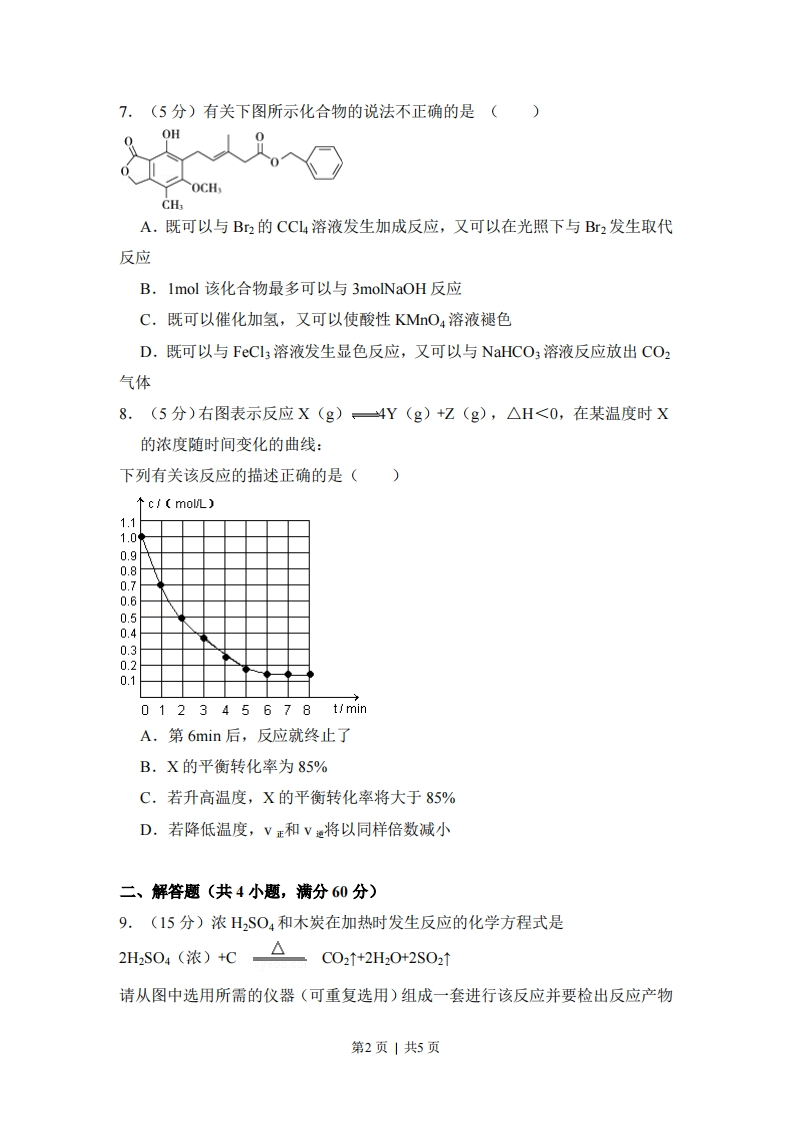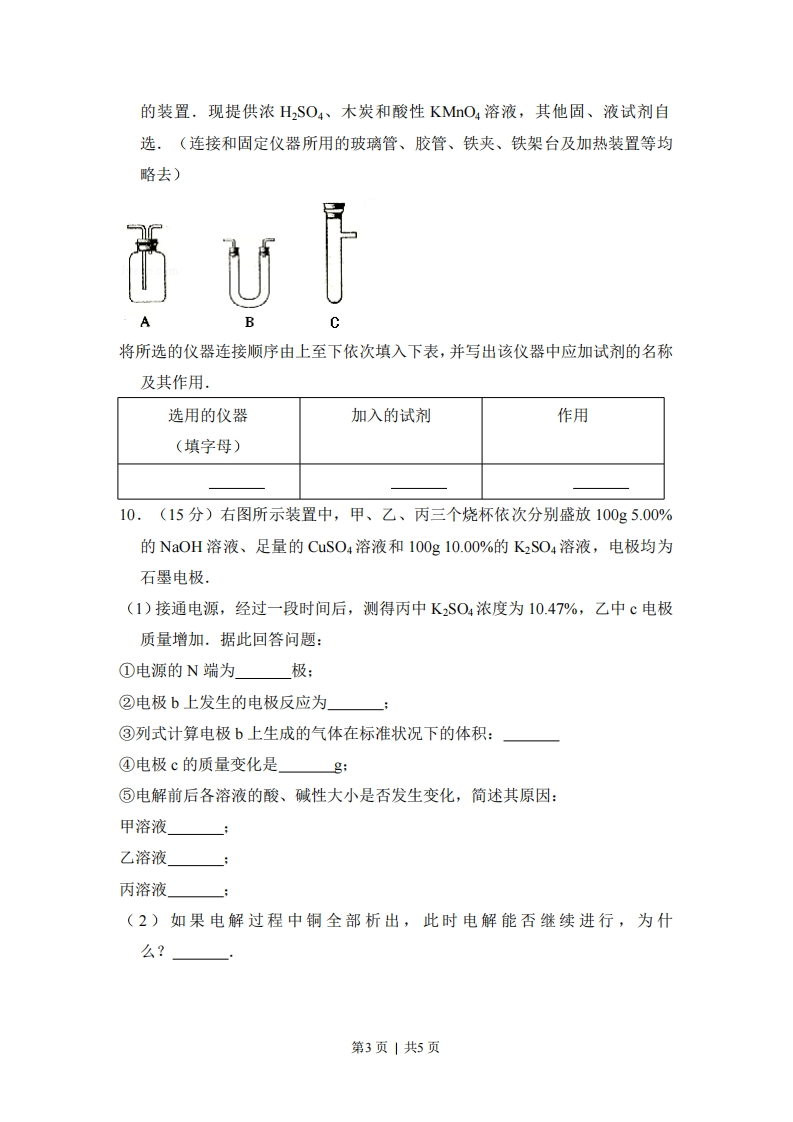 7.(5分)有关下图所示化合物的说法不正确的是()OHOCHCHA.既可以与B2的CCl4溶液发生加成反应,又可以在光照下与B2发生取代反应B.1mol该化合物最多可以与3 molNaOH反应C.既可以催化加氢,又可以使酸性KMO4溶液褪色D.既可以与FeCl3溶液发生显色反应,又可以与NaHCO3溶液反应放出CO2气体8.(5分)右图表示反应X(g)4Y(g)+Z(g),△H<0,在某温度时X的浓度随时间变化的曲线:下列有关该反应的描述正确的是()个cj(molL)1.11.010.90.80.70.60.50.40.30.20.1012345678t/minA.第6min后,反应就终止了B.X的平衡转化率为85%C.若升高温度,X的平衡转化率将大于85%D.若降低温度,V和V海将以同样倍数减小二、解答题(共4小题,满分60分)9.(15分)浓H2S04和木炭在加热时发生反应的化学方程式是2HS04(浓)+C△C02t+2H,0+2S02↑请从图中选用所需的仪器(可重复选用)组成一套进行该反应并要检出反应产物第2页|共5页的装置.现提供浓HSO4、木炭和酸性KMO4溶液,其他固、液试剂自选.(连接和固定仪器所用的玻璃管、胶管、铁夹、铁架台及加热装置等均略去)ABC将所选的仪器连接顺序由上至下依次填入下表,并写出该仪器中应加试剂的名称及其作用,选用的仪器加入的试剂作用(填字母)10.(15分)右图所示装置中,甲、乙、丙三个烧杯依次分别盛放100g5.00%的NaOH溶液、足量的CuSO4溶液和100g10.00%的K2S04溶液,电极均为石墨电极.(1)接通电源,经过一段时间后,测得丙中K2S04浓度为10.47%,乙中c电极质量增加.据此回答问题:①电源的N端为极:②电极b上发生的电极反应为③列式计算电极b上生成的气体在标准状况下的体积:④电极c的质量变化是g:⑤电解前后各溶液的酸、碱性大小是否发生变化,简述其原因:甲溶液乙溶液丙溶液(2)如果电解过程中铜全部析出,此时电解能否继续进行,为什么?第3页|共5页