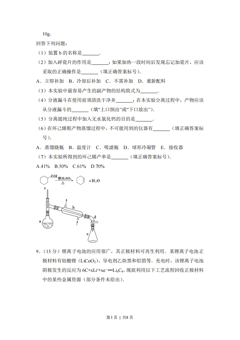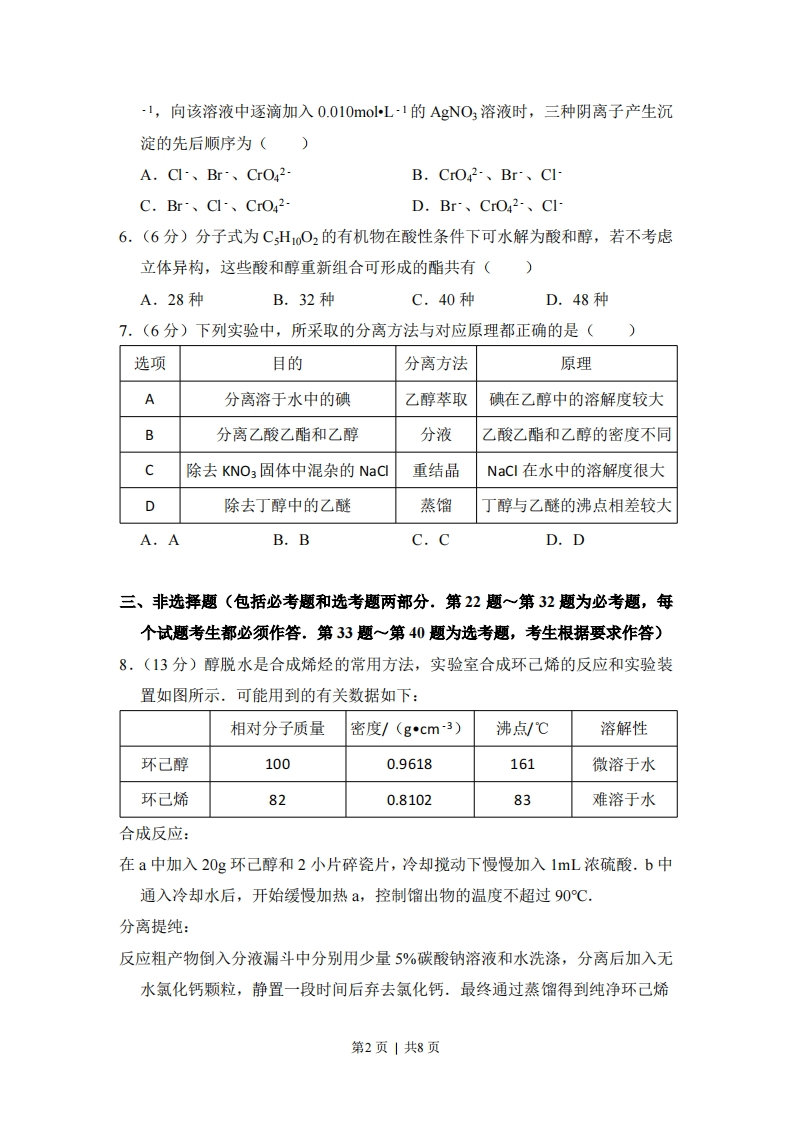 2013年全国统一高考化学试卷(新课标I)一、选择题1.(6分)化学无处不在,与化学有关的说法不正确的是()A.侯氏制碱法的工艺过程中应用了物质溶解度的差异B.可用蘸浓盐酸的棉棒检验输送氨气的管道是否漏气C,碘是人体必需微量元素,所以要多吃富含高碘酸的食物D.黑火药由硫磺、硝石、木炭三种物质按一定比例混合制成2.(6分)香叶醇是合成玫瑰香油的主要原料,其结构简式如图所示:下列有关香叶醇的叙述正确的是()OHA.香叶醇的分子式为C1H1OB.不能使溴的四氯化碳溶液褪色C.不能使酸性高锰酸钾溶液褪色D.能发生加成反应不能发生取代反应3.(6分)短周期元素W、X、Y、Z的原子序数依次增大,其简单离子都能破坏水的电离平衡的是()A.W2-、XB.X、Y3C.Y3、Z2-D.X、Z4.(6分)银制器皿日久表面会逐渐变黑,这是生成了Ag2S的缘故.根据电化学原理可进行如下处理:在铝质容器中加入食盐溶液,再将变黑的银器浸入该溶液中,一段时间后发现黑色会褪去.下列说法正确的是()A.处理过程中银器一直保持恒重B.银器为正极,Ag2S被还原生成单质银C.该过程中总反应为2A1+3Ag2S一6Ag+Al2S3D.黑色褪去的原因是黑色Ag2S转化为白色AgCI5.(6分)已知Kp(AgC1)=1.56×10~10,Kp(AgBr)=7.7×10-1B,Kp(Ag2Cr04)=9.0×1012.某溶液中含有Cl、Br~和CrO42浓度均为0.010molL第1页|共8页1,向该溶液中逐滴加入0.010molL1的AgNO3溶液时,三种阴离子产生沉淀的先后顺序为()A.C、Br、CrO42-B.CrO42-、Br、ClC.Br、Cl、CrO42-D.Br、CrO42-、Cl6.(6分)分子式为CH1oO2的有机物在酸性条件下可水解为酸和醇,若不考虑立体异构,这些酸和醇重新组合可形成的酯共有()A.28种B.32种C.40种D.48种7.(6分)下列实验中,所采取的分离方法与对应原理都正确的是(选项目的分离方法原理A分离溶于水中的碘乙醇萃取碘在乙醇中的溶解度较大B分离乙酸乙酯和乙醇分液乙酸乙酯和乙醇的密度不同除去KNO3固体中混杂的NaC重结晶NaC在水中的溶解度很大0除去丁醇中的乙醚蒸馏丁醇与乙醚的沸点相差较大A.AB.BC.CD.D三、非选择题(包括必考题和选考题两部分.第22题~第32题为必考题,每个试题考生都必须作答.第33题~第40题为选考题,考生根据要求作答)8.(13分)醇脱水是合成烯烃的常用方法,实验室合成环己烯的反应和实验装置如图所示.可能用到的有关数据如下:相对分子质量密度/(gcm3)沸点/℃溶解性环己醇1000.9618161微溶于水环己烯820.810283难溶于水合成反应:在a中加入20g环己醇和2小片碎瓷片,冷却搅动下慢慢加入1mL浓硫酸.b中通入冷却水后,开始缓慢加热,控制馏出物的温度不超过90℃.分离提纯:反应粗产物倒入分液漏斗中分别用少量5%碳酸钠溶液和水洗涤,分离后加入无水氯化钙颗粒,静置一段时间后弃去氯化钙.最终通过蒸馏得到纯净环己烯第2页|共8页10g回答下列问题:(1)装置b的名称是(2)加入碎瓷片的作用是:如果加热一段时间后发现忘记加瓷片,应该采取的正确操作是(填正确答案标号).A.立即补加B.冷却后补加C.不需补加D.重新配料(3)本实验中最容易产生的副产物的结构简式为(4)分液漏斗在使用前须清洗干净并;在本实验分离过程中,产物应该从分液漏斗的(填“上口倒出”或“下口放出”)(5)分离提纯过程中加入无水氯化钙的目的是(6)在环己烯粗产物蒸馏过程中,不可能用到的仪器有(填正确答案标号)A.蒸馏烧瓶B.温度计C.吸滤瓶D.球形冷凝管E.接收器(7)本实验所得到的环己烯产率是(填正确答案标号).A.41%B.50%C.61%D.70%0H浓HS0,+H2O9.(15分)锂离子电池的应用很广,其正极材料可再生利用.某锂离子电池正极材料有钴酸锂(LCoO2)、导电剂乙炔黑和铝箔等.充电时,该锂离子电池阴极发生的反应为6C+xLi+xe一LiC6.现欲利用以下工艺流程回收正极材料中的某些金属资源(部分条件未给出):第3页|共8页