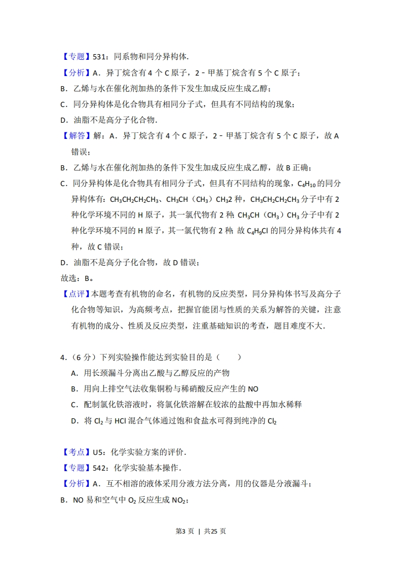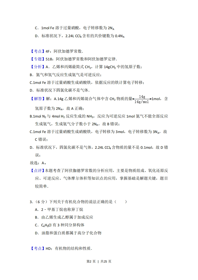 2016年全国统一高考化学试卷(新课标I)事考答案与试题佩析一、选择题(共7小题,每小题6分,满分42分)1.(6分)化学与生活密切相关,下列有关说法错误的是()A.用灼烧的方法可以区分蚕丝和人造纤维B.食用油反复加热会产生稠环芳香烃等有害物质C.加热能杀死流感病毒是因为蛋白质受热变性D.医用消毒酒精中乙醇的浓度为95%【考点】11:化学的主要特点与意义:14:物质的组成、结构和性质的关系.【专题】56:化学应用,【分析】A,蚕丝含有蛋白质,灼烧时具有烧焦的羽毛气味:B.食用油反复加热会生成苯并芘等物质:C.加热可导致蛋白质变性:D.医用消毒酒精中乙醇的浓度为75%.【解答】解:A,蚕丝含有蛋白质,灼烧时具有烧焦的羽毛气味,为蛋白质的特有性质,可用于鉴别蛋白质类物质,故A正确:B.食用油反复加热会生成苯并芘等稠环芳香烃物质,可致癌,故B正确:C.加热可导致蛋白质变性,一般高温可杀菌,故C正确:D.医用消毒酒精中乙醇的浓度为75%,故D错误。故选:D。【点评】本题综合考查元素化合物知识,为高频考点,侧重于化学与生活、生产的考查,有利于培养学生良好的科学素养,提高学习的积极性,注意相关基础知识的积累,难度不大2.(6分)设N为阿伏加德罗常数值.下列有关叙述正确的是()A.14g乙烯和丙烯混合气体中的氢原子数为2NaB.1molN2与4molH2反应生成的NH3分子数为2Na第1页|共25页C.1 mol Fe溶于过量硝酸,电子转移数为2NaD.标准状况下,2.24LCC含有的共价键数为0.4NA【考点】4F:阿伏加德罗常数.【专题】518:阿伏加德罗常数和阿伏加德罗定律.【分析】A.乙烯和丙烯最简式CH2,计算14gCH2中的氢原子数:B.氮气和氢气反应生成氨气是可逆反应:C.1 mol Fe溶于过量硝酸生成硝酸铁,依据反应的铁计算电子转移:D.标准状况下四氯化碳不是气体.【解答】解:A14g乙烯和丙烯混合气体中含CH2物质的量=,148,=1mol,含14g/mol氢原子数为2NA,故A正确:B.1molN2与4molH2反应生成的NH3,反应为可逆反应1mol氮气不能全部反应生成氨气,生成氨气分子数小于2NA,故B错误:C.1 mol Fe溶于过量硝酸生成硝酸铁,电子转移为3mol,电子转移数为3Na,故C错误:D.标准状况下,四氯化碳不是气体,2.24LCcl4含物质的量不是0.1mol,故D错误:故选:A。【点评】本题考查了阿伏伽德罗常数的分析应用,主要是物质组成、氧化还原反应、可逆反应、气体摩尔体积等知识点的应用,掌握基础是解题关键,题目较简单.3.(6分)下列关于有机化合物的说法正确的是()A.2-甲基丁烷也称异丁烷B.由乙烯生成乙醇属于加成反应C.C4HgCI有3种同分异构体D.油脂和蛋白质都属于高分子化合物【考点】HD:有机物的结构和性质.第2页|共25页
