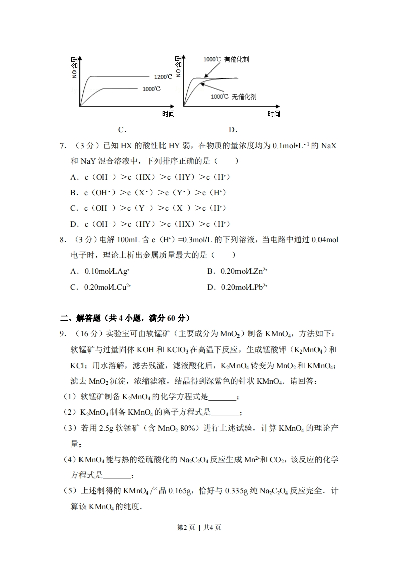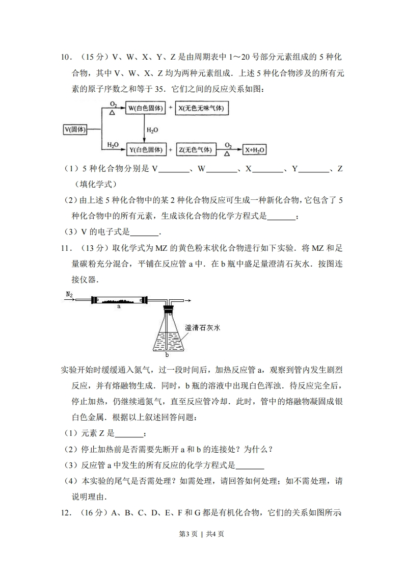 2008年全国统一高考化学试卷(全国卷)一、第1卷选择题(在每小题给出的四个选项中,只有一项是符合题目要求的.)1.(3分)在溶液中加入足量Na2O2后仍能大量共存的离子组是()A.NH4、Ba2、Cl、NO3B.K、A1O2、Cl、SO42-C.Ca2、Mg2、NO3、HCO3D.Na°、C1、C032-、S032-2.(3分)下列化合物,按其晶体的熔点由高到低排列正确的是()A.SiO2、CsCl、CBr4、CF4B.SiO2、CsCl、CF4、CBr4C.CsCl、SiO2、CBr4、CF4D.CF4、CBr4、CsCl、SiO23.(3分)下列各组物质不属于同分异构体的是()A,2,2-二甲基丙醇和2-甲基丁醇B.邻氯甲苯和对氯甲苯C.2-甲基丁烷和戊烷D,甲基丙烯酸和甲酸丙酯4.(3分)下列各组给定原子序数的元素,不能形成原子数之比为1:1稳定化合物的是()A.3和17B.1和8C.1和6D.7和125.(3分)下列叙述中正确的是()A.NH3、CO、CO2都是极性分子B.CH4、CCL4都是含有极性键的非极性分子C.HF、HCI、HBr、HI的稳定性依次增强D.CS2、HO、C2H2都是直线型分子6.(3分)已知:4NH(g)+5O2(g)一4N0(g)+6H0(g),△H=-1025 kJ/mol,.该反应是一个可逆反应,若反应物起始的物质的量相同,下列关于该反应的示意图不正确的是()酬100'℃21×10Pa1200'℃1×10pa时间时间AB.第1页|共4页10.(15分)V、W、X、Y、Z是由周期表中1~20号部分元素组成的5种化合物,其中V、W、X、Z均为两种元素组成.上述5种化合物涉及的所有元素的原子序数之和等于35.它们之间的反应关系如图:02W(白色固体)X《无色无味气体)△V(固体)H20H2OY(白色固体)Z(无色气体)02→x4H0(1)5种化合物分别是VWX(填化学式)(2)由上述5种化合物中的某2种化合物反应可生成一种新化合物,它包含了5种化合物中的所有元素,生成该化合物的化学方程式是(3)V的电子式是11.(13分)取化学式为M亿的黄色粉末状化合物进行如下实验.将MZ和足量碳粉充分混合,平铺在反应管中.在b瓶中盛足量澄清石灰水.按图连接仪器N2澄清石灰水实验开始时缓缓通入氮气,过一段时间后,加热反应管,观察到管内发生剧烈反应,并有熔融物生成.同时,b瓶的溶液中出现白色浑浊.待反应完全后,停止加热,仍继续通氮气,直至反应管冷却.此时,管中的熔融物凝固成银白色金属.根据以上叙述回答问题:(1)元素Z是:(2)停止加热前是否需要先断开a和b的连接处?为什么?(3)反应管a中发生的所有反应的化学方程式是(4)本实验的尾气是否需处理?如需处理,请回答如何处理:如不需处理,请说明理由12.(16分)A、B、C、D、E、F和G都是有机化合物,它们的关系如图所示第3页|共4页