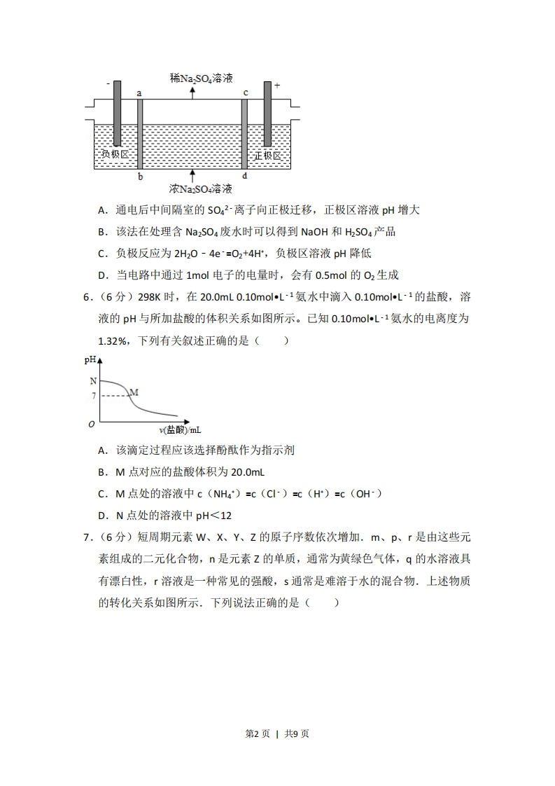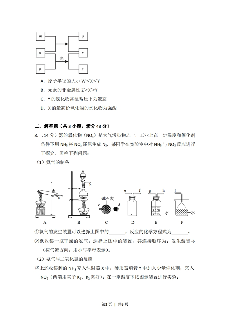 2016年全国统一高考化学试卷(新课标I)一、选择题(共7小题,每小题6分,满分42分)1.(6分)化学与生活密切相关,下列有关说法错误的是()A.用灼烧的方法可以区分蚕丝和人造纤维B.食用油反复加热会产生稠环芳香烃等有害物质C.加热能杀死流感病毒是因为蛋白质受热变性D.医用消毒酒精中乙醇的浓度为95%2.(6分)设N为阿伏加德罗常数值.下列有关叙述正确的是()A.14g乙烯和丙烯混合气体中的氢原子数为2NaB.1molN2与4molH2反应生成的NH3分子数为2NaC.1 mol Fe溶于过量硝酸,电子转移数为2NAD.标准状况下,2.24LCCl4含有的共价键数为0.4Na3.(6分)下列关于有机化合物的说法正确的是()A.2-甲基丁烷也称异丁烷B.由乙烯生成乙醇属于加成反应C.C4HgCl有3种同分异构体D.油脂和蛋白质都属于高分子化合物4.(6分)下列实验操作能达到实验目的是()A.用长颈漏斗分离出乙酸与乙醇反应的产物B.用向上排空气法收集铜粉与稀硝酸反应产生的NOC.配制氯化铁溶液时,将氯化铁溶解在较浓的盐酸中再加水稀释D.将C2与HCI混合气体通过饱和食盐水可得到纯净的C25.(6分)三室式电渗析法处理含N2S04废水的原理如图所示,采用惰性电极,ab、cd均为离子交换膜,在直流电场的作用下,两膜中间的Na和S0,2-可通过离子交换膜,而两端隔室中离子被阻挡不能进入中间隔室.下列叙述正确的是()第1页1共9页稀NaSO,溶液负极区正极区浓NaSO4溶液A.通电后中间隔室的SO42离子向正极迁移,正极区溶液pH增大B.该法在处理含Na2SO4废水时可以得到NaOH和H2S0a产品C.负极反应为2H20-4e=O2+4H,负极区溶液pH降低D.当电路中通过1mol电子的电量时,会有0.5mol的02生成6.(6分)298K时,在20.0mL0.10molL-1氨水中滴入0.10molL1的盐酸,溶液的pH与所加盐酸的体积关系如图所示。已知0.10molL-1氨水的电离度为1.32%,下列有关叙述正确的是()PHAv(盐酸)mLA.该滴定过程应该选择酚酞作为指示剂B.M点对应的盐酸体积为20.0mLC.M点处的溶液中c(NHa)=c(C)=C(H)=C(OH)D.N点处的溶液中pH<127,(6分)短周期元素W、X、Y、Z的原子序数依次增加.m、p、r是由这些元素组成的二元化合物,是元素Z的单质,通常为黄绿色气体,q的水溶液具有漂白性,「溶液是一种常见的强酸,s通常是难溶于水的混合物.上述物质的转化关系如图所示.下列说法正确的是()第2页1共9页A.原子半径的大小WX>YC.Y的氢化物常温常压下为液态D,X的最高价氧化物的水化物为强酸二、解答题(共3小题,满分43分)8.(14分)氮的氧化物(NOx)是大气污染物之一,工业上在一定温度和催化剂条件下用NH3将NOx还原生成N2.某同学在实验室中对NH3与NO2反应进行了探究。回答下列问题:(1)氨气的制备BDE①氨气的发生装置可以选择上图中的反应的化学方程式为②欲收集一瓶干燥的氨气,选择上图中的装置,其连接顺序为:发生装置→(按气流方向,用小写字母表示)。(2)氨气与二氧化氮的反应将上述收集到的NH3充入注射器X中,硬质玻璃管Y中加入少量催化剂,充入NO2(两端用夹子K1、K2夹好)。在一定温度下按图示装置进行实验。第3页1共9页