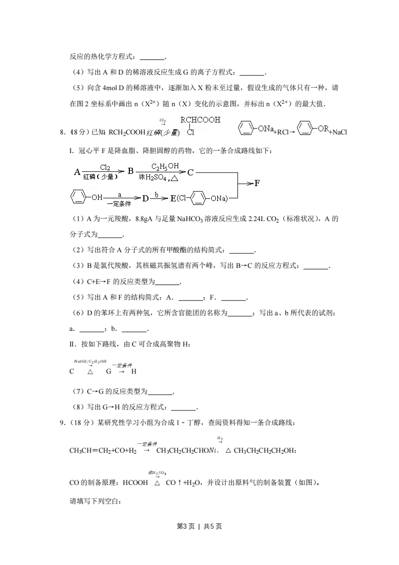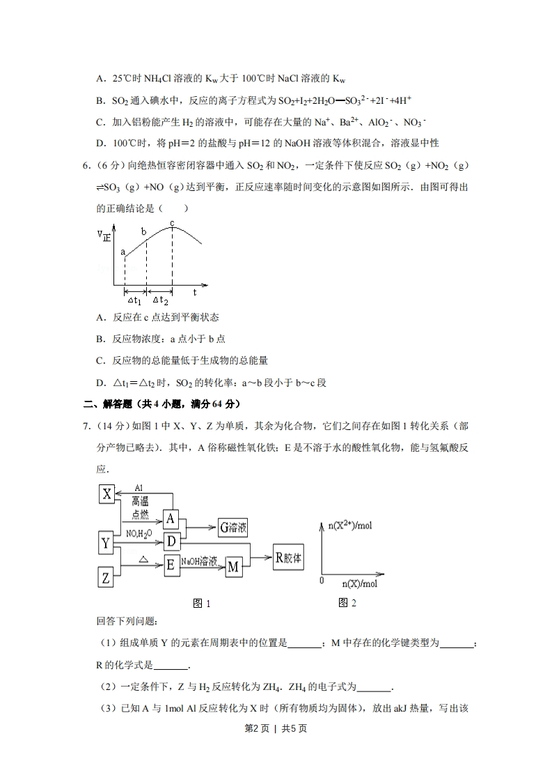 2011年天津市高考化学试卷一、选择题(共6小题,每小题6分,满分36分)1.(6分)化学在人类生活中扮演着重要角色,以下应用正确的是()A.用浸泡过高锰酸钾溶液的硅土吸收水果释放的乙烯,可达到水果保鲜的目的B.为改善食物的色、香、味并防止变质,可在其中加入大量食品添加剂C.使用无磷洗衣粉,可彻底解决水体富营养化问题D.天然药物无任何毒副作用,可长期服用2.(6分)以下有关原子结构及元素周期律的叙述正确的是()A.第IA族元素铯的两种同位素137Cs比133Cs多4个质子B.同周期元素(除0族元素外)从左到右,原子半径逐渐减小C.第IA族元素从上到下,其氢化物的稳定性逐渐增强D.同主族元素从上到下,单质的熔点逐渐降低3.(6分)向四支试管中分别加入少量不同的无色溶液进行如下操作,结论正确的是()操作现象结论①滴加BaC2溶液生成白色沉淀原溶液中有S042-②滴加氯水和CC4,振荡、静置下层溶液显紫原溶液中有I色③用洁净铂丝蘸取溶液进行焰色反火焰呈黄色原溶液中有Na、无应K④滴加稀NaOH溶液,将湿润红色试纸不变蓝原溶液中无NH4石蕊试纸置于试管A.①B.②C.③D.④4.(6分)25℃时,向10mL0.01 molL KOH溶液中滴加0.01mol/L苯酚溶液,混合溶液中粒子浓度关系正确的是()A.pH>7时,c(CH0)>c(K+)>c(H)>c(OH)B.pH<7时,c(K+)>c(C6H0)>c(H)>c(OH)C.V[C6HsOH (aq)]=10mL,c (K+)=c (C6HsO-)>c (OH-)=c (H+)D.V[C6HsOH (aq)]=20mL,c (C6HsO-)+c (C6HsOH)=2c (K)5.(6分)下列说法正确的是()第1页|共5页A.25C时NH4C溶液的Kw大于100℃时NaCI溶液的KwB.S02通入碘水中,反应的离子方程式为S02+H2+2H20一S032-+2I+4HC.加入铝粉能产生H2的溶液中,可能存在大量的Na、Ba2+、AIO2、NO3D.100℃时,将pH=2的盐酸与pH=12的NaOH溶液等体积混合,溶液显中性6.(6分)向绝热恒容密闭容器中通入SO2和NO2,一定条件下使反应SO2(g)+NO2(g)=SO3(g)+NO(g)达到平衡,正反应速率随时间变化的示意图如图所示.由图可得出的正确结论是(At1 At2A.反应在c点达到平衡状态B.反应物浓度:a点小于b点C.反应物的总能量低于生成物的总能量D.△t1=△t2时,SO2的转化率:a~b段小于b~c段二、解答题(共4小题,满分64分)7.(14分)如图1中X、Y、Z为单质,其余为化合物,它们之间存在如图1转化关系(部分产物己略去).其中,A俗称磁性氧化铁:E是不溶于水的酸性氧化物,能与氢氟酸反应☒s制高温点燃G溶液An(2+)/molNO.H2OD△ENaOH溶液R胶体Mn(X)/mol图1图2回答下列问题:(1)组成单质Y的元素在周期表中的位置是:M中存在的化学键类型为R的化学式是」(2)一定条件下,Z与H2反应转化为ZH4·ZH的电子式为(3)己知A与1 mol Al反应转化为X时(所有物质均为固体),放出akJ热量,写出该第2页|共5页反应的热化学方程式:(4)写出A和D的稀溶液反应生成G的离子方程式:(5)向含4molD的稀溶液中,逐渐加入X粉末至过量,假设生成的气体只有一种,请在图2坐标系中画出n(X2+)随n(X)变化的示意图,并标出n(X2+)的最大值.RCHCOOH8.48分)己知RCH2COOH红本至C1-OR+NaClI.冠心平F是降血脂、降胆固醇的药物,它的一条合成路线如下:ABC2H5 OH浓H2SO4,△-F一定条件》-oNa)-(1)A为一元羧酸,8.8gA与足量NaHCO3溶液反应生成2.24LCO2(标准状况),A的分子式为(2)写出符合A分子式的所有甲酸酯的结构简式:(3)B是氯代羧酸,其核磁共振氢谱有两个峰,写出B→C的反应方程式:(4)C+E→F的反应类型为」(5)写出A和F的结构简式:A.:F(6)D的苯环上有两种氢,它所含官能团的名称为:写出a、b所代表的试剂:a.:b.Ⅱ.按如下路线,由C可合成高聚物H:NaDH/C2H2OH一定保件C△G→H(7)C→G的反应类型为(8)写出G→H的反应方程式:9.(18分)某研究性学习小组为合成1-丁醇,查阅资料得知一条合成路线:CH3CH=CH2+CO+H2-CH3CH2CH2CHONi,A CH3CH2CH2CH2OH:2s04C0的制备原理:HCOOH△C0↑+H2O,并设计出原料气的制备装置(如图)。请填写下列空白:第3页|共5页