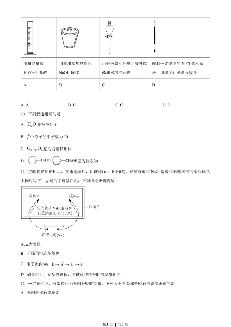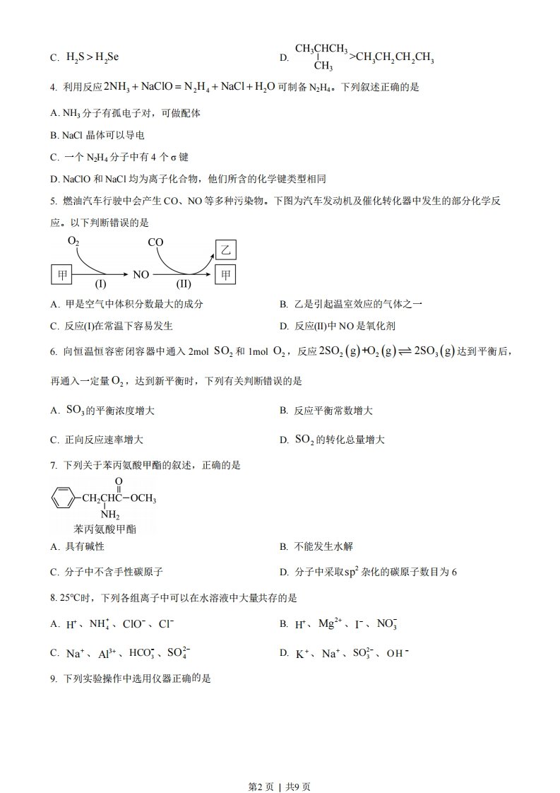 2022年天津市普通高中学业水平等级性考试化学本试卷分为第I卷(选释题)和第Ⅱ卷(非选释题)两部分,共100分,考试用时60分钟。第1卷1至4页,第Ⅱ卷5至8页。答卷前,考生务必将自己的姓名、考生号、考场号和座位号填写在答题卡上,并在规定位置粘贴考试用条形码。答卷时,考生务必将答案涂写在答题卡上,答在试卷上的无效。考试结束后,将本试卷和答题卡一并交回。以下数据可供解题时参考:相对原子质量:H1C12016Na23第I卷注意事项:1.每题选出答案后,用铅笔将答题卡上对应题目的答案标号涂黑。如需改动,用橡皮擦干净后,再选涂其他答案标号。2.本卷共12题,每题3分,共36分。在每题所给出的四个选项中,只有一项是最符合题目要求的。1.近年我国在科技领域不断取得新成就。对相关成就所涉及的化学知识理解错误的是A.我国科学家实现了从二氧化碳到淀粉的人工合成,淀粉是一种单糖B.中国“深海一号”平台成功实现从深海中开采石油和天然气,石油和天然气都是混合物C.我国实现了高性能纤维锂离子电池的规模化制备,锂离子电池放电时将化学能转化为电能D.以硅树脂为基体的自供电软机器人成功桃战马里亚纳海沟,硅树脂是一种高分子材料2.嫦娥5号月球探测器带回的月壤样品的元素分析结果如图,下列有关含量前六位元素的说法正确的是50月壤元素含量柱状图40i302010H氧硅铁钙铝镁其他A.原子半径:AC2HB.HF>HCI第1页」共9页C.H,S>H,SeD.CH.CHCHs-CH.CH.CH.CH,CH34.利用反应2NH3+NaCIO=N,H4+NaCl+H,O可制备N2H4。下列叙述正确的是A.NH3分子有孤电子对,可做配体B.NaC晶体可以导电C.一个N2H4分子中有4个c键D.NaCIo和NaCI均为离子化合物,他们所含的化学键类型相同5.燃油汽车行驶中会产生CO、NO等多种污染物。下图为汽车发动机及催化转化器中发生的部分化学反应。以下判断错误的是CO甲NO(①()A.甲是空气中体积分数最大的成分B.乙是引起温室效应的气体之一C.反应①在常温下容易发生D.反应四)中NO是氧化剂6.向恒温恒容密闭容器中通入2molS02和1mol02,反应2S02(g)+02(g)≥2S03(g)达到平衡后,再通入一定量O2,达到新平衡时,下列有关判断错误的是A.SO3的平衡浓度增大B.反应平衡常数增大C.正向反应速率增大D.SO2的转化总量增大7.下列关于苯丙氨酸甲酯的叙述,正确的是0广CH2CHC-OCH3NH2苯丙氨酸甲酯A.具有碱性B.不能发生水解C.分子中不含手性碳原子D.分子中采取sp2杂化的碳原子数目为68.25℃时,下列各组离子中可以在水溶液中大量共存的是A.f、NH4、CIO、CIB.r、Mg2+、I、NO3C.Na*、A+、HCO;、SOD.K+、Na*、SO、OH9.下列实验操作中选用仪器正确的是第2页|共9页