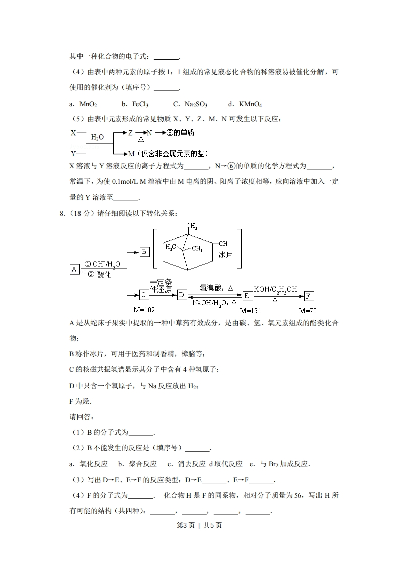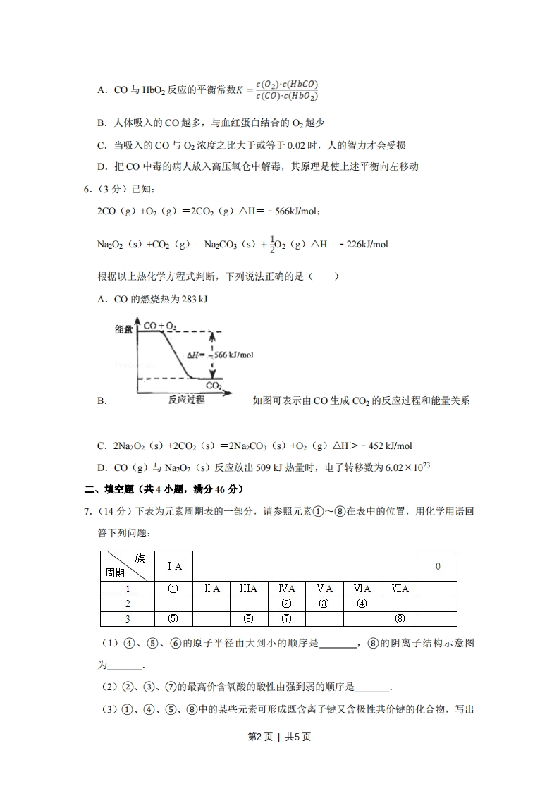 2009年天津市高考化学试卷一、选择题(共6小题,每小题3分,满分18分)1.(3分)化学与生活密切相关,下列有关说法正确的是()A.维生素C具有还原性,在人体内起抗氧化作用B.糖类、蛋白质、油脂都属于天然高分子化合物C.煤经气化和液化两个物理变化过程,可变为清洁能源D.制作航天服的聚酯纤维和用于光缆通信的光导纤维都是新型无机非金属材料2.(3分)25℃时,浓度均为02mol/L的NaHCO3和Na2CO3溶液中,下列判断不正确的是()A.均存在电离平衡和水解平衡B.存在的粒子种类相同C.c(OH)前者大于后者D.分别加入NaOH固体,恢复到原温度,c(CO32~)均增大3.(3分)下列实验设计和结论相符的是()A.将碘水倒入分液漏斗,加适量乙醇,振荡后静置,可将碘萃取到乙醇中B.某气体能使湿润的红色石蕊试纸变蓝,该气体水溶液一定显碱性C.某无色溶液中加Ba(NO3)2溶液,再加入稀盐酸,沉淀不溶解,则原溶液中一定有S042-D.在含FeCl2杂质的FeCl3溶液中通足量Ch后,充分加热,除去过量的Cl2,即可得到较纯净的FeCl3溶液4.(3分)下列叙述正确的是()A.0.1moLC6H5ONa溶液中:c(Na)>c(C6H5O)>c(Ht)>c(OH-)B.Na2CO3溶液加水稀释后,恢复至原温度,pH和Kw均减小C.pH=5的CH3COOH溶液和pH=5的NH4CI溶液中,c(H)不相等D.在Na2S溶液中加入AgCI固体,溶液中c(s2-)下降5.(3分)人体血液内的血红蛋白(Hb)易与O2结合生成HbO2,因此具有输氧能力,C0吸入肺中发生反应:C0+HbO2=O2+HbC0,37℃时,该反应的平衡常数K=220.HbC0的浓度达到HbO2浓度的0.02倍,会使人智力受损。据此,下列结论错误的是()第1页|共5页A.C0与HbO2反应的平衡常数K=SC2c(HbCOc(CO)-c(Hb02)B.人体吸入的CO越多,与血红蛋白结合的O2越少C.当吸入的C0与O2浓度之比大于或等于0.02时,人的智力才会受损D.把CO中毒的病人放入高压氧仓中解毒,其原理是使上述平衡向左移动6.(3分)己知:2C0(g)+02(g)=2C02(g)△H=-566kJ/mol:Na202 (s)+CO2 (g)=Na2CO3 (s)+02 (g)AH=-226kJ/mol根据以上热化学方程式判断,下列说法正确的是()A.C0的燃烧热为283kJ能量c0.--△-=566kJ/molCOB反应过程如图可表示由C0生成CO2的反应过程和能量关系C.2Na2O2 (s)+2CO2 (s)=2Na2CO3 (s)+02 (g)AH>-452 kJ/molD.C0(g)与Na202(s)反应放出509kJ热量时,电子转移数为6.02×1023二、填空题(共4小题,满分46分)7.(14分)下表为元素周期表的一部分,请参照元素①~⑧在表中的位置,用化学用语回答下列问题:族周期IA01①IIAIIIANAVAVIAVIA2②③④3⑤⑥⑦⑧(1)④、⑤、⑥的原子半径由大到小的顺序是⑧的阴离子结构示意图为(2)②、③、⑦的最高价含氧酸的酸性由强到弱的顺序是(3)①、④、⑤、⑧中的某些元素可形成既含离子键又含极性共价键的化合物,写出第2页|共5页其中一种化合物的电子式:(4)由表中两种元素的原子按1:1组成的常见液态化合物的稀溶液易被催化分解,可使用的催化剂为(填序号)a.MnO2b.FeCl3C.Na2S03d.KMnO(5)由表中元素形成的常见物质X、Y、Z、M、N可发生以下反应:XH20+ZN+⑥的单质△+M(仅含非金属元素的盐)X溶液与Y溶液反应的离子方程式为,N→⑥的单质的化学方程式为常温下,为使0.1mol/LM溶液中由M电离的阴、阳离子浓度相等,应向溶液中加入一定量的Y溶液至8.(18分)请仔细阅读以下转化关系:HOHBCH冰片①OH /H,OA②酸化一定条*件送虞氢溴酸,△KOH/C,H,OHENa OH/H,O,△M=102M=151M=70A是从蛇床子果实中提取的一种中草药有效成分,是由碳、氢、氧元素组成的酯类化合物:B称作冰片,可用于医药和制香精,樟脑等:C的核磁共振氢谱显示其分子中含有4种氢原子:D中只含一个氧原子,与Na反应放出H2:F为烃请回答:(1)B的分子式为(2)B不能发生的反应是(填序号)a.氧化反应b.聚合反应c.消去反应d取代反应e.与Br2加成反应.(3)写出D→E、E→F的反应类型:D→E、E→F一(4)F的分子式为化合物H是F的同系物,相对分子质量为56,写出H所有可能的结构(共四种):第3页1共5页