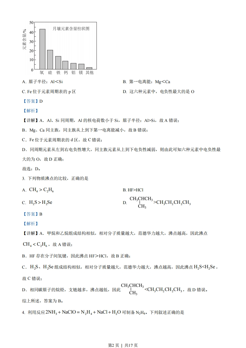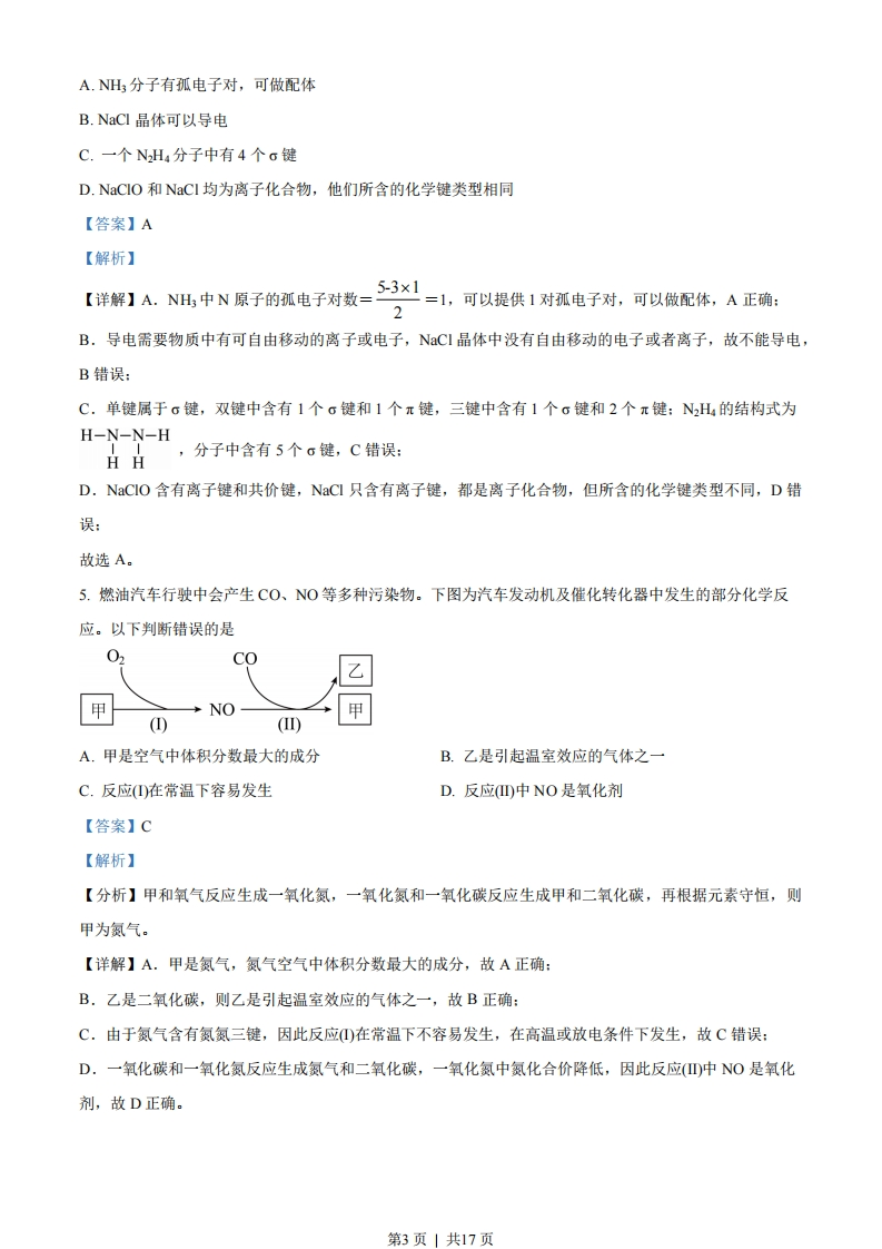2022年天津市普通高中学业水平等级性考试化学本试卷分为第I卷(选释题)和第Ⅱ卷(非选释题)两部分,共100分,考试用时60分钟。第1卷1至4页,第Ⅱ卷5至8页。答卷前,考生务必将自己的姓名、考生号、考场号和座位号填写在答题卡上,并在规定位置粘贴考试用条形码。答卷时,考生务必将答案涂写在答题卡上,答在试卷上的无效。考试结束后,将本试卷和答题卡一并交回。以下数据可供解题时参考:相对原子质量:H1C12016Na23第I卷注意事项:1.每题选出答案后,用铅笔将答题卡上对应题目的答案标号涂黑。如需改动,用橡皮擦干净后,再选涂其他答案标号。2.本卷共12题,每题3分,共36分。在每题所给出的四个选项中,只有一项是最符合题目要求的。1.近年我国在科技领域不断取得新成就。对相关成就所涉及的化学知识理解错误的是A.我国科学家实现了从二氧化碳到淀粉的人工合成,淀粉是一种单糖B.中国“深海一号”平台成功实现从深海中开采石油和天然气,石油和天然气都是混合物C.我国实现了高性能纤维锂离子电池的规模化制备,锂离子电池放电时将化学能转化为电能D.以硅树脂为基体的自供电软机器人成功桃战马里亚纳海沟,硅树脂是一种高分子材料【答案】A【解析】【详解】A.淀粉是一种多糖,故A错误:B.石油主要是各种烷烃、环烷烃、芳香烃的混合物,天然气主要含甲烷,还有少量的其他烷烃气体,因此天然气是混合物,故B正确:C.锂离子电池放电属于原电池,是将化学能转化为电能,故C正确:D.硅树脂是高聚物,属于高分子材料,故D正确。综上所述,答案为A。2.嫦娥5号月球探测器带回的月壤样品的元素分析结果如图,下列有关含量前六位元素的说法正确的是第1页」共17页A.NH3分子有孤电子对,可做配体B.NaCl晶体可以导电C.一个N2H4分子中有4个G键D.NaCIo和NaCI均为离子化合物,他们所含的化学键类型相同【答案】A【解析】【详解】A.NH中N原子的孤电子对数=5-3×12=1,可以提供1对孤电子对,可以做配体,A正确:B.导电需要物质中有可自由移动的离子或电子,NCI晶体中没有自由移动的电子或者离子,故不能导电,B错误:C.单键属于σ键,双键中含有1个σ键和1个π键,三键中含有1个σ键和2个π键:N2H的结构式为H-N-N-HHH,分子中含有5个c键,C错误:D.NaClO含有离子键和共价键,NaCI只含有离子键,都是离子化合物,但所含的化学键类型不同,D错误:故选A。5.燃油汽车行驶中会产生CO、NO等多种污染物。下图为汽车发动机及催化转化器中发生的部分化学反应。以下判断错误的是05NO(①)A.甲是空气中体积分数最大的成分B.乙是引起温室效应的气体之一C.反应(①在常温下容易发生D.反应四中NO是氧化剂【答案】C【解析】【分析】甲和氧气反应生成一氧化氮,一氧化氮和一氧化碳反应生成甲和二氧化碳,再根据元素守恒,则甲为氮气。【详解】A.甲是氮气,氮气空气中体积分数最大的成分,故A正确:B.乙是二氧化碳,则乙是引起温室效应的气体之一,故B正确:C.由于氮气含有氮氮三键,因此反应①在常温下不容易发生,在高温或放电条件下发生,故C错误:D.一氧化碳和一氧化氮反应生成氮气和二氧化碳,一氧化氮中氮化合价降低,因此反应(⑩中NO是氧化剂,故D正确。第3页共17页