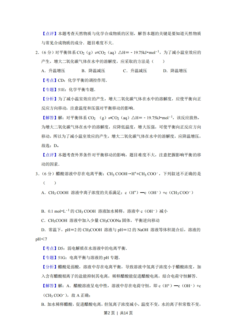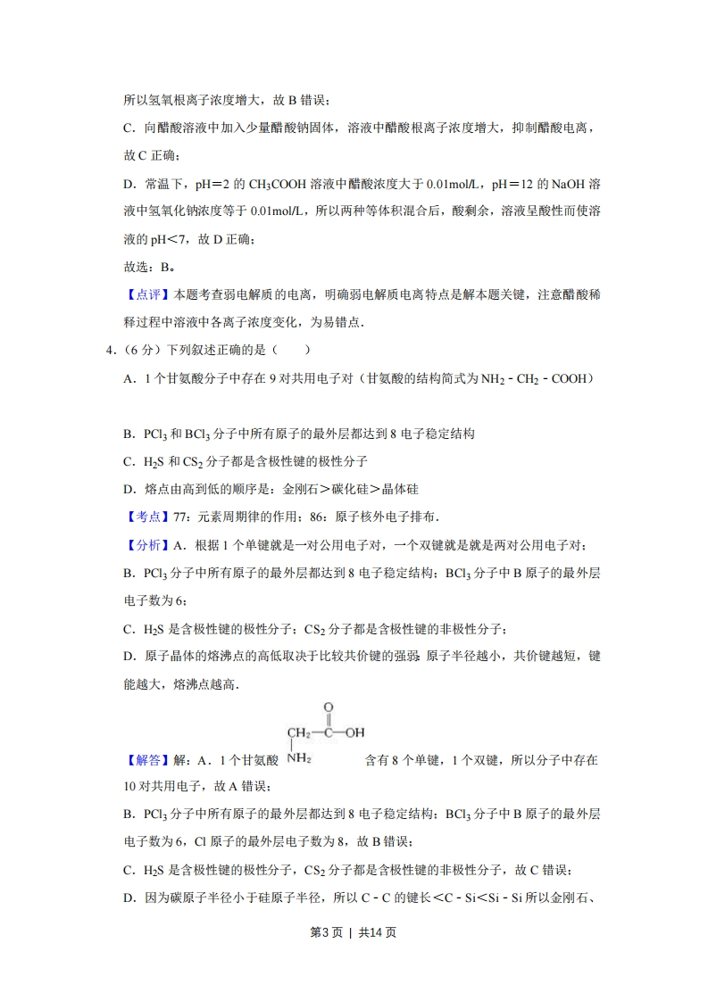 2008年天津市高考化学试卷解析版事考答案与试题佩折一、选择题(共7小题,每小题6分,满分42分)1.(6分)二十世纪化学合成技术的发展对人类健康水平和生活质量的提高做出了巨大贡献.下列各组物质全部由化学合成得到的是()A.玻璃纤维素青霉素B.尿素食盐聚乙烯C.涤纶洗衣粉阿司匹林D.石英橡胶磷化铟【考点】L2:合成材料【专题】538:有机化合物的获得与应用,【分析】A.纤维素有天然存在的、青霉菌产生青霉素:B.食盐也是天然存在的,如海盐、井盐、岩盐等:C.合成材料主要包括塑料、合成纤维、合成橡胶,如涤沦,洗衣粉,阿斯匹林也是由化学合成而得:D.石英是天然存在的,是地球表面分布最广的矿物之一:【解答】解:A,纯碱、石灰石、石英为原料可制普通玻璃:纤维素有天然存在的,例如棉花中含有纤维素,青霉素是一种著名的抗生素,它是由真菌中的青霉菌产生的,可以治疗多种细菌性疾病,也可人工合成,故A错误:B.尿液和汗液中都有尿素,人工也可合成化肥尿素海水中含有大量食盐,所以食盐是天然存在的:聚乙烯是人工合成的,故B错误:C.涤沦是三大合成之一洗衣粉的主要成分是十二烷基苯磺酸钠添加表面活性剂、助洗剂人工合成:阿斯匹林又名乙酰水杨酸具有退热、镇痛作用,常用于治疗伤风、感冒、头痛、神经痛及风湿性关节痛,可由邻~溴苯甲酸和乙酸反应制取,也可由水杨酸)和乙酸直接通过酯化反应合成,所以涤沧,洗衣粉,阿斯匹林全部由化学合成得到的,故C正确:D.石英主要成分是二氧化硅,是一种物理性质和化学性质均十分稳定的矿产资源,天然存在的,故D错误:故选:C。第1页1共14页【点评】本题考查天然物质与化学合成物质的区别,解答本题的关键是要知道天然物质与常见合成物质的成分.题目难度不大,2.(6分)对平衡体系C02(g)=C02(aq)△H=-19.75kmol1,为了减小温室效应的产生,增大二氧化碳气体在水中的溶解度,应采取的方法是()A.升温增压B.降温减压C.升温减压D.降温增压【考点】CD:化学平衡的调控作用.【专题】51E:化学平衡专题,【分析】为了减小温室效应的产生,增大二氧化碳气体在水中的溶解度,应使平衡向正反应方向移动,注意温度和压强对平衡移动的影响.【解答】解:对平衡体系C02(g)=C02(aq)△H=-19.75k小moll,该反应放热,为增大二氧化碳气体在水中的溶解度,应降低温度,增大压强,可使平衡向正反应方向移动,所以为了减小温室效应的产生,增大二氧化碳气体在水中的溶解度,应降温增压,故选:D。【点评】本题考查外界条件对平衡移动的影响,题目难度不大,注意把握影响平衡的移动的因素。3.(6分)醋酸溶液中存在电离平衡:CH;COOH一→H+CH;COO~,,下列叙述不正确的是()A.CH3 COOH溶液中离子浓度的关系满足:c(H)一℃(OH)+c(CH3COO~)B.0.1molL1的CH3COOH溶液加水稀释,溶液中c(OH~)减小C.CH3COOH溶液中加入少量CH3COONa固体,平衡逆向移动D.常温下,pH=2的CH3COOH溶液与pH=12的NaOH溶液等体积混合后,溶液的pH<7【考点】D5:弱电解质在水溶液中的电离平衡.【专题】51G:电离平衡与溶液的pH专题,【分析】醋酸是弱酸,溶液中存在电离平衡,导致溶液中氢离子浓度小于醋酸浓度,加入含有醋酸根离子的盐能抑制其电离,稀释醋酸能促进醋酸电离,结合电荷守恒解答,【解答】解:A.醋酸溶液呈电中性,溶液中存在电荷守恒,即c(H)一℃(OH)+C(CH3 COO),故A正确:B.加水稀释醋酸,促进醋酸电离,但氢离子浓度减小,温度不变,水的离子积常数不变,第2页|共14页所以氢氧根离子浓度增大,故B错误:C.向醋酸溶液中加入少量醋酸钠固体,溶液中醋酸根离子浓度增大,抑制醋酸电离,故C正确:D.常温下,pH=2的CH3COOH溶液中醋酸浓度大于0.01molL,pH=12的NaOH溶液中氢氧化钠浓度等于0.01mol/L,所以两种等体积混合后,酸剩余,溶液呈酸性而使溶液的pH<7,故D正确:故选:B。【点评】本题考查弱电解质的电离,明确弱电解质电离特点是解本题关键,注意醋酸稀释过程中溶液中各离子浓度变化,为易错点。4.(6分)下列叙述正确的是()A.1个甘氨酸分子中存在9对共用电子对(甘氨酸的结构简式为NH2-CH2-COOH)B.PCl3和BC3分子中所有原子的最外层都达到8电子稳定结构C.H2S和CS2分子都是含极性键的极性分子D.熔点由高到低的顺序是:金刚石>碳化硅>晶体硅【考点】77:元素周期律的作用:86:原子核外电子排布.【分析】A.根据1个单键就是一对公用电子对,一个双键就是就是两对公用电子对:B.PC3分子中所有原子的最外层都达到8电子稳定结构:BC3分子中B原子的最外层电子数为6:C.H2S是含极性键的极性分子:CS2分子都是含极性键的非极性分子:D.原子晶体的熔沸点的高低取决于比较共价键的强弱原子半径越小,共价键越短,键能越大,熔沸点越高。CH2-OH【解答】解:A.1个甘氨酸NH2含有8个单键,1个双键,所以分子中存在10对共用电子,故A错误:B.PC3分子中所有原子的最外层都达到8电子稳定结构:BC3分子中B原子的最外层电子数为6,CI原子的最外层电子数为8,故B错误:C.HS是含极性键的极性分子,CS2分子都是含极性键的非极性分子,故C错误:D.因为碳原子半径小于硅原子半径,所以C-C的键长
