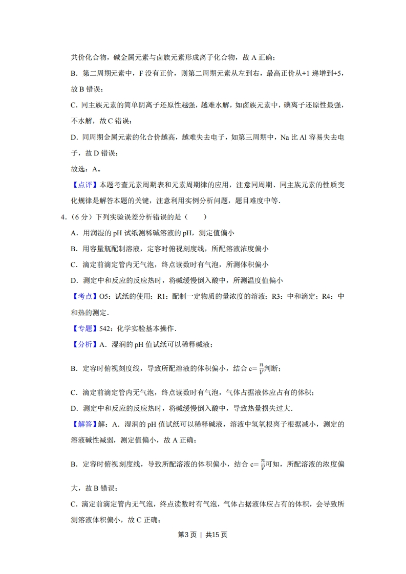 2013年天津市高考化学试卷解析版事考答案与试题佩折一、本卷共6题,每题6分,共36分、.在每题给出的四个选项中,只有一项是最符合题目要求的,1.(6分)运用有关概念判断下列叙述正确的是()A.1molH2燃烧放出的热量为H2的燃烧热B.Na2SO3与H2O2的反应为氧化还原反应C.广o和〉-CH2-OH互为同系物D.BaSO4的水溶液不易导电,故BaSO4是弱电解质【考点】B1:氧化还原反应:BC:燃烧热:D1:电解质与非电解质:I2:芳香烃、烃基和同系物.【分析】A.根据物质的状态分析:B.根据化合价变化分析:C.根据同系物的特征分析:D.溶液的导电能力与强、弱电解质没有必然的联系.【解答】解:A.1mol氢气燃烧生成液态水时放出的热量为氢气的燃烧热,故A错误:B.亚硫酸钠有还原性,双氧水具有氧化性,二者发生氧化还原反应,故B正确:C.苯酚和苯甲醇不属于同一类物质,不是同系物,故C错误:D.硫酸钡属于难溶强电解质,故D错误:故选:B。【点评】本题考查燃烧热的概念,1mol纯物质完全燃烧生成稳定的氧化物所释放的热量即为燃烧热2.(6分)以下食品化学知识的叙述不正确的是()A.食盐可作调味剂,也可作食品防腐剂B.新鲜蔬菜做熟后,所含维生素C会有损失C.纤维素在人体内可水解为葡萄糖,故可作人类的营养物质D.葡萄中的花青素在碱性环境下显蓝色,故可用苏打粉检验假红酒【考点】K1:葡萄糖的性质和用途:K8:人体必需的维生素的主要来源及其摄入途径:KF:常见的食品添加剂的组成、性质和作用第1页1共15页【专题】538:有机化合物的获得与应用,【分析】A.食盐具有咸味,食盐腌制食品,以抑制细菌的滋生,常用作调味品和防腐剂B.维生素C加热烹调处理、浸水等,都会让蔬菜的维生素C大幅度减少,维生素C呈酸性,加热或在溶液中易氧化分解,在碱性条件下更易被氧化:C.纤维素在人体中不水解,不能被人体吸收:D.苏打是碳酸钠,依据葡萄中的花青素在碱性环境下显蓝色信息进行解答:【解答】解:A.食盐腌制食品,食盐进入食品内液产生浓度差,形成细菌不易生长的环境,可作防腐剂,食盐具有咸味,所以食盐可作调味剂,也可作食品防腐剂,故A正确B.维生素C又叫抗坏血酸,主要存在于新鲜蔬菜、水果中,“维生素C”受热时易被破坏,应采取凉拌生食、或不要煮过长时间,故B正确:C.人体内不含水解纤维素的酶,所以不能消化纤维素,因此纤维素不能被分解提供能量,故C错误:D.苏打是碳酸钠,碳酸钠水解,C032-+H20=HCO3ˉ+OH~,HCO3ˉ+H2O=H2CO3+OH·溶液呈碱性,依据葡萄中的花青素在碱性环境下显蓝色信息可知,如果是假红酒,就没有葡萄糖,就不显蓝色,所以可用苏打粉检验假红酒,故D正确:故选:C。【点评】本题主要考查了生活中的化学,依据相关的知识即可解答,平时注意生活中的化学知识的积累,题目难度不大3.(6分)下列有关元素的性质及其递变规律正确的是()A.IA族与IA族元素间可形成共价化合物或离子化合物B.第二周期元素从左到右,最高正价从+1递增到+7C.同主族元素的简单阴离子还原性越强,水解程度越大D.同周期金属元素的化合价越高,其原子失电子能力越强【考点】72:元素周期表的结构及其应用【专题】51C:元素周期律与元素周期表专题.【分析】A.IA族为H和碱金属,IA族元素为非金属元素:B.第二周期元素中,F没有正价:C.同主族元素的简单阴离子还原性越强,越难水解:D.同周期金属元素的化合价越高,越难失去电子.【解答】解:A.IA族为H和碱金属,IA族元素为非金属元素,H与卤族元素形成第2页|共15页共价化合物,碱金属元素与卤族元素形成离子化合物,故A正确:B.第二周期元素中,F没有正价,则第二周期元素从左到右,最高正价从+1递增到+5,故B错误:C.同主族元素的简单阴离子还原性越强,越难水解,如卤族元素中,碘离子还原性最强,不水解,故C错误:D.同周期金属元素的化合价越高,越难失去电子,如第三周期中,Na比A!容易失去电子,故D错误:故选:A。【点评】本题考查元素周期表和元素周期律的应用,注意同周期、同主族元素的性质变化规律是解答本题的关键,注意利用实例分析问题,题目难度中等.4.(6分)下列实验误差分析错误的是()A.用润湿的pH试纸测稀碱溶液的pH,测定值偏小B.用容量瓶配制溶液,定容时俯视刻度线,所配溶液浓度偏小C.滴定前滴定管内无气泡,终点读数时有气泡,所测体积偏小D.测定中和反应的反应热时,将碱缓慢倒入酸中,所测温度值偏小【考点】O5:试纸的使用:R1:配制一定物质的量浓度的溶液:R3:中和滴定:R4:中和热的测定。【专题】542:化学实验基本操作.【分析】A.湿润的pH值试纸可以稀释碱液:B.定容时俯视刻度线,导致所配溶液的体积偏小,结合c=判断:C.滴定前滴定管内无气泡,终点读数时有气泡,气体占据液体应占有的体积:D.测定中和反应的反应热时,将碱缓慢倒入酸中,导致热量损失过大。【解答】解:A.湿润的pH值试纸可以稀释碱液,溶液中氢氧根离子根据减小,测定的溶液碱性减弱,测定值偏小,故A正确:B。定容时俯视刻度线,导致所配溶液的体积偏小,结合c=可知,所配溶液的浓度偏大,故B错误:C.滴定前滴定管内无气泡,终点读数时有气泡,气体占据液体应占有的体积,会导致所测溶液体积偏小,故C正确:第3页1共15页