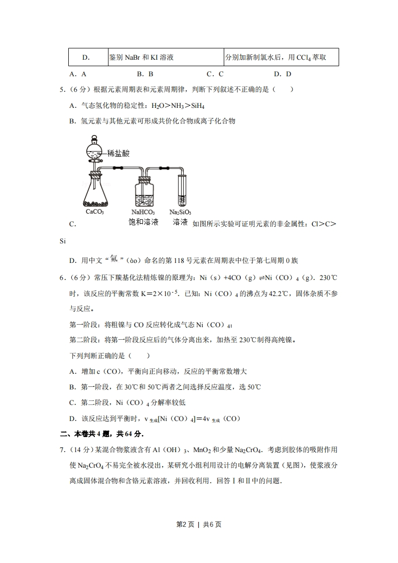 D.鉴别NaBr和KI溶液分别加新制氯水后,用CC4萃取A.AB.BC.CD.D5.(6分)根据元素周期表和元素周期律,判断下列叙述不正确的是()A.气态氢化物的稳定性:H2O>NH3>SiH4B.氢元素与其他元素可形成共价化合物或离子化合物稀盐酸色88o时CaCO3NaHCO3NanSiOC饱和溶液溶液如图所示实验可证明元素的非金属性:CI>C>SiD.用中文“氯”(à0)命名的第118号元素在周期表中位于第七周期0族6.(6分)常压下羰基化法精炼镍的原理为:Ni(s)+4C0(g)=Ni(C0)4(g).230℃时,该反应的平衡常数K=2×10~5.已知:Ni(C0)4的沸点为42.2℃,固体杂质不参与反应。第一阶段:将粗镍与CO反应转化成气态Ni(CO)4:第二阶段:将第一阶段反应后的气体分离出来,加热至230℃制得高纯镍。下列判断正确的是()A.增加c(CO),平衡向正向移动,反应的平衡常数增大B.第一阶段,在30℃和50℃两者之间选择反应温度,选50℃C.第二阶段,Ni(CO)4分解率较低D.该反应达到平衡时,V生成Ni(CO)=4V生成(CO)二、本卷共4题,共64分.7.(14分)某混合物浆液含有A1(OH)3、MnO2和少量N2CrO4.考虑到胶体的吸附作用使N2CO4不易完全被水浸出,某研究小组利用设计的电解分离装置(见图),使浆液分离成固体混合物和含铬元素溶液,并回收利用.回答I和Ⅱ中的问题。第2页丨共6页搅拌桨NaOH溶液沉淀-固体+A固体溶液混合物混合物浆液围体@CNa,S0,溶液阳离子肢阴离子膜Na,s0,溶液固体混合物分离利用的流程图【,固体混合物的分离和利用(流程图中的部分分离操作和反应条件未标明)(1)反应①所加试剂NaOH的电子式为·B→C的反应条件为,C→AI的制备方法称为(2)该小组探究反应②发生的条件.D与浓盐酸混合,不加热,无变化:加热有C2生成,当反应停止后,固体有剩余,此时滴加硫酸,又产生C2,由此判断影响该反应有效进行的因素有(填序号)a.温度b.C的浓度c.溶液的酸度(3)0.1molC2与焦炭、TiO2完全反应,生成一种还原性气体和一种易水解成TiO2xH20的液态化合物,放热4.28kJ,该反应的热化学方程式为Ⅱ含铬元素溶液的分离和利用(4)用惰性电极电解时,CO42~能从浆液中分离出来的原因是分离后含铬元素的粒子是一:阴极室生成的物质为(写化学式).8.(18分)2-氨基-3-氯苯甲酸(F)是重要的医药中间体,其制备流程图如下:浓HNO,CHCHyCOOH浓HSO4,△浓H,SO,△NO2 KMnO /H*ANO2 HH2ONO2 Fe/HCI①②③④SO HBCOOH OCOOH OCOOHNHCCH,浓H,SO4.△NHCCHHH2ONHEFe/HCI己知:回答下列问题:第3页|共6页