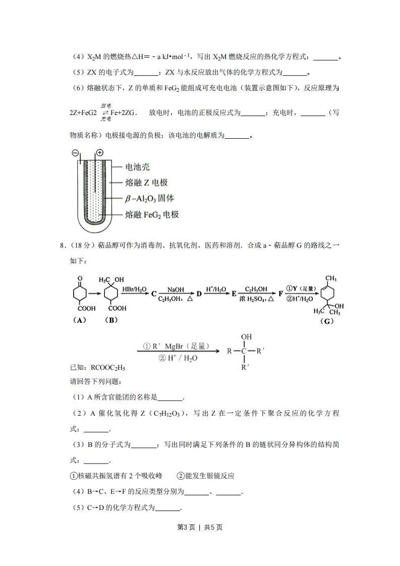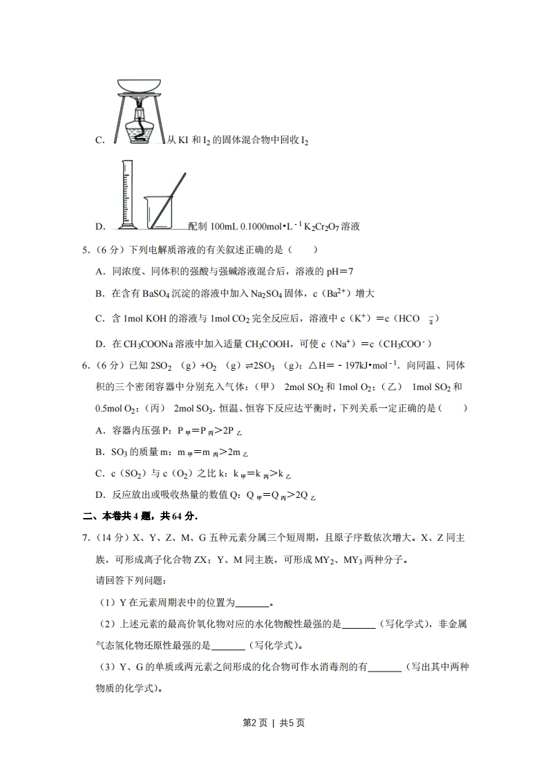 2012年天津市高考化学试卷一、每题6分,共36分,只有一项是最符合题目要求的.1.(6分)根据下列物质的化学性质,判断其应用错误的是()A.酒精能使蛋白质变性,可用于杀菌消毒B.CO能与SO2反应,可作工业废气的脱硫剂C.明矾水解时产生具有吸附性的胶体粒子,可作漂白剂D.镧镍合金能大量吸收H形成金属氢化物,可作储氢材料2.(6分)下列单质或化合物性质的描述正确的是()A.NaHO4水溶液显中性B.SiO2与酸、碱均不反应C.NO2溶于水时发生氧化还原反应D.Fe在足量Cl2中燃烧生成FeCh和FeCl33.(6分)下列叙述正确的是()A.乙酸与丙二酸互为同系物B.不同元素的原子构成的分子只含极性共价键C.U和U是中子数不同质子数相同的同种核素D.短周期第VA与IA族元素的原子间构成的分子,均满足原子最外层8电子结构4.(6分)完成下列实验所选择的装置或仪器(夹持装置己略去)正确的是()A用CCl4提取溴水中的Br2B.除去乙醇中的苯酚第1页1共5页从KI和I2的固体混合物中回收I20配制100mL0.1000molL-1K2Cr207溶液5.(6分)下列电解质溶液的有关叙述正确的是()A.同浓度、同体积的强酸与强碱溶液混合后,溶液的pH=7B.在含有BaSO4沉淀的溶液中加入Na2SO4固体,c(Ba+)增大C.含1mol KOH的溶液与1mol CO2完全反应后,溶液中c(K*)=c(HC0三)D.在CH3 COONa溶液中加入适量CH3COOH,可使c(Na)=c(CH3COO~)6.(6分)己知2S02(g)+02(g)=2S03(g):△H=-197 kJ*mol-1.向同温、同体积的三个密闭容器中分别充入气体:(甲)2molS02和1mol02:(乙)1molS02和0.5mol02:(丙)2molS03.恒温、恒容下反应达平衡时,下列关系一定正确的是()A.容器内压强P:P甲=P丙>2PzB.S03的质量m:m甲=m丙>2mzC.c(SO2)与c(O2)之比k:k甲=k丙>kzD.反应放出或吸收热量的数值Q:Q甲=Q两>2Qz二、本卷共4题,共64分.7.(14分)X、Y、Z、M、G五种元素分属三个短周期,且原子序数依次增大。X、Z同主族,可形成离子化合物ZX:Y、M同主族,可形成MY2、MY3两种分子。请回答下列问题:(1)Y在元素周期表中的位置为(2)上述元素的最高价氧化物对应的水化物酸性最强的是」(写化学式),非金属气态氢化物还原性最强的是」(写化学式).(3)Y、G的单质或两元素之间形成的化合物可作水消毒剂的有」(写出其中两种物质的化学式)。第2页1共5页