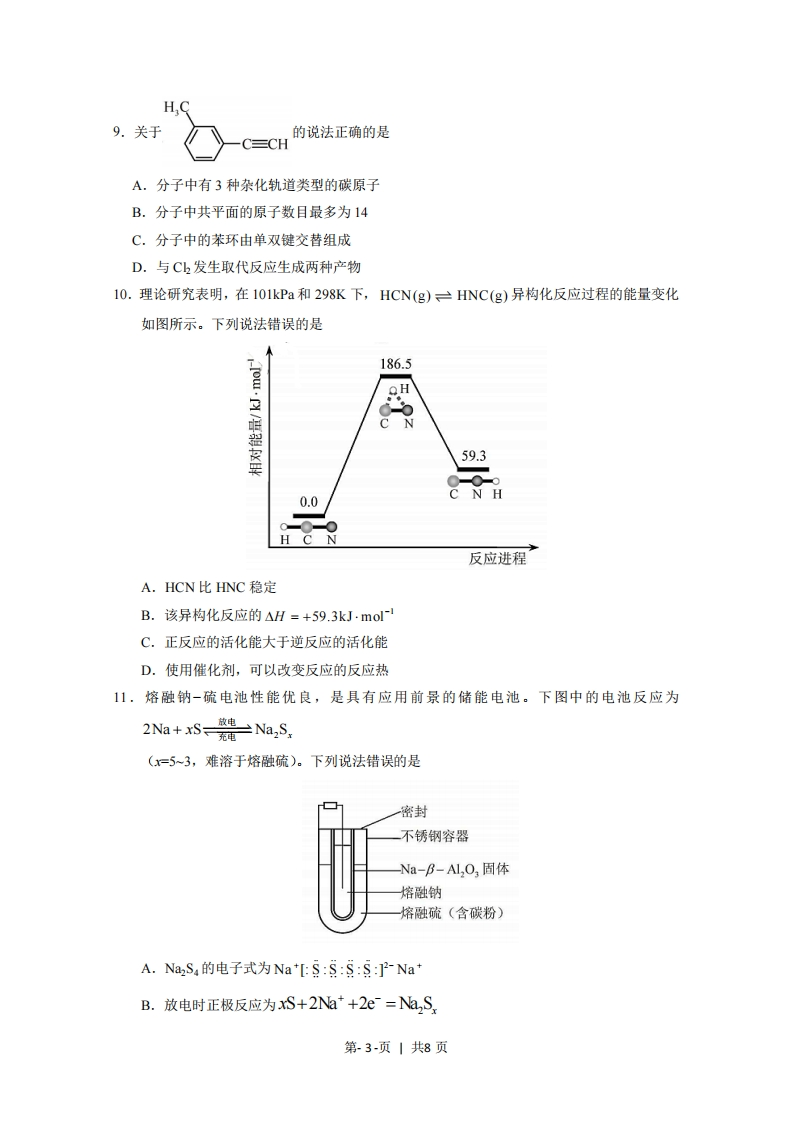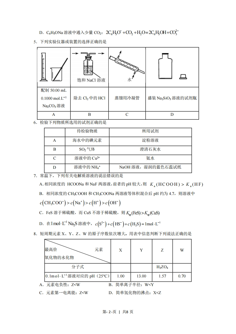 D.C6H,0Na溶液中通入少量C02:2CHO+CO2+H,0=2C,HOH+CO5.下列实验仪器或装置的选择正确的是饱和NaCI溶液配制50.00mL0.1000mol.L-1除去C2中的HCI蒸馏用冷凝管盛装Na2SiO3溶液的试剂瓶Na2CO3溶液BCD6.检验下列物质所选用的试剂正确的是待检验物质所用试剂海水中的碘元素淀粉溶液BS02气体澄清石灰水C溶液中的Cu2+氨水D溶液中的NHNaOH溶液,湿润的蓝色石蕊试纸7.常温下,下列有关电解质溶液的说法错误的是A.相同浓度的HCOONa和NaF两溶液,前者的pH较大,则K,(HCOOH)>K,(HF)B.相同浓度的CH;COOH和CH:COONa两溶液等体积混合后pH约为4.7,则溶液中c(CH,COO)>c(Na*)>c(H*)>c(OH)C.FeS溶于稀硫酸,而CuS不溶于稀硫酸,则K(FeS>Kn(CuSD.在1 mol.L Na2S溶液中,c(S2-)+c(Hs)+c(H,S)=lmol-L8.短周期元素X、Y、Z、W的原子序数依次增大。用表中信息判断下列说法正确的是最高价元素W氧化物的水化物分子式H3ZOa0.1mol·L1溶液对应的pH(25℃)1.0013.001.570.70A.元素电负性:Z