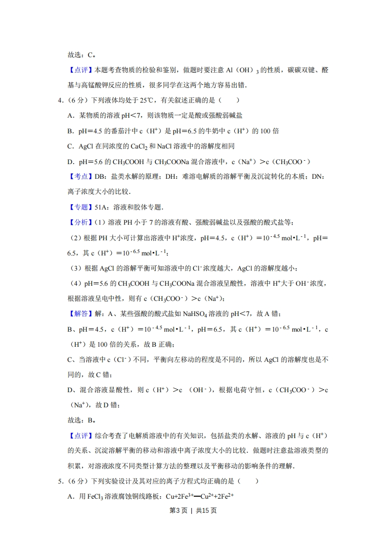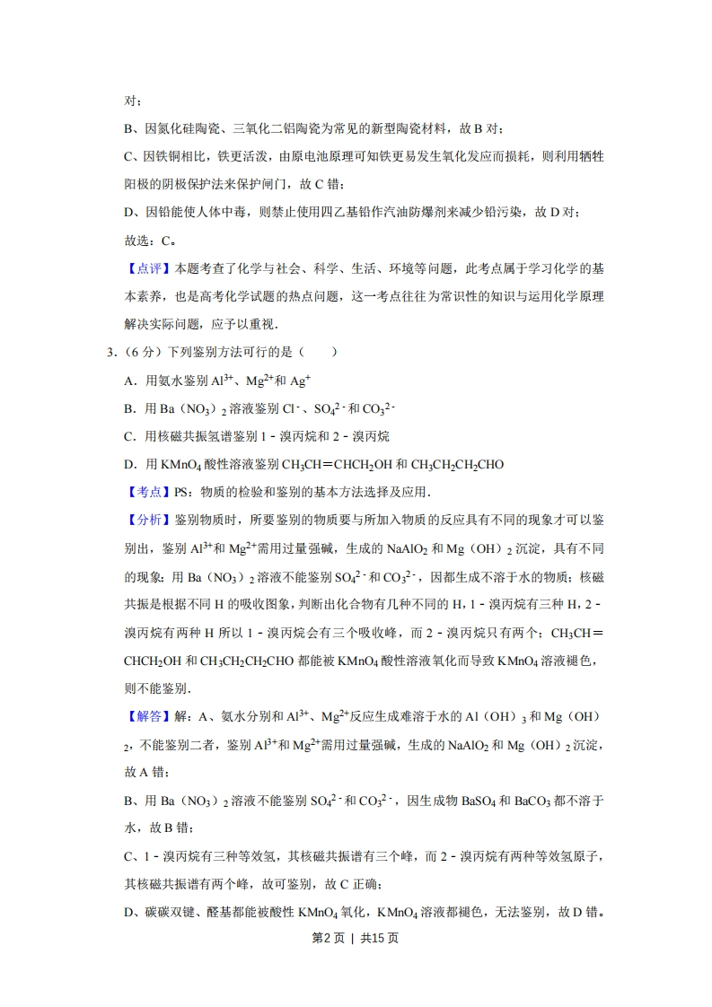 对:B、因氮化硅陶瓷、三氧化二铝陶瓷为常见的新型陶瓷材料,故B对:C、因铁铜相比,铁更活泼,由原电池原理可知铁更易发生氧化发应而损耗,则利用牺牲阳极的阴极保护法来保护闸门,故C错:D、因铅能使人体中毒,则禁止使用四乙基铅作汽油防爆剂来减少铅污染,故D对:故选:C。【点评】本题考查了化学与社会、科学、生活、环境等问题,此考点属于学习化学的基本素养,也是高考化学试题的热点问题,这一考点往往为常识性的知识与运用化学原理解决实际问题,应予以重视3.(6分)下列鉴别方法可行的是()A.用氨水鉴别AI+、Mg2+和AgB.用Ba(NO3)2溶液鉴别C-、SO42-和CO32C.用核磁共振氢谱鉴别1-溴丙烷和2-溴丙烷D.用KMnO4酸性溶液鉴别CHCH=CHCH2OH和CHCH2CH2CHO【考点】PS:物质的检验和鉴别的基本方法选择及应用【分析】鉴别物质时,所要鉴别的物质要与所加入物质的反应具有不同的现象才可以鉴别出,鉴别A#和Mg+需用过量强碱,生成的NaAlO2和Mg(OH)2沉淀,具有不同的现象:用Ba(NO3)2溶液不能鉴别SO42~和CO32~,因都生成不溶于水的物质:核磁共振是根据不同H的吸收图象,判断出化合物有几种不同的H,1-溴丙烷有三种H,2-溴丙烷有两种H所以1-溴丙烷会有三个吸收峰,而2-溴丙烷只有两个:CH3CH=CHCH2OH和CH3CH2CH2CHO都能被KMnO4酸性溶液氧化而导致KMnO4溶液褪色,则不能鉴别.【解答】解:A、氨水分别和AI+、Mg+反应生成难溶于水的AI(OH)3和Mg(OH)2,不能鉴别二者,鉴别A3+和Mg2+需用过量强碱,生成的NaAlO2和Mg(OH)2沉淀,故A错:B、用Ba(NO3)2溶液不能鉴别SO42~和CO32·,因生成物BaSO4和BaCO3都不溶于水,故B错:C、1-溴丙烷有三种等效氢,其核磁共振谱有三个峰,而2-溴丙烷有两种等效氢原子,其核磁共振谱有两个峰,故可鉴别,故C正确:D、碳碳双键、醛基都能被酸性KMnO4氧化,KMnO4溶液都褪色,无法鉴别,故D错。第2页|共15页故选:C。【点评】本题考查物质的检验和鉴别,做题时要注意A!(OH)3的性质,碳碳双键、醛基与高锰酸钾反应的性质,很多同学在这两个地方容易出错,4.(6分)下列液体均处于25℃,有关叙述正确的是()A.某物质的溶液pH<7,则该物质一定是酸或强酸弱碱盐B.pH=4.5的番茄汁中c(H)是pH=6.5的牛奶中c(H)的100倍C.AgCl在同浓度的CaCl2和NaCl溶液中的溶解度相同D.pH=5.6的CH3COOH与CH3COONa混合溶液中,c(Na)>c(CH3COO·)【考点】DB:盐类水解的原理:DH:难溶电解质的溶解平衡及沉淀转化的本质:DN:离子浓度大小的比较.【专题】51A:溶液和胶体专题.【分析】(1)溶液PH小于7的溶液有酸、强酸弱碱盐以及强酸的酸式盐等:(2)根据PH大小可计算出溶液中H浓度,pH=4.5,c(H)=10~4.5molL1,pH=6.5,c (H)=10-6.5 mol.L-1;(3)根据AgCI的溶解平衡可知溶液中的C浓度越大,AgCI的溶解度越小:(4)pH=5.6的CH3COOH与CHCOONa混合溶液呈酸性,溶液中H大于OH浓度,根据溶液呈电中性,则有c(CH3COO~)>c(Na*):【解答】解:A、某些强酸的酸式盐如NHSO4溶液的pH<7,故A错:B、pH=4.5,c(Ht)=10-4.5 mol.L-I,pH=6.5,其c(H+)=106.5molL1,c(H)是100倍的关系,故B正确:C、当溶液中c(C)不同,平衡向左移动的程度是不同的,所以AgCI的溶解度也是不同的,故C错:D、混合溶液显酸性,则c(H)>c(OH~),根据电荷守恒,c(CHCOO)>c(Na),故D错:故选:B。【点评】综合考查了电解质溶液中的有关知识,包括盐类的水解、溶液的pH与c(H)的关系、沉淀溶解平衡的移动和溶液中离子浓度大小的比较.做题时注意盐溶液类型的积累,对溶液浓度不同类型计算方法的整理以及平衡移动的影响条件的理解.5.(6分)下列实验设计及其对应的离子方程式均正确的是()A.用FeC3溶液腐蚀铜线路板:Cu+2Fe3+一Cu2+2Fe2+第3页|共15页
