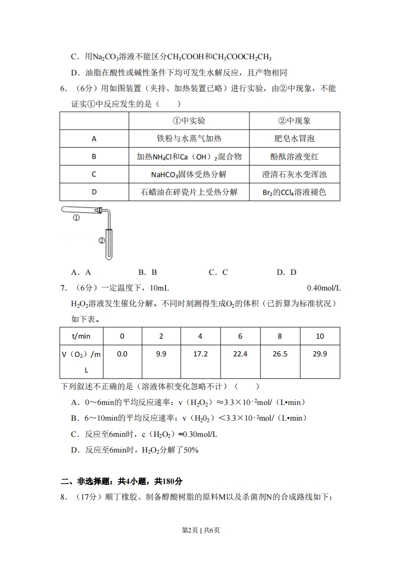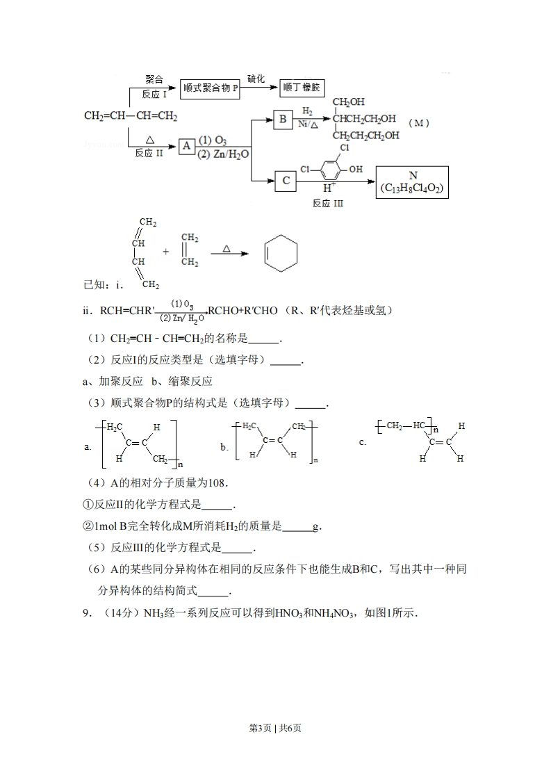 2014年北京市高考化学试卷一、选择题:共7小题,每小题6分,共120分.在每小题给出的四个选项中,选出最符合题目要求的一项.化利腐蚀品1.(6分)下列试剂中,标签上应标注和的是()A.C2HsOHB.HNO3C.NaOHD.HCI2.(6分)下列金属中,表面自然形成的氧化层能保护内层金属不被空气氧化的是()A.KB.NaC.FeD.Al3.(6分)下列电池工作时,O,在正极放电的是(锌锰电池B氢燃料电池:-0012铅蓄电池D镍镉电池4.(6分)下列解释事实的方程式不正确的是()A.测0.1molL氨水的pH为11:NHH2O=NH4+OHB.将Na块放入水中,产生气体:2Na+2HO一2NaOH+H2↑C.用CuCl2溶液做导电实验,灯泡发光:CuC2通电Cu2+2CID.A1片溶于NaOH溶液中,产生气体:2A1+2OH+2H20一2A1O2+3H215.(6分)下列说法正确的是()A.室温下,在水中的溶解度:丙三醇>苯酚>1-氯丁烷B.用核磁共振氢谱不能区分HCOOCH和HCOOCH2CH3第1页1共6页C.用Na2CO,溶液不能区分CHCOOH和CHCOOCH2CHD.油脂在酸性或碱性条件下均可发生水解反应,且产物相同6.(6分)用如图装置(夹持、加热装置已略)进行实验,由②中现象,不能证实①中反应发生的是()①中实验②中现象A铁粉与水蒸气加热肥皂水冒泡B加热NH4CI和Ca(OH)2混合物酚酞溶液变红CNaHCO3固体受热分解澄清石灰水变浑浊D石蜡油在碎瓷片上受热分解Br2的CCl4溶液褪色A.AB.BC.CD.D7.(6分)一定温度下,10mL0.40mo/LH202溶液发生催化分解。不同时刻测得生成O2的体积(已折算为标准状况)如下表。t/min026810V(02)/m0.09.917.222.426.529.9L下列叙述不正确的是(溶液体积变化忽略不计)()A.0~6min的平均反应速率:v(H202)≈3.3X10-2mol/(Lmin)B.6~l0min的平均反应速率:v(H202)<3.3X10-2mol/(Lmin)C.反应至6min时,c(HO2)=0.30mol/LD.反应至6min时,Hz02分解了50%二、非选释题:共4小题,共180分8.(17分)顺丁橡胶、制备醇酸树脂的原料M以及杀菌剂N的合成路线如下:第2页|共6页聚合硫化反应1顺式聚合物P顺丁橡胶CHOHCH2=CH一CH=CH2HBACHCHCHOH(M)r→囚820△CHCHCH2OHC1-OHN(C13HgC14O2)反应ⅢCH2HCH2+CHCH2已知:i.CH2ii.RCH=CHR'_(1)03RCHO+R'CHO(R、R'代表烃基或氢)(2)ZnH20(1)CH2=CH-CH=CH2的名称是(2)反应1的反应类型是(选填字母)a、加聚反应b、缩聚反应(3)顺式聚合物P的结构式是(选填字母)HO(4)A的相对分子质量为108,①反应I的化学方程式是②1molB完全转化成M所消耗H2的质量是g(5)反应Ⅲ的化学方程式是(6)A的某些同分异构体在相同的反应条件下也能生成B和C,写出其中一种同分异构体的结构简式9.(14分)NH经一系列反应可以得到HNO和NH4NO3,如图1所示.第3页|共6页