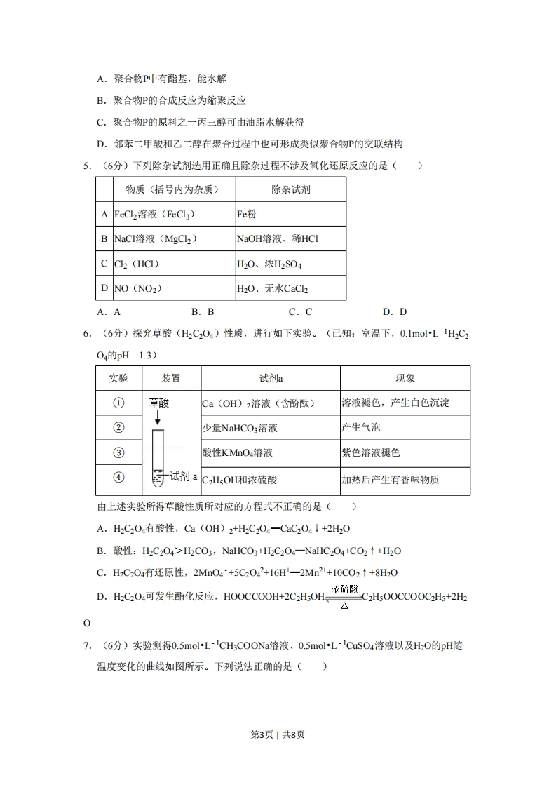 2019年北京市高考化学试卷一、选择题:本部分共7小题,每小题6分,共42分。在每小题列出的四个选项中,远出最符合题目要求的一项。1.(6分)下列我国科研成果所涉及材料中,主要成分为同主族元素形成的无机非金属材料的是()A.4.03米大口径碳化硅反射镜B.2022年冬奥会聚氨酯速滑服C.能屏蔽电磁波的碳包覆银纳米线D.“玉兔二号”钛合金筛网轮2.(6分)下列示意图与化学用语表述内容不相符的是(水合离子用相应离子符号表示)(NaC溶于水电解CuC1溶液A第1页|共8页@436k灯·moy以7国@假想中间能鐘@@G⊙)物质243kJ·mol7断裂键能量成@©@@酷酸8431k灯·mo1431k灯·mol1能量能量CHC0OH在水中电离H,与CL2反应能量变化CDA.NaCl-Na+CI-B.CuCh-Cu2++2CI-C.CH3COOH-CH3COO-+H+D.H2(g)+Cl2(g)一2HCl(g)△H=-183kJmo13.(6分)2019年是元素周期表发表150周年,期间科学家为完善周期表做出了不懈努力。中国科学院院士张青莲教授曾主持测定了钢(49)等9种元素相对原子质量的新值,被采用为国际新标准。铟与铷(3Rb)同周期。下列说法不正确的是()A.n是第五周期第ⅢA族元素B.115n的中子数与电子数的差值为1749C.原子半径:n>AID.碱性:In(OH)3>RbOH4.(6分)交联聚合物P的结构片段如图所示。下列说法不正确的是(图中V表示链延长)()wx-Y-X-YX-Y-X-Yw X-Y-X-Y-X-Y-X-YXX----nX为-0-CH2-CH-CH2-0-Y为第2页1共8页A.聚合物P中有酯基,能水解B.聚合物P的合成反应为缩聚反应C.聚合物P的原料之一丙三醇可由油脂水解获得D.邻苯二甲酸和乙二醇在聚合过程中也可形成类似聚合物P的交联结构5.(6分)下列除杂试剂选用正确且除杂过程不涉及氧化还原反应的是()物质(括号内为杂质)除杂试剂AFeCl2溶液(FeCl3)Fe粉BNaCI溶液(MgC2)NaOH溶液、稀HCICl (HCI)H20、浓H2S04DNO (NO2)HO、无水CaCl2A.AB.BC.CD.D6.(6分)探究草酸(H2C204)性质,进行如下实验。(己知:室温下,0.1molL-HC204的pH=1.3)实验装置试剂a现象①草酸Ca(OH)2溶液(含酚酞)溶液褪色,产生白色沉淀②少量NaHCO3溶液产生气泡③酸性KMnO4溶液紫色溶液褪色④目试剂aCHOH和浓硫酸加热后产生有香味物质由上述实验所得草酸性质所对应的方程式不正确的是(A.H2C204有酸性,Ca(OH)2+H2C204一CaC204+2H20B.酸性:H2C2O4>H2CO3,NaHCO3+H2C2O4-NaHC2O4+CO2↑+H2OC.H2C204有还原性,2MnO4+5C2042+16H一2Mn2++10C02↑+8H20浓硫酸D.H2C2O4可发生酯化反应,HOOCCOOH+2C2H5OHC2H500CCOOC2H5+2H207.(6分)实验测得0.5molL-lCH3 COONa溶液、0.5molL-CuSO4溶液以及H2O的pH随温度变化的曲线如图所示。下列说法正确的是()第3页1共8页