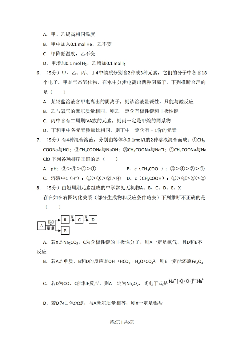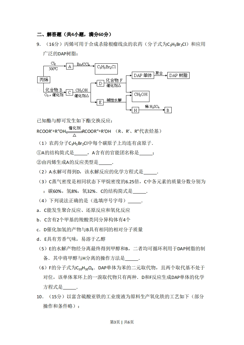 2009年北京市高考化学试卷一、选择题(共8小题,每小题5分,满分40分)1.(5分)化学与人类生活密切相关.下列说法正确的是()A.苯酚有一定毒性,不能作消毒剂和防腐剂B.白磷着火点高且无毒,可用于制造安全火柴C.油脂皂化生成的高级脂肪酸钠是肥皂的有效成分D.用食醋去除水壶中的水垢时所发生的是水解反应2.(5分)下列叙述不正确的是()A.铁表面镀锌,铁作阳极B.船底镶嵌锌块,锌作负极,以防船体被腐蚀C.钢铁吸氧腐蚀的正极反应:02+2H20+4e~=4OHD.工业上电解饱和食盐水的阳极反应:2C~-2e=C23.(5分)W、X、Y、Z均为短周期元素,W的最外层电子数与核外电子总数之比为7:17:X与W同主族:Y的原子序数是W和X的原子序数之和的一半:含Z元素的物质焰色反应为黄色.下列判断正确的是()A.金属性:Y>ZB.氢化物的沸点:X>WC.离子的还原性:X>WD.原子及离子半径:Z>Y>X4.(5分)下列叙述正确的是()A.将C02通入BaC2溶液中至饱和,无沉淀产生:再通入S02,产生沉淀B.在稀硫酸中加入铜粉,铜粉不溶解:再加入Cu(NO3)2固体,铜粉仍不溶C.向AICl3溶液中滴加氨水,产生白色沉淀:再加入过量NaHSO溶液,沉淀消失D.纯锌与稀硫酸反应产生氢气的速率较慢:再加入少量CuS04固体,速率不改变5.(5分)已知:H2(g)+H2(g)=2Hl(g):△H<0.有相同容积的定容密闭容器甲和乙,甲中加入H2和l2各0.1mol,乙中加入Hl0.2mol,相同温度下分别达到平衡。欲使甲中HI的平衡浓度大于乙中H的平衡浓度,应采取的措施是()第1页1共6页A.甲、乙提高相同温度B.甲中加入0.1 mol He,乙不变C.甲降低温度,乙不变D.甲增加0.1molH2,乙增加0.1moll26.(5分)甲、乙、丙、丁4中物质分别含2种或3种元素,它们的分子中各含18个电子,甲是气态氢化物,在水中分步电离出两种阴离子,下列推断合理的是()A.某钠盐溶液含甲电离出的阴离子,则该溶液显碱性,只能与酸反应B.乙与氧气的摩尔质量相同,则乙一定含有极性键和非极性键C.丙中含有二周期VA族的元素,则丙一定是甲烷的同系物D.丁和甲中各元素质量比相同,则丁中一定含有-1价的元素7.(5分)有4种混合溶液,分别由等体积0.1mol/L的2种溶液混合而成:①cH3COONa与HCl;②CH3 COONa与NaOH:③CH3 COONa.与NaCl;④CH3 COONa.与NaCO下列各项排序正确的是()A.pH:②>③>④>①B.c(CHC00):②>④>③>①C.溶液中c(H):①>③>②>④D.c(CHCOOH):①>④>③>②8.(5分)由短周期元素组成的中学常见无机物A、B、C、D、E、X存在如在右图转化关系(部分生成物和反应条件略去)下列推断不正确的是()4oBCA.若X是Na2CO3,C为含极性键的非极性分子,则A一定是氯气,且D和E不反应B.若A是单质,B和D的反应是0H+HC03=H2O+CO32,则E一定能还原Fe2O3C.若D为CO,C能和E反应,则A一定为Na02,其电子式是N*[O:ONaD.若D为白色沉淀,与A摩尔质量相等,则X一定是铝盐第2页1共6页二、解答题(共4小题,满分60分)9.(16分)丙烯可用于合成杀除根瘤线虫的农药(分子式为CH5BCI)和应用广泛的DAP树脂:C12500℃ABr/CCLC3HsBr2ClDAP单体1聚合DAP树脂丙烯化合物FD催化剂△食靴品回别催化剂△CHOHE碱性水解稀H2SO,HB已知酯与醇可发生如下酯交换反应:催化剂RCOOR'+R"OH-RCOOR"+R'OH(R、R、R"代表烃基)(1)农药分子C3HsBr2Cl中每个碳原子上均连有卤原子.①A的结构简式是,A含有的官能团名称是②由丙烯生成A的反应类型是(2)A水解可得到D,该水解反应的化学方程式是(3)C蒸气密度是相同状态下甲烷密度的6.25倍,C中各元素的质量分数分别为:碳60%,氢8%,氧32%.C的结构简式是(4)下列说法正确的是(选填序号字母)a.C能发生聚合反应、还原反应和氧化反应b.C含有2个甲基的羧酸类同分异构体有4个c.D催化加氢的产物与B具有相同的相对分子质量d.E具有芳香气味,易溶于乙醇(5)E的水解产物经分离最终得到甲醇和B,二者均可循环利用于DAP树脂的制备,其中将甲醇与H分离的操作方法是(6)F的分子式为C1oH1oO4·DAP单体为苯的二元取代物,且两个取代基不处于对位,该单体苯环上的一溴取代物只有两种.D和F反应生成DAP单体的化学方程式是10.(15分)以富含硫酸亚铁的工业废液为原料生产氧化铁的工艺如下(部分操作和条件略):第3页1共6页