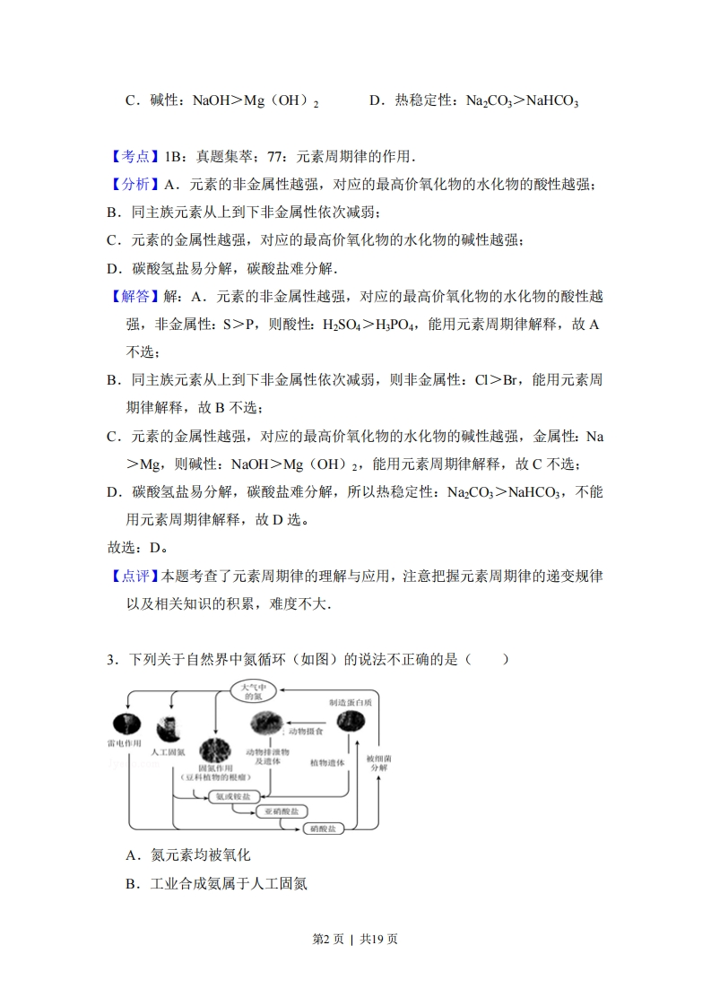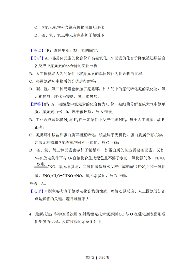2015年北京市高考化学试卷考答来与试题解析一、选择题1.下列我国古代的技术应用中,其工作原理不涉及化学反应的是(A.火药使用B.粮食酿酒C.转轮排字D.铁的治炼A.AB.BC.CD.D【考点】1B:真题集萃:G6:金属治炼的一般原理:IO:生活中的有机化合物、【分析】化学反应的根本标志是有新物质生成,发生化学变化,题中火药使用、粮食酿酒以及铁的治炼都发生化学变化,而转轮排字不涉及化学反应【解答】解:A.火药使用涉及反应为2KNO3+S+3C=K2S+N2↑+3CO2↑,发生化学反应,故A不选:B.粮食酿酒为淀粉在酒曲酶的作用下生成乙醇,发生化学反应,故B不选:C.转轮排字为印刷操作,没有涉及化学反应,故C选:D.铁的治炼涉及3C0+Fe,0,高温2Fe+3C02,发生化学反应,故D不选。故选:C。【点评】本题为2015年北京考题,涉及化学反应与生活、生产的考查,为高频考点,侧重于学生的分析能力的考查,有利于培养学生良好的科学素养,提高学习的积极性,难度不大2.下列有关性质的比较,不能用元素周期律解释的是()A.酸性:H2SO4>H3PO4B.非金属性:CI>Br第1页|共19页C.碱性:NaOH>Mg(OH)2D.热稳定性:Na2CO,>NaHCO3【考点】1B:真题集萃:77:元素周期律的作用.【分析】A.元素的非金属性越强,对应的最高价氧化物的水化物的酸性越强:B.同主族元素从上到下非金属性依次减弱:C.元素的金属性越强,对应的最高价氧化物的水化物的碱性越强:D.碳酸氢盐易分解,碳酸盐难分解,【解答】解:A.元素的非金属性越强,对应的最高价氧化物的水化物的酸性越强,非金属性:S>P,则酸性:H2SO4>HPO4,能用元素周期律解释,故A不选:B.同主族元素从上到下非金属性依次减弱,则非金属性:C>B,能用元素周期律解释,故B不选:C.元素的金属性越强,对应的最高价氧化物的水化物的碱性越强,金属性:N>Mg,则碱性:NaOH>Mg(OH)2,能用元素周期律解释,故C不选:D.碳酸氢盐易分解,碳酸盐难分解,所以热稳定性:NaCO,>NaHCO3,不能用元素周期律解释,故D选。故选:D。【点评】本题考查了元素周期律的理解与应用,注意把握元素周期律的递变规律以及相关知识的积累,难度不大。3.下列关于自然界中氮循环(如图)的说法不正确的是()大气中的氯制造蛋白质动物食雷电作用人工周氯动物排漫物及塘植物遗体被圆氯作用分解(显科植物的根植),氨发盐业硝酸盐→硝酸盐A.氮元素均被氧化B.工业合成氨属于人工固氮第2页|共19页C,含氮无机物和含氮有机物可相互转化D.碳、氢、氧三种元素也参加了氮循环【考点】1B:真题集萃:28:氮的固定,【分析】A.根据N元素的化合价升高被氧化,N元素的化合价降低被还原结合各反应中氮元素的化合价的变化分析:B.人工固氮是人为的条件下将氮元素的单质转化为化合物的过程:C.根据氮循环中物质的分类进行解答:D.碳、氢、氧三种元素也参加了氮循环,如大气中的氮气转化氮的氧化物,氧元素参与,转化为铵盐,氢元素参加。【解答】解:A.硝酸盐中氮元素的化合价为+5价,被细菌分解变成大气中氮单质,氮元素由+5→0,属于被还原,故A错误:B.工业合成氨是将N2与H2在一定条件下反应生成NH3,属于人工固氮,故B正确:C.氮循环中铵盐和蛋白质可相互转化,铵盐属于无机物,蛋白质属于有机物,含氮无机物和含氮有机物可相互转化,故C正确:D.碳、氢、氧三种元素也参加了氮循环,如蛋白质的制造需要碳元素,又如N2在放电条件下与O2直接化合生成无色且不溶于水的一氧化氮气体,N2+O2放电2NO,氧元素参与,二氧化氮易与水反应生成硝酸(N0,)和一氧化氮,3NO2+HO=2HNO+NO,氢元素参加,故D正确。故选:A。【点评】本题主要考查了氮以及化合物的性质,理解还原反应、人工固氮等知识点是解答的关键,题目难度不大,4.最新报道:科学家首次用X射线激光技术观察到CO与O在催化剂表面形成化学键的过程。反应过程的示意图如下:第3页|共19页