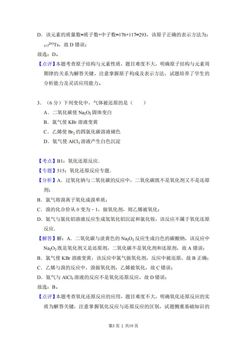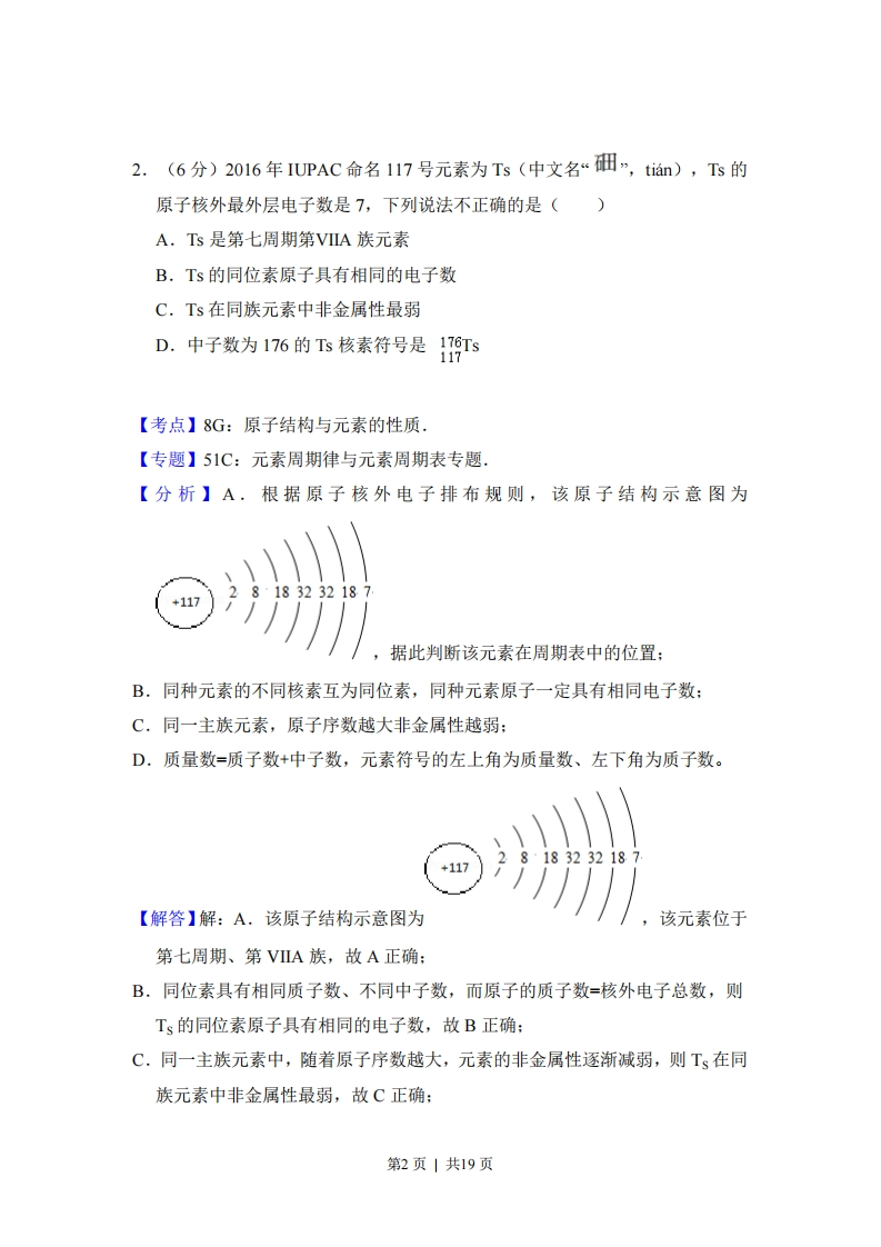 2017年北京市高考化学试卷考答来与试题解析一、本部分共7小题,每小题6分,共42分.在每小题列出的四个选项中,选出最符合题目要求的一项。1.(6分)古丝绸之路贸易中的下列商品,主要成分属于无机物的是()瓷器B丝绸茶叶D中草药【考点】3B:无机化合物与有机化合物的概念.【专题】512:物质的分类专题.【分析】含有碳元素的化合物为有机物,有机物大多数能够燃烧,且多数难溶于水;无机物指的是不含碳元素的化合物,无机物多数不能燃烧,据此分析·【解答】解:A、瓷器是硅酸盐产品,不含碳元素,不是有机物,是无机物,故A正确:B、丝绸的主要成分是蛋白质,是有机物,故B错误:C、茶叶的主要成分是纤维素,是有机物,故C错误:D、中草药的主要成分是纤维素,是有机物,故D错误。故选:A。【点评】本题依托有机物和无机物的概念考查了化学知识与生活中物质的联系,难度不大,应注意有机物中一定含碳元素,但含碳元素的却不一定是有机物。第1页|共19页2.(6分)2016年IUPAC命名117号元素为Ts(中文名田”,tin),Ts的原子核外最外层电子数是7,下列说法不正确的是()A,Ts是第七周期第VIA族元素B.Ts的同位素原子具有相同的电子数C.Ts在同族元素中非金属性最弱D.中子数为176的T5核素符号是Ts【考点】8G:原子结构与元素的性质【专题】51C:元素周期律与元素周期表专题.【分析】A·根据原子核外电子排布规则,该原子结构示意图为28·183232187+117据此判断该元素在周期表中的位置:B.同种元素的不同核素互为同位素,同种元素原子一定具有相同电子数:C.同一主族元素,原子序数越大非金属性越弱:D.质量数=质子数+中子数,元素符号的左上角为质量数、左下角为质子数。8·183232187+117【解答】解:A.该原子结构示意图为该元素位于第七周期、第VⅡA族,故A正确:B.同位素具有相同质子数、不同中子数,而原子的质子数=核外电子总数,则Ts的同位素原子具有相同的电子数,故B正确:C.同一主族元素中,随着原子序数越大,元素的非金属性逐渐减弱,则T、在同族元素中非金属性最弱,故C正确:第2页|共19页D.该元素的质量数=质子数+中子数=176+117=293,该原子正确的表示方法为:11293Ts,故D错误:故选:D。【点评】本题考查原子结构与元素性质,题目难度不大,明确原子结构与元素周期律的关系为解答关键,注意掌握原子构成及表示方法,试题培养了学生的分析能力及灵活应用能力。3.(6分)下列变化中,气体被还原的是()A.二氧化碳使Na2O2固体变白B.氯气使KBr溶液变黄C.乙烯使B2的四氯化碳溶液褪色D.氨气使AICl,溶液产生白色沉淀【考点】B1:氧化还原反应,【专题】515:氧化还原反应专题.【分析】A.过氧化钠与二氧化碳的反应中,二氧化碳既不是氧化剂又不是还原剂:B.氯气将溴离子氧化成溴单质:C.溴的化合价从0变为-1,做氧化剂,则乙烯被氧化:D.氨气与氯化铝溶液反应生成氢氧化铝沉淀和氯化铵,该反应不属于氧化还原反应【解答】解:A.二氧化碳与淡黄色的NO2反应生成白色的碳酸钠,该反应中N2O2既是氧化剂又是还原剂,二氧化碳不是氧化剂和还原剂,故A错误:B.氯气使KBr溶液变黄,该反应中氯气做氧化剂,反应中被还原,故B正确:C.乙烯与溴的反应中,溴做氧化剂,乙烯被氧化,故C错误:D.氨气与A1CI3溶液的反应不是氧化还原反应,故D错误:故选:B。【点评】本题考查氧化还原反应的应用,题目难度不大,明确氧化还原反应的实质为解答关键,注意掌握氧化反应与还原反应的区别,试题侧重基础知识的第3页|共19页