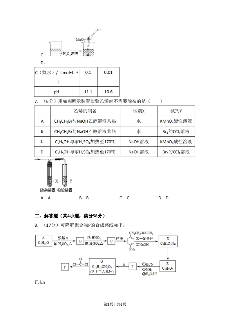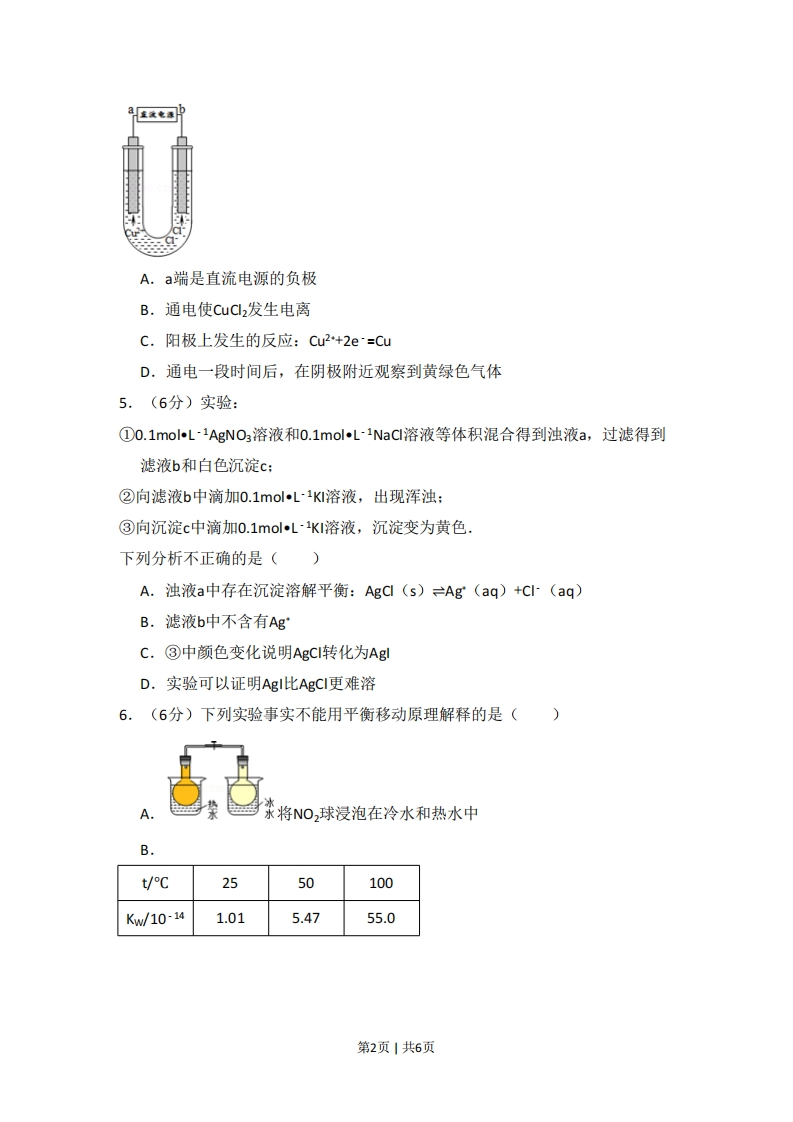 2013年北京市高考化学试卷一、选择题(共7小题,每小题6分,满分42分)1.(6分)下列设备工作时,将化学能转化为热能的是()ABD硅太阳能电池锂离子电池太阳能集热器燃气灶A.AB.BC.CD.D2.(6分)下列金属防腐的措施中,使用外加电流的阴极保护法的是()A.水中的钢闸门连接电源的负极B.金属护拦表面涂漆C.汽车底盘喷涂高分子膜D.地下钢管连接镁块3.(6分)下列解释事实的方程式不准确的是()A.用浓盐酸检验氨:NH3+HCI=NH4ClB.碳酸钠溶液显碱性:C032-+H2OHC03OHC.钢铁发生吸氧腐蚀时,铁作负极被氧化:Fe-3e~=Fe3D.长期盛放石灰水的试剂瓶内壁出现白色固体:Ca(OH)2+CO2=CaCO3↓+H2O4.(6分)用石墨电极电解CuC12溶液(如图),下列分析正确的是()第1页1共6页a在发电得A.a端是直流电源的负极B.通电使CuC2发生电离C.阳极上发生的反应:Cu2+2e=CuD.通电一段时间后,在阴极附近观察到黄绿色气体5,(6分)实验:①0.1molL-1AgNO3溶液和0.1molL1NaCI溶液等体积混合得到浊液a,过滤得到滤液b和白色沉淀c:②向滤液b中滴加0.1molL1K溶液,出现浑浊:③向沉淀c中滴加0.1molL-K1溶液,沉淀变为黄色,下列分析不正确的是()A.浊液a中存在沉淀溶解平衡:AgC(s)=Ag(aq)+C(aq)B.滤液b中不含有AgC.③中颜色变化说明AgCI转化为AgID.实验可以证明AgI比AgCI更难溶6.(6分)下列实验事实不能用平衡移动原理解释的是()水将NO,球浸泡在冷水和热水中8t/C2550100Kw/10-141.015.4755.0第2页1共6页蓝H:0:溶液0c(氨水)/(molL10.10.01)pH11.110.67.(6分)用如图所示装置检验乙烯时不需要除杂的是()乙烯的制备试剂x试剂YACHCH2Br与NaOH乙醇溶液共热水KMnO,酸性溶液BCH3CH2Br与NaOH乙醇溶液共热水Br2的CCL4溶液C2H5OH与浓H2SO4加热至170CNaOH溶液KMnO酸性溶液DC2H50H与浓H2S0a加热至170CNaOH溶液Br2的CCL4溶液时x除杂装置检验装置A.AB.BC.CD.D二、解答题(共4小题,满分58分)8.(17分)可降解聚合物P的合成路线如下:CH.CH.OOCCH;A羧酸a浓DNOc还原①一定条件DCH100浓HS04,△B浓HS04,△@NaOHC:HO2NaNH:GCI-C-clC1H10N,04△F①HCNC:HO2(含3个六元环)②NH:③H,0H*已知:第3页1共6页