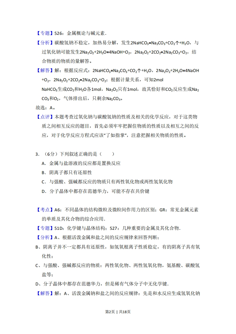 2008年北京市高考化学试卷事考答案与试题佩析一、选择题(共7小题,每小题6分,满分42分)1.(6分)对H20的电离平衡不产生影响的粒子是(A.H:CI:8oB.26M3D.H【考点】41:常见元素的名称、符号、离子符号:D6:水的电离.【专题】51G:电离平衡与溶液的pH专题,【分析】依据水的电离是一电离平衡,根据影响因素来进行判断,影响因素有温度、酸、碱、盐等,加热促进电离:加酸、加碱抑制水的电离:能水解的盐促进水的电离:【解答】解:A、微粒表示的是酸水溶液中抑制水的电离,故A不符合:B、离子符号表示的是三价铁离子,水溶液中能水解,促进水的电离,故B不符合:C、离子结构示意图表示的是氯离子,对水的电离无影响,故C符合:D、结构式表示的是醋酸根离子,水溶液中能水解,促进水的电离,故D不符合故选:C。【点评】本题考查了对水的电离的影响因素,主要是根据微粒的几种表示式来判断微粒的性质,确认对水的电离的影响.2.(6分)1mol过氧化钠与2mo碳酸氢钠固体混合后,在密闭容器中加热充分反应,排出气体物质后冷却,残留的固体物质是()A.Na2CO3B.Na202 Na2CO3C.NaOH Na2CO3D.Na202 NaOH Na3CO3【考点】GF:钠的重要化合物.第1页|共18页【专题】526:金属概论与碱元素【分析】碳酸氢钠不稳定,加热易分解,发生2 NaHCO3=Na2C03+C02个+H20,与过氧化钠可能发生2Na2O2+2H20=4NaOH+02,2Na2O2+2C02=2Na2C03+02,结合物质的物质的量解答。【解答】解:根据反应式:2NaHC03=Na2C03+C02个+H20,2Na202+2H20=4NaOH+02,2Na202+2C02=2Na2C03+02:根据计量关系,可知2molNaHC03生成C02和H20各1mol,Na202只有1mol,故其恰好和C02反应生成Na2C03和O2,气体排出后,只剩余Na2C03故选:A。【点评】本题考查过氧化钠与碳酸氢钠的性质及相关的化学反应,对于这类物质之间相互反应的题目,首先必须牢牢把握住物质的性质以及相互之间的反应,对于化学反应方程式应该“了如指掌”,注意把握相关物质的性质。3.(6分)下列叙述正确的是()A.金属与盐溶液的反应都是置换反应B.阴离子都只有还原性C.与强酸、强碱都反应的物质只有两性氧化物或两性氢氧化物D.分子晶体中都存在范德华力,可能不存在共价键【考点】A6:不同晶体的结构微粒及微粒间作用力的区别:GR:常见金属元素的单质及其化合物的综合应用,【专题】51D:化学键与晶体结构:527:几种重要的金属及其化合物.【分析】A、根据活泼金属和盐之间的反应规律来回答判断:B、阴离子并不一定都具有还原性,如氢氧根离子性质稳定,有的阴离子具有氧化性:C、与强酸、强碱都反应的物质:两性氧化物、两性氢氧化物,氨基酸、碳酸氢盐等:D、分子晶体中都存在范德华力,但是稀有气体分子中无化学键,【解答】解:A、活泼金属钠和盐之间的反应规律:先是和水反应生成氢氧化钠第2页|共18页和氢气,金属钠不会和盐之间直接反应,故A错误:B、阴离子并不一定都具有还原性,有的阴离子具有氧化性,如次氯酸根离子,故B错误:C、与强酸、强碱都反应的物质:两性氧化物、两性氢氧化物,氨基酸、碳酸氢盐等,故C错误:D、分子晶体中都存在范德华力,但是稀有气体分子中无化学键,所以分子晶体中可能不存在共价键,故D正确。故选:D。【点评】本题涉及元素以及化合物的性质以及分子间作用力等方面知识,可以根据所学知识来回答,难度不大4.(6分)下列各组物质的无色溶液,不用其它试剂即可鉴别的是()①KOH、Na2SOa、AICl3②NaHCO3、Ba(OH)2、H2SO4③HCl、NaAIO2、NaHSO4④Ca(OH)2、Na2C03BaCl2:A.①②B.②③C.①③④D.①②④【考点】PS:物质的检验和鉴别的基本方法选择及应用.【专题】542:化学实验基本操作【分析】①Na2SOa与其它两种物质均不反应,KOH与AICl3互滴,现象不同,可以鉴别:②Ba(OH)2与其它两种物质反应均生成沉淀,先判断出Ba(OH)2,Ba(OH)2与一物质生成沉淀后,用其沉淀与另一种物质反应,若有气体放出,原沉淀为碳酸钡,所加的物质为硫酸:若无气体放出,则原沉淀为硫酸钡:③NaAlO2与其它两种物质反应的现象相同:④Na2C03与其它两种物质反应的现象相同,【解答】解:①Na2S0,与其它两种物质均不反应,KOH与AIC互滴,一是先生成沉淀后溶解,一是沉淀立即消失,之后沉淀不再消失,现象不同,可以鉴第3页|共18页