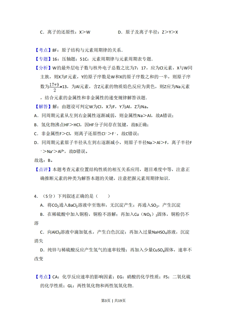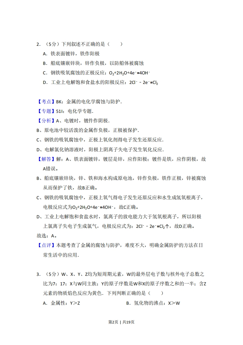 2009年北京市高考化学试卷事考答案与试题佩析一、选择题(共8小题,每小题5分,满分40分)1.(5分)化学与人类生活密切相关.下列说法正确的是()A.苯酚有一定毒性,不能作消毒剂和防腐剂B.白磷着火点高且无毒,可用于制造安全火柴C.油脂皂化生成的高级脂肪酸钠是肥皂的有效成分D,用食醋去除水壶中的水垢时所发生的是水解反应【考点】19:绿色化学:J8:苯酚的化学性质:J:油脂的性质、组成与结构【分析】A.苯酚能杀菌消毒:B.白磷着火点低,且有毒:C.油脂在氢氧化钠溶液中能发生皂化反应生成硬脂酸钠:D.水垢的主要成分是碳酸钙、氢氧化镁,二者都能和醋酸反应生成可溶性的盐而除去水垢。【解答】解:A.苯酚有毒,病毒属于蛋白质,苯酚能将病毒变性而杀菌消毒,所以苯酚可以配制成一定浓度的溶液用于杀菌消毒或防腐,故A错误:B.白磷的着火点是40℃,白磷易自燃且有毒,所以不能用于制造安全火柴,用于制造安全火柴的是红磷,故B错误:C.油脂在NaOH溶液中发生皂化反应生成硬脂酸钠,硬脂酸钠用于制造肥皂,所以肥皂的主要成分是硬脂酸钠,故C正确:D.水垢的主要成分是碳酸钙、氢氧化镁,CaCO3+2CH3C0OH=Ca(CHC00)2tCO2个+H20、Mg(OH)2+2CH3C0OH=Mg(CH3C00)2+2H20,所以发生的是复分解反应,故D错误;故选:C。【点评】本题考查了化学与生活,明确物质的性质是解本题关键,根据物质的性质分析解答,会运用化学知识解释生活现象,题目难度不大第1页|共19页2.(5分)下列叙述不正确的是()A.铁表面镀锌,铁作阳极B.船底镶嵌锌块,锌作负极,以防船体被腐蚀C.钢铁吸氧腐蚀的正极反应:02+2H20+4e~=4OHD.工业上电解饱和食盐水的阳极反应:2C~-2e=Cl2【考点】BK:金属的电化学腐蚀与防护.【专题】511:电化学专题.【分析】A、电镀时,镀件作阴极B、原电池中较活泼的金属作负极,正极被保护C、钢铁的吸氧腐蚀中,正极上氧化剂得电子发生还原反应.D、电解氯化钠溶液时,阳极上阴离子失电子发生氧化反应【解答】解:A、铁表面镀锌,镀层是锌,应作阳极:镀件是铁,应作阴极,故A错误。B、船底镶嵌锌块,锌、铁和海水构成原电池,锌作负极,铁作正极,锌被腐蚀从而保护了铁,故B正确。C、钢铁的吸氧腐蚀中,正极上氧气得电子发生还原反应和水生成氢氧根离子,电极反应式为02+2H20+4e~=40H,故C正确。D、工业上电解饱和食盐水时,氯离子的放电能力大于氢氧根离子,所以阳极上氯离子失电子生成氯气,电极反应式为:2C-2e=C2个,故D正确。故选:A。【点评】本题考查了金属的腐蚀与防护,难度不大,明确金属防护的方法在日常生活中的应用。3.(5分)W、X、Y、Z均为短周期元素,W的最外层电子数与核外电子总数之比为7:17:X与W同主族:Y的原子序数是W和X的原子序数之和的一半:含Z元素的物质焰色反应为黄色.下列判断正确的是()A.金属性:Y>ZB.氢化物的沸点:X>W第2页1共19页C.离子的还原性:X>WD.原子及离子半径:Z>Y>X【考点】8F:原子结构与元素周期律的关系.【专题】16:压轴题:51C:元素周期律与元素周期表专题,【分析】W的最外层电子数与核外电子总数之比为7:17,应为元素,X与W同主族,则x为F元素,Y的原子序数是W和X的原子序数之和的一半,则原子序数为1749=13,为A元素,含Z元素的物质焰色反应为黄色,则Z应为Na元素2,结合元素的金属性和非金属性的递变规律解答该题.【解答】解:由题设可判定W为Cl,X为F,Y为Al,Z为Na。A.同周期元素从左到右金属性逐渐减弱,则金属性Na>AI,故A错误;B.氢化物沸点HF>HCl,因HF分子间存在氢键,故B正确C.非金属性F>Cl,则离子还原性C>F,故C错误:D.同周期元素原子半径从左到右逐渐减小,则原子半径Na>AI>F,离子半径F->Na>AI3,故D错误。故选:B。【点评】本题考查元素位置结构性质的相互关系应用,题目难度中等,注意正确推断元素的种类为解答本题的关键,注意把握元素周期律知识,4.(5分)下列叙述正确的是()A.将C02通入BaC2溶液中至饱和,无沉淀产生;再通入S02,产生沉淀B.在稀硫酸中加入铜粉,铜粉不溶解:再加入Cu(NO3)2固体,铜粉仍不溶C.向AICl3溶液中滴加氨水,产生白色沉淀:再加入过量NaHSO4溶液,沉淀消失D.纯锌与稀硫酸反应产生氢气的速率较慢:再加入少量CuS0,固体,速率不改变【考点】CA:化学反应速率的影响因素;EG:硝酸的化学性质;F5:二氧化硫的化学性质:GL:两性氧化物和两性氢氧化物.第3页1共19页