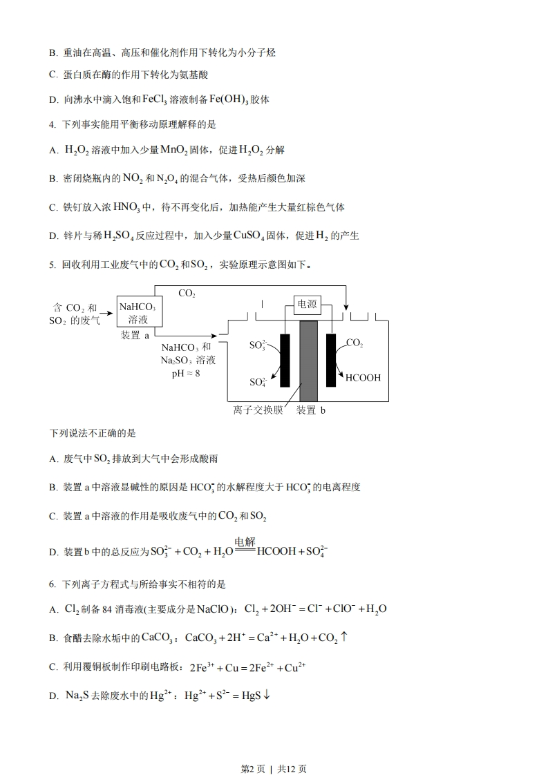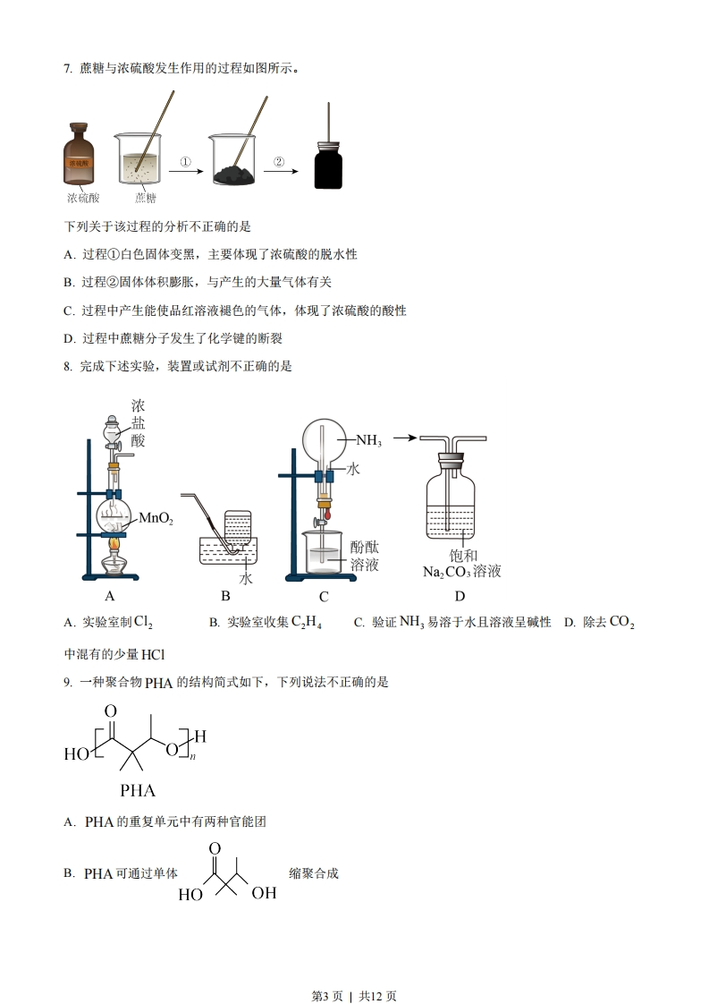 2023年普通高中学业水平等级性考试(北京卷)化学可能用到的相对原子质量:H-1C-12N-140-16Mg-24S-32第一部分本部分共14小题,每题3分,共42分。在每题列出的四个选项中,选出最符合题目要求的一项。1.中国科学家首次成功制得大面积单晶石墨炔,是碳材料科学的一大进步。金刚石石墨石墨炔下列关于金刚石、石墨、石墨炔的说法正确的是A.三种物质中均有碳碳原子间的σ键B.三种物质中的碳原子都是$p3杂化C.三种物质的晶体类型相同D.三种物质均能导电2.下列化学用语或图示表达正确的是A.NaCl的电子式为Na:ClB.NH的VSEPR模型为C.2p2电子云图为D.基态2:C「原子的价层电子轨道表示式为NN个3d4s3.下列过程与水解反应无关的是A.热的纯碱溶液去除油脂第1页」共12页B.重油在高温、高压和催化剂作用下转化为小分子烃C.蛋白质在酶的作用下转化为氨基酸D.向沸水中滴入饱和FeCl3溶液制备Fe(OH3胶体4.下列事实能用平衡移动原理解释的是A.H,O2溶液中加入少量MnO2固体,促进H,O2分解B.密闭烧瓶内的NO2和N,O,的混合气体,受热后颜色加深C.铁钉放入浓NO3中,待不再变化后,加热能产生大量红棕色气体D.锌片与稀HSO,反应过程中,加入少量CuSO,固体,促进H2的产生5.回收利用工业废气中的CO2和SO2,实验原理示意图如下。CO,含C0,和→NaHCO,电源S02的废气溶液装置aNaHCO;和S03CONaSO,溶液pH≈8S0HCOOH离子交换膜'装置b下列说法不正确的是A.废气中$O2排放到大气中会形成酸雨B.装置a中溶液显碱性的原因是HCO;的水解程度大于HCO;的电离程度C.装置a中溶液的作用是吸收废气中的CO2和SO,电解D.装置b中的总反应为SO+CO,+H,0HCOOH +SO6.下列离子方程式与所给事实不相符的是A.Cl2制备84消毒液(主要成分是NaCIo):CL,+2OH=C+CIO+H,OB.食醋去除水垢中的CaCO3:CaC03+2H=Ca2++H,0+CO,个C.利用覆铜板制作印刷电路板:2Fe++Cu=2Fe2++Cu2+D.Na2S去除废水中的Hg2+:Hg2++S2=HgS↓第2页|共12页7.蔗糖与浓硫酸发生作用的过程如图所示。浓硫酸藏糖下列关于该过程的分析不正确的是A.过程①白色固体变黑,主要体现了浓硫酸的脱水性B.过程②固体体积膨胀,与产生的大量气体有关C.过程中产生能使品红溶液褪色的气体,体现了浓硫酸的酸性D.过程中蔗糖分子发生了化学键的断裂8.完成下述实验,装置或试剂不正确的是浓盐酸MnO,酚酞溶液饱和Na2CO3溶液ACDA.实验室制Cl2B.实验室收集C2H4C.验证NH3易溶于水且溶液呈碱性D.除去CO,中混有的少量HCI9.一种聚合物PHA的结构简式如下,下列说法不正确的是PHAA.PHA的重复单元中有两种官能团B.PHA可通过单体缩聚合成HOOH第3页」共12页