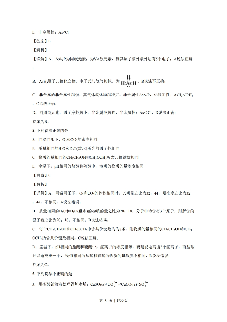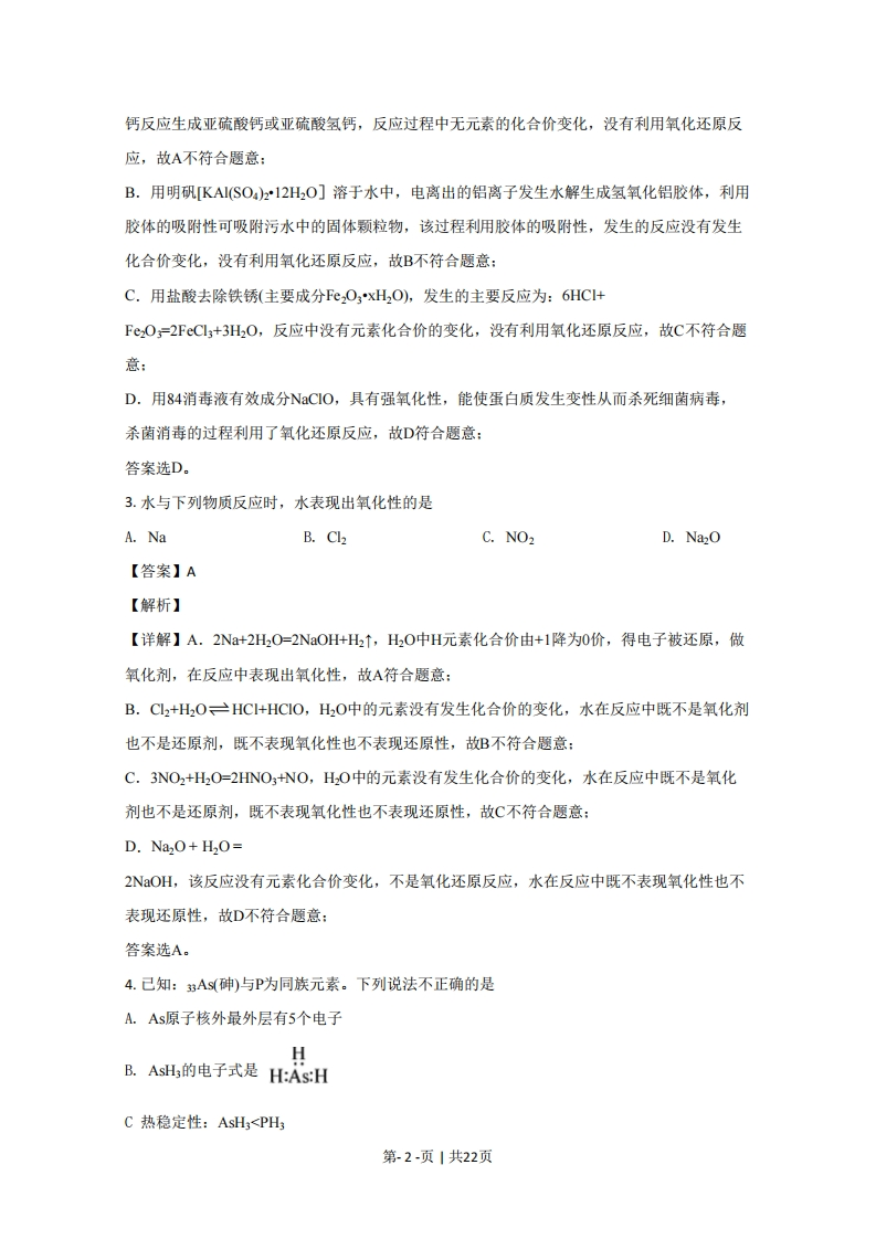 北京市2020年普通高中学业水平等级性考试化学本试卷共9页,100分。考试时长90分钟。考生务必将答案答在答题卡上,在试卷上作答无效。考试结束后,将本试卷和答题卡一升交回。可能用到的相对原子质晕:H-1C-12N-140-16第一部分本部分共14题,每题3分,共42分。在每题列出的四个选项中,选出最符合题目要求的一项。1.近年来,我国航空航天事业成果显著。下列成果所涉及的材料为金属材料的是A.“天宫二号“航天器使用的质量轻强度高的材料一钛合金B.“北斗三号”导航卫星使用的太阳能电池材料一砷化镓C.“长征五号”运载火箭使用的高效燃料一液氢D.“℃919”飞机身使用的复合材料一碳纤维和环氧树脂【答案】A【解析】【详解】A.钛合金是合金材料,属于金属材料,故A符合题意B.砷化稼是一种半导体材料,不是金属材料,故B不符合题意:C.液氢是液态氢气单质,氢元素是非金属,不是金属材料,故C不符合题意:D.碳纤维是碳元素组成的一种单质,是无机非金属材料,环氧树脂是有机高分子合成材料,都不是金属材料,故D不符合题意答案选A。2.下列物质的应用中,利用了氧化还原反应的是A.用石灰乳脱除烟气中的SO2B.用明矾KA1(SO4h12H2O]处理污水C.用盐酸去除铁锈(主要成分Fe2O3xHzO)D.用84消毒液(有效成分NaCIO)杀灭细菌【答案】D【解析】【详解】A.SO2是酸性氧化物,可与碱反应,用石灰乳脱除烟气中的SO2时,SO2与氢氧化第-1-页1共22页钙反应生成亚硫酸钙或亚硫酸氢钙,反应过程中无元素的化合价变化,没有利用氧化还原反应,故A不符合题意:B.用明矾[KAI(SO)212H2O]溶于水中,电离出的铝离子发生水解生成氢氧化铝胶体,利用胶体的吸附性可吸附污水中的固体颗粒物,该过程利用胶体的吸附性,发生的反应没有发生化合价变化,没有利用氧化还原反应,故B不符合题意:C.用盐酸去除铁锈(主要成分FO3xHO),发生的主要反应为:6HC+F©zO=2FcCl3+3H2O,反应中没有元素化合价的变化,没有利用氧化还原反应,故C不符合题意:D.用84消毒液有效成分NaCIO,具有强氧化性,能使蛋白质发生变性从而杀死细菌病毒,杀菌消毒的过程利用了氧化还原反应,故D符合题意:答案选D。3.水与下列物质反应时,水表现出氧化性的是A.NaB.Cl2C.NO2D.Na2O【答案】A【解析】【详解】A.2Na+2H2O=2NaOH+H2↑,HO中H元素化合价由+1降为0价,得电子被还原,做氧化剂,在反应中表现出氧化性,故A符合题意:B.C2+H2O≥HC+HCIO,H2O中的元素没有发生化合价的变化,水在反应中既不是氧化剂也不是还原剂,既不表现氧化性也不表现还原性,故B不符合题意:C.3NO2+H2O=2HNO3+NO,HO中的元素没有发生化合价的变化,水在反应中既不是氧化剂也不是还原剂,既不表现氧化性也不表现还原性,故C不符合题意:D.Na20+H20=2NOH,该反应没有元素化合价变化,不是氧化还原反应,水在反应中既不表现氧化性也不表现还原性,故D不符合题意:答案选A。4.己知:3As(砷)与P为同族元素。下列说法不正确的是A.As原子核外最外层有5个电子HB.AsH3的电子式是H:As:HC热稳定性:AsH3