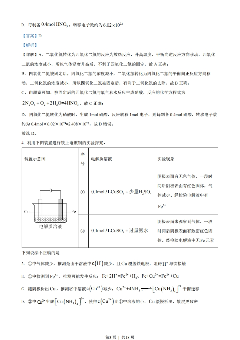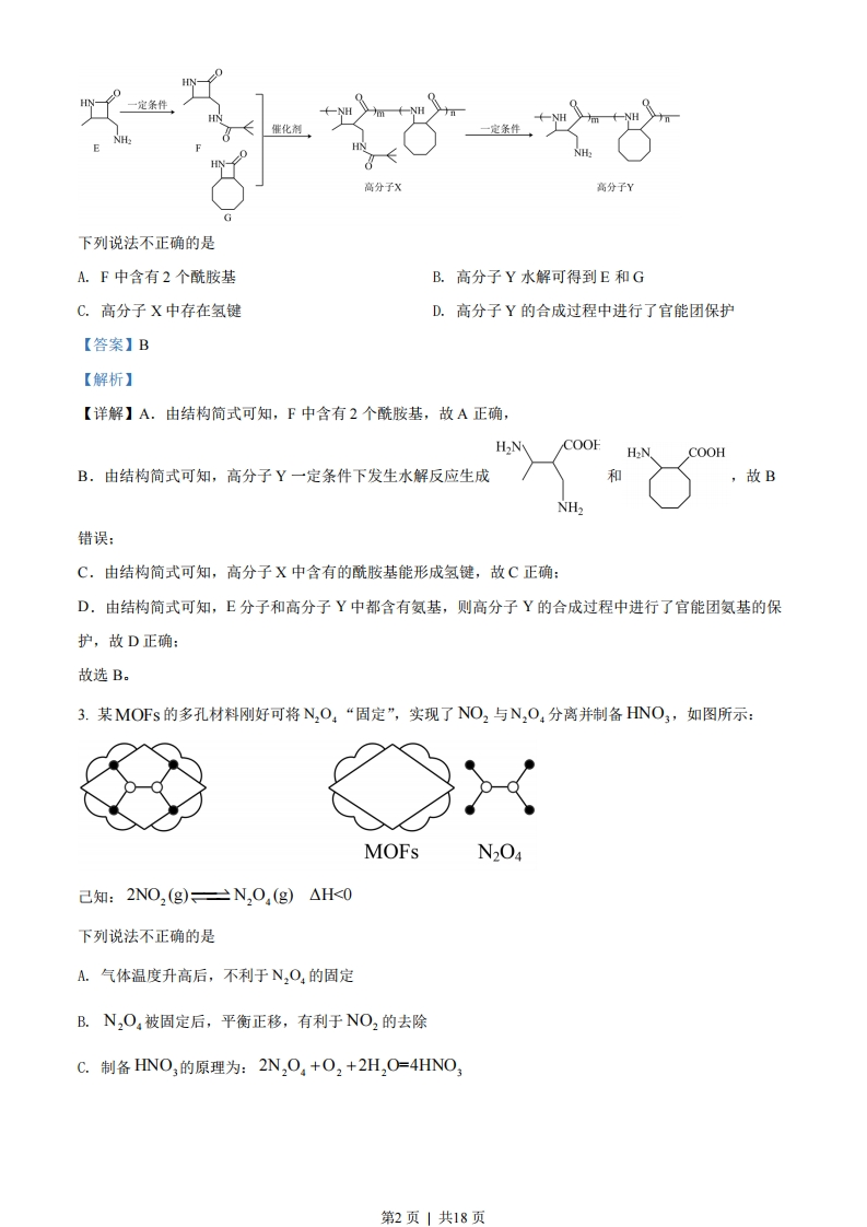 2022年北京卷部分试题1.利用如图所示装置(夹持装置略)进行实验,b中现象不能证明a中产物生成的是a中反应b中检测试剂及现象浓HNO3分解生成NO2淀粉-KI溶液变蓝夕Cu与浓HSO,生成SO,品红溶液褪色C浓NaOH与NH,CI溶液生成NH酚酞溶液变红0CH,CHBrCH3与NaOH乙醇溶液生成丙烯溴水褪色A.AB.BC.cD.D【答案】A【解析】【详解】A.浓硝酸具有挥发性,挥发出的硝酸也能与碘化钾溶液反应生成遇淀粉溶液变蓝色的碘,则淀粉碘化钾溶液变蓝色不能说明浓硝酸分解生成二氧化氮,故A符合题意:B.铜与浓硫酸共热反应生成的二氧化硫具有漂白性,能使品红溶液褪色,则品红溶液褪色能说明铜与浓硝酸共热反应生成二氧化硫,故B不符合题意:C.浓氢氧化钠溶液与氯化铵溶液共热反应生成能使酚酞溶液变红的氨气,则酚酞溶液变红能说明浓氢氧化钠溶液与氯化铵溶液共热反应生成氨气,故C不符合题意:D.乙醇具有挥发性,挥发出的乙醇不能与溴水反应,则2一溴丙烷与氢氧化钠乙醇溶液共热发生消去反应生成能使溴水褪色的丙烯气体,则溴水褪色能说明2一溴丙烷与氢氧化钠乙醇溶液共热发生消去反应生成丙烯,故D不符合题意:故选A。2.高分子Y是一种人工合成的多肽,其合成路线如下。第1页」共18页条骨催化剂高分子X高分子Y下列说法不正确的是A.F中含有2个酰胺基B.高分子Y水解可得到E和GC.高分子X中存在氢键D.高分子Y的合成过程中进行了官能团保护【答案】B【解析】【详解】A.由结构简式可知,F中含有2个酰胺基,故A正确,H2NyCOOHCOOHB.由结构简式可知,高分子Y一定条件下发生水解反应生成和,故B错误:C.由结构简式可知,高分子X中含有的酰胺基能形成氢键,故C正确:D.由结构简式可知,E分子和高分子Y中都含有氨基,则高分子Y的合成过程中进行了官能团氨基的保护,故D正确:故选B。3.某MOFs的多孔材料刚好可将N,O,“固定”,实现了NO2与NO,分离并制备HNO3,如图所示:MOFsN204己知:2NO,(g)-≥N,O,(g)△H<0下列说法不正确的是A.气体温度升高后,不利于N,O,的固定B.N,O,被固定后,平衡正移,有利于NO2的去除C.制备HNO3的原理为:2N,O,+O2+2H,O=4HNO3第2页」共18页D.每制备0.4 mol HN(03,转移电子数约为6.02×1022【答案】D【解析】【详解】A.二氧化氮转化为四氧化二氮的反应为放热反应,升高温度,平衡向逆反应方向移动,四氧化二氮的浓度减小,所以气体温度升高后,不利于四氧化二氮的固定,故A正确:B.四氧化二氮被固定后,四氧化二氮的浓度减小,二氧化氮转化为四氧化二氮的平衡向正反应方向移动,二氧化氮的浓度减小,所以四氧化二氮被固定后,有利于二氧化氮的去除,故B正确:C.由题意可知,被固定后的四氧化二氮与氧气和水反应生成硝酸,反应的化学方程式为2N20,+O2+2H,O=4HNO3,故C正确:D.四氧化二氮转化为硝酸时,生成1mol硝酸,反应转移1mol电子,则每制备0.4mol硝酸,转移电子数约为0.4mol×6.02×1023-2.408×1023,故D错误:故选D。4.利用下图装置进行铁上电镀铜的实验探究。序装置示意图电解质溶液实验现象号阴极表面有无色气体,一段时间后阴极表面有红色固体,气①0.1mol/LCuS0,+少量H,S0,体减少。经检验电解液中有Fe2+Fe阴极表面未观察到气体,一段电解质溶液②0.1mol/LCuS0,+过量氨水时间后阴极表面有致密红色固体。经检验电解液中无Fe元素下列说法不正确的是A.①中气体减少,推测是由于溶液中cH)减少,且C覆盖铁电极,阻碍H与铁接触B.①中检测到Fe2+,推测可能发生反应:Fe+2H=Fe++H2、Fe+Cu2+=Fe2++CuC.随阴极析出Cu,推测②中溶液c(Cu2)减少,Cu2+4NH,一三[Cu(NH,)a]平衡逆移D.②中QP生成[Cu(NH)a],使得c(Cu2*)比①中溶液的小,Cu缓慢析出,镀层更致密第3页」共18页