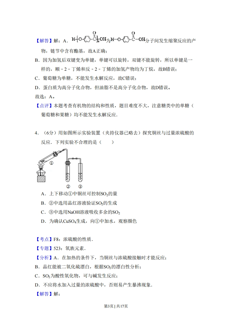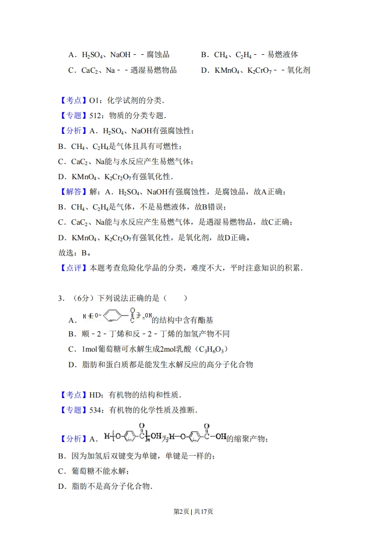 2010年北京市高考化学试卷事考答案与试题佩析一、选择题(共7小题,每小题6分,满分42分)1.(6分)下列有关钢铁腐蚀与防护的说法正确的是()A.钢管与电源正极连接,钢管可被保护B.铁遇冷浓硝酸表面钝化,可保护内部不被腐蚀C.钢管与铜管露天堆放在一起时,钢管不易被腐蚀D.钢铁发生析氢腐蚀时,负极反应是Fe-3e一Fe3【考点】BK:金属的电化学腐蚀与防护【专题】511:电化学专题.【分析】A.用电解原理保护金属时,金属应作电解池阴极:B.常温下,铁和浓硝酸发生钝化现象而阻止进一步反应:C.构成原电池负极的金属易被腐蚀:D.钢铁发生析氢腐蚀时,负极上铁失电子生成亚铁离子【解答】解:A,用电解原理保护金属时,金属应作电解池阴极,应该与原电池负极连接,故A错误;B.常温下,铁和浓硝酸反应生成一层致密的氧化物薄膜而阻止了进一步反应,所以可以保护内部金属不被腐蚀,故B正确:C.钢管、铜管和雨水能构成原电池,铁作原电池负极而容易被腐蚀,故C错误D.钢铁发生析氢腐蚀时,负极反应是Fe-2e一Fe2,,故D错误:故选:B。【点评】本题以金属的腐蚀与防护为载体考查了原电池和电解池原理,注意铁和铝的钝化现象不是没反应而是反应生成一层致密的氧化物薄膜而阻止了进一步反应,为易错点.2.(6分)下列物质与常用危险化学品的类别不对应的是()第1页|共17页A.HSO4、NaOH--腐蚀品B.CH4、C2H4--易燃液体C.CaC2、Na--遇湿易燃物品D.KMnO4、KCrO7--氧化剂【考点】O1:化学试剂的分类,【专题】512:物质的分类专题,【分析】A.HSO4、NaOH有强腐蚀性:B.CH4、C2H4是气体且具有可燃性:C.CaC2、Na能与水反应产生易燃气体:D.KMnO4、K2Cr2Oh有强氧化性【解答】解:A.HSO4、NaOH有强腐蚀性,是腐蚀品,故A正确:B.CH4、C2H4是气体,不是易燃液体,故B错误:C.CaC2、Na能与水反应产生易燃气体,是遇湿易燃物品,故c正确:D.KMnO4、K2Cr2Oh有强氧化性,是氧化剂,故D正确。故选:B。【点评】本题考查危险化学品的分类,难度不大,平时注意知识的积累.3.(6分)下列说法正确的是()A.KE0-《○8于,的结构中含有酯基B.顺-2-丁烯和反-2-丁烯的加氢产物不同C.1mol葡萄糖可水解生成2mol乳酸(CH03)D.脂肪和蛋白质都是能发生水解反应的高分子化合物【考点】HD:有机物的结构和性质.【专题】534:有机物的化学性质及推断.【分析】A.H叶0-《O-C4OH为H-0-C-C-OH的缩聚产物:B.因为加氢后双键变为单键,单键是一样的:C.葡萄糖不能水解:D.脂肪不是高分子化合物.第2页1共17页【解答】解:A.H叶0《G-C40H为H0--心-OH分子间发生缩聚反应的产物,链节中含有酯基,故A正确:B.因为加氢后双键变为单键,单键可以旋转,双键不能旋转,所以单键是一样的,顺-2-丁烯和反-2-丁烯的加氢产物均为丁烷,故B错误:C.葡萄糖为单糖,不能发生水解反应,故C错误:D.蛋白质为高分子化合物,但油脂不是高分子化合物,故D错误。故选:A。【点评】本题考查有机物的结构和性质,题目难度不大,注意糖类中的单糖(葡萄糖和果糖)均不能发生水解反应,4.(6分)用如图所示实验装置(夹持仪器已略去)探究铜丝与过量浓硫酸的反应.下列实验不合理的是()②③A.上下移动①中铜丝可控制SO2的量B.②中选用品红溶液验证SO2的生成C.③中选用NaOH溶液吸收多余的SO2D.为确认CuSO4生成,向①中加水,观察颜色【考点】F8:浓硫酸的性质.【专题】523:氧族元素,【分析】A.在加热的条件下,当铜丝与浓硫酸接触时才能反应:B.品红能被二氧化硫漂白,根据SO2的漂白性分析:C.SO2为酸性氧化物,可与碱发生反应:D.不应将水加入过量的浓硫酸中,否则易产生暴沸现象,【解答】解:第3页1共17页