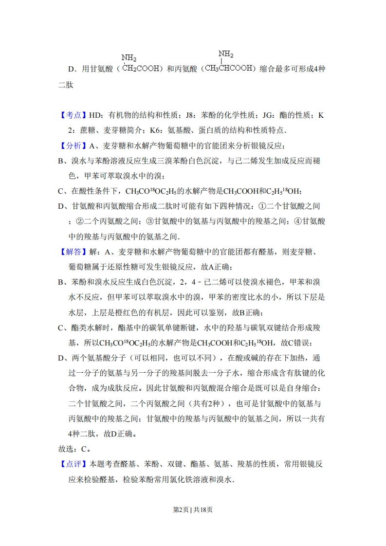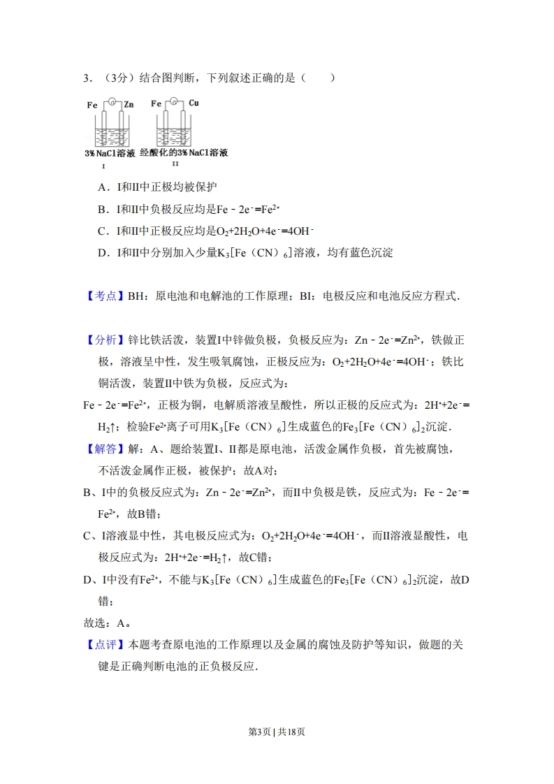 2011年北京市高考化学试卷事考答案与试题佩折一、选择题(共7小题,每小题3分,满分21分)1.(3分)垃圾分类有利于资源回收利用.下列垃圾归类不合理的是(①②③④垃圾废易拉罐废塑料瓶废荧光灯管不可再生废纸垃圾分类可回收物其他垃圾有害垃圾可燃垃圾A.①B.②C.③D.④【考点】F7:常见的生活环境的污染及治理【分析】分析这道题,要密切结合生活常识,根据各种废品的可利用程度来分类【解答】解:A、废易拉罐可回收利用,所以属于可回收物。B、废塑料瓶也可回收利用,所以属于可回收物。C、废荧光灯管中含有重金属等有害物质,所以属于有害垃圾。D、废纸可以燃烧,所以属于可燃垃圾。故选:B。【点评】可回收垃圾主要包括废纸、塑料、玻璃、金属和布料五大类.通过综合处理回收利用,可以减少污染,节省资源.2.(3分)下列说法不正确的是()A.麦芽糖及其水解产物均能发生银镜反应B.用溴水即可鉴别苯酚溶液、2,4-己二烯和甲苯C.在酸性条件下,CH3CO18OC2H5的水解产物是CHCO18OH和C2H5OH第1页1共18页N旺2NH2D.用甘氨酸(CH2COOH)和丙氨酸(CH3CHCOOH)缩合最多可形成4种二肽【考点】HD:有机物的结构和性质:J8:苯酚的化学性质:JG:酯的性质;K2:蔗糖、麦芽糖简介:K6:氨基酸、蛋白质的结构和性质特点,【分析】A、麦芽糖和水解产物葡萄糖中的官能团来分析银镜反应:B、溴水与苯酚溶液反应生成三溴苯酚白色沉淀,与己二烯发生加成反应而褪色,甲苯可萃取溴水中的溴:C、在酸性条件下,CHCO18OC2H5的水解产物是CH3COOH和C2H518OHD、甘氨酸和丙氨酸缩合形成二肽时可能有如下四种情况:①二个甘氨酸之间:②二个丙氨酸之间:③甘氨酸中的氨基与丙氨酸中的羧基之间:④甘氨酸中的羧基与丙氨酸中的氨基之间【解答】解:A、麦芽糖和水解产物葡萄糖中的官能团都有醛基,则麦芽糖、葡萄糖属于还原性糖可发生银镜反应,故A正确:B、苯酚和溴水反应生成白色沉淀,2,4-已二烯可以使溴水褪色,甲苯和溴水不反应,但甲苯可以萃取溴水中的溴,甲苯的密度比水的小,所以下层是水层,上层是橙红色的有机层,因此可以鉴别,故B正确:C、酯类水解时,酯基中的碳氧单键断键,水中的羟基与碳氧双键结合形成羧基,所以CH3CO18OC2H5的水解产物是CH3COOH和C2H18OH,故C错误:D、两个氨基酸分子(可以相同,也可以不同),在酸或碱的存在下加热,通过一分子的氨基与另一分子的羧基间脱去一分子水,缩合形成含有肽键的化合物,成为成肽反应。因此甘氨酸和丙氨酸混合缩合是既可以是自身缩合:二个甘氨酸之间,二个丙氨酸之间(共有2种),也可是甘氨酸中的氨基与丙氨酸中的羧基之间:甘氨酸中的羧基与丙氨酸中的氨基之间,所以一共有4种二肽,故D正确。故选:C。【点评】本题考查醛基、苯酚、双键、酯基、氨基、羧基的性质,常用银镜反应来检验醛基,检验苯酚常用氯化铁溶液和溴水.第2页|共18页3.(3分)结合图判断,下列叙述正确的是()Fe ZnFeCu3%NaCl溶液经酸化的3%NaC1溶液IA.I和I中正极均被保护B.I和Ⅱ中负极反应均是Fe-2e=Fe2C.I和I中正极反应均是02+2H20+4e=4OHD.I和I中分别加入少量K3[Fe(CN)6]溶液,均有蓝色沉淀【考点】BH:原电池和电解池的工作原理;BI:电极反应和电池反应方程式:【分析】锌比铁活泼,装置I中锌做负极,负极反应为:Zn-2e=Zn2,,铁做正极,溶液呈中性,发生吸氧腐蚀,正极反应为:O2+2HO+4e=4OH:铁比铜活泼,装置Ⅱ中铁为负极,反应式为:Fe-2e=Fe2,正极为铜,电解质溶液呈酸性,所以正极的反应式为:2H+2e=H2↑:检验Fe2离子可用K3[Fe(CN)6]生成蓝色的Fe3[Fe(CN)6]2沉淀,【解答】解:A、题给装置I、Ⅱ都是原电池,活泼金属作负极,首先被腐蚀,不活泼金属作正极,被保护:故A对:B、I中的负极反应式为:Zn-2e=Zn2,而I中负极是铁,反应式为:Fe-2e=Fe2,故B错:C、I溶液显中性,其电极反应式为:O2+2H2O+4=4OH~,而I溶液显酸性,电极反应式为:2H+2e=H2↑,故C错:D、I中没有Fe2·,不能与K3[Fe(CN)6]生成蓝色的Fe3[Fe(CN)6]2沉淀,故D错:故选:A。【点评】本题考查原电池的工作原理以及金属的腐蚀及防护等知识,做题的关键是正确判断电池的正负极反应.第3页|共18页
