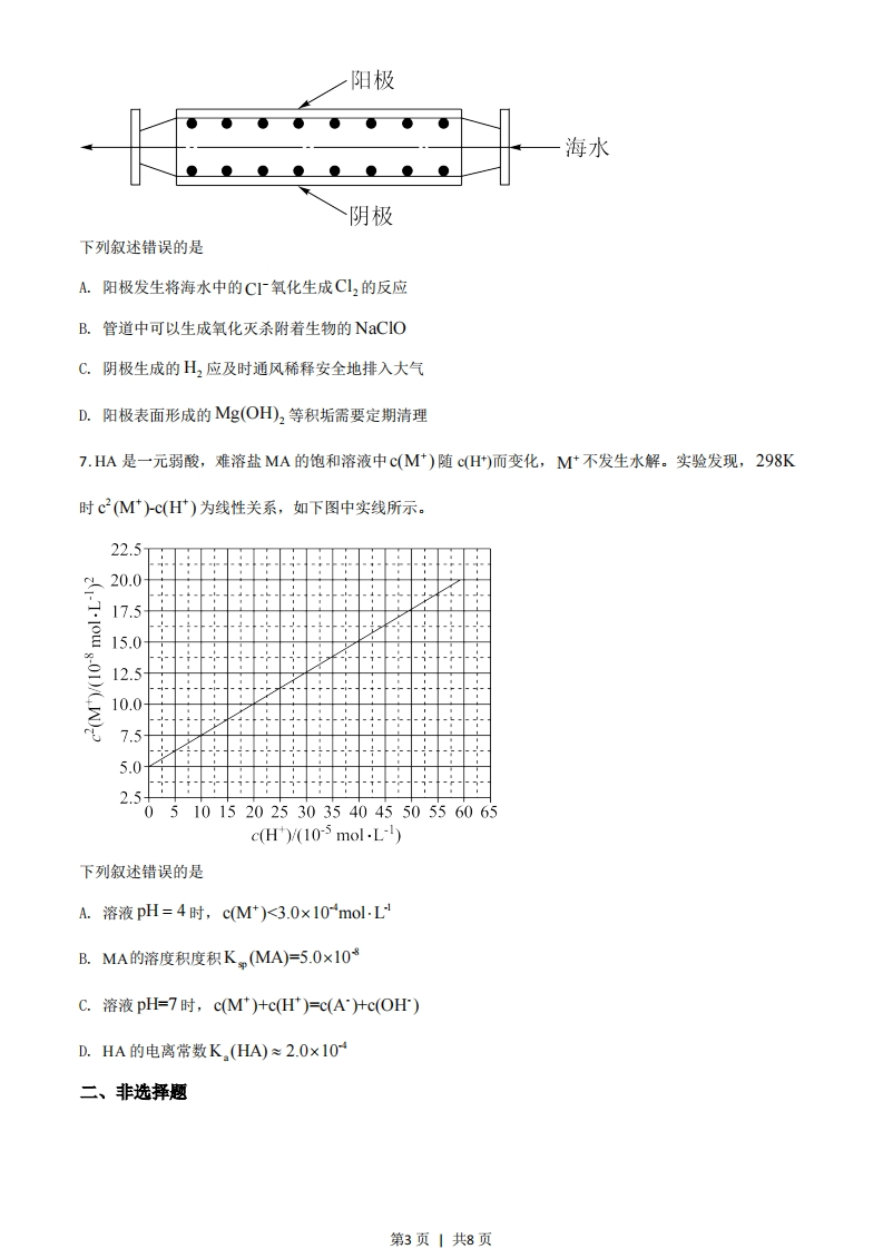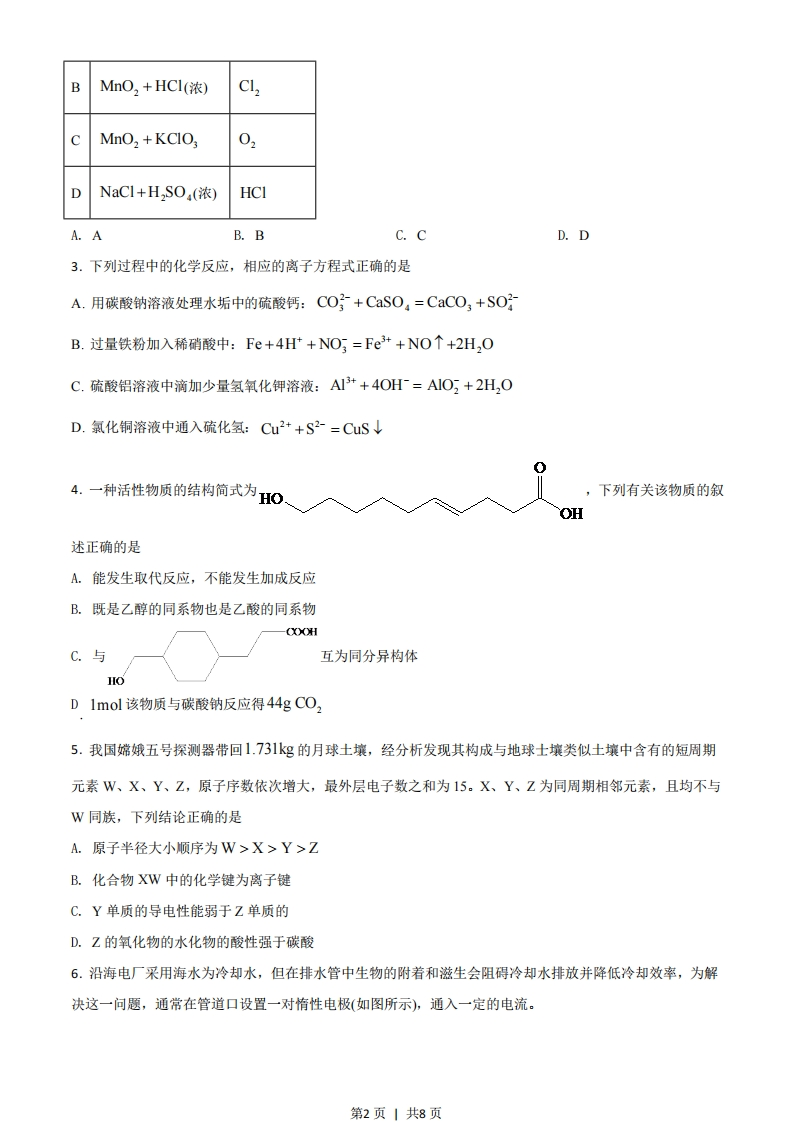 2021年普通高等学校招生全国统一考试理科综合能力测试注意事项:1答卷前,考生务必将自已的姓名、准考证号填写在答题卡上,并将自已的姓名、准考证号、座位号填写在本试卷上。2.回答选择题时,选出每小题答案后,用2B铅笔把答题卡上对应题目的答案标号涂黑;如需改动,用橡皮擦干净后,再选涂其他答案标号,涂写在本试卷上无效。3.作答非选释题时,将答案书写在答题卡上,书写在本试卷上无效。4考试结束后,将本试卷和答题卡一并交回。可能用到的相对原子质量:H1C12N14016Na23Al27C135.5Fe56一、选择题1.我国提出争取在2030年前实现碳达峰,2060年实现碳中和,这对于改善环境,实现绿色发展至关重要。碳中和是指CO,的排放总量和减少总量相当。下列措施中能促进碳中和最直接有效的是A.将重质油裂解为轻质油作为燃料B.大规模开采可燃冰作为新能源C.通过清洁煤技术减少煤燃烧污染D.研发催化剂将C0,还原为甲醇2.在实验室采用如图装置制备气体,合理的是棉花化学试剂制备的气体Ca(OH)2 +NH,CINH;第1页1共8页BMnO2+HCl(浓)C12MnO,+KClO;02DNaCl+HSO,(浓)HCIA.AB.BC.CD.D3.下列过程中的化学反应,相应的离子方程式正确的是A.用碳酸钠溶液处理水垢中的硫酸钙:CO+CaSO,=CaCO,+SO}B.过量铁粉加入稀硝酸中:Fe+4Ht+NO;=Fe3++NO个+2H,OC.硫酸铝溶液中滴加少量氢氧化钾溶液:A13++4OH=A1O,+2H,OD.氯化铜溶液中通入硫化氢:Cu++S2-=CuS↓4.一种活性物质的结构简式为H0,下列有关该物质的叙OH述正确的是A.能发生取代反应,不能发生加成反应B.既是乙醇的同系物也是乙酸的同系物COXOHC.与互为同分异构体OD1mol该物质与碳酸钠反应得44gCO,5.我国嫦娥五号探测器带回1.731kg的月球土壤,经分析发现其构成与地球士壤类似土壤中含有的短周期元素W、X、Y、Z,原子序数依次增大,最外层电子数之和为15。X、Y、Z为同周期相邻元素,且均不与W同族,下列结论正确的是A.原子半径大小顺序为W>X>Y>ZB.化合物XW中的化学键为离子键C.Y单质的导电性能弱于Z单质的D.Z的氧化物的水化物的酸性强于碳酸6.沿海电厂采用海水为冷却水,但在排水管中生物的附着和滋生会阻碍冷却水排放并降低冷却效率,为解决这一问题,通常在管道口设置一对惰性电极(如图所示),通入一定的电流。第2页1共8页阳极海水●阴极下列叙述错误的是A.阳极发生将海水中的CI氧化生成Cl2的反应B.管道中可以生成氧化灭杀附着生物的NaCIOC.阴极生成的H2应及时通风稀释安全地排入大气D.阳极表面形成的Mg(OH2等积垢需要定期清理7.HA是一元弱酸,难溶盐MA的饱和溶液中C(M)随c(H)而变化,M不发生水解。实验发现,298K时c2(M)c(H)为线性关系,如下图中实线所示。22.520.017.515.012.510.07.55.0-2.505101520253035404550556065c(H)/(10>mol.L-)下列叙述错误的是A.溶液pH=4时,cM)<3.0×10mol-LB.MA的溶度积度积KMA)=5.0×10C.溶液pH=7时,cM)+c(H)=c(A十c(OH)D.HA的电离常数K,(HA)≈2.0×10二、非选择题第3页1共8页