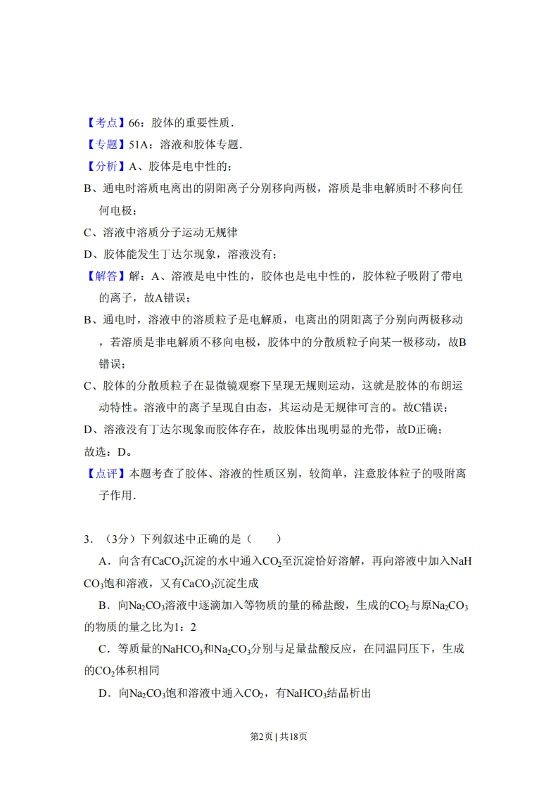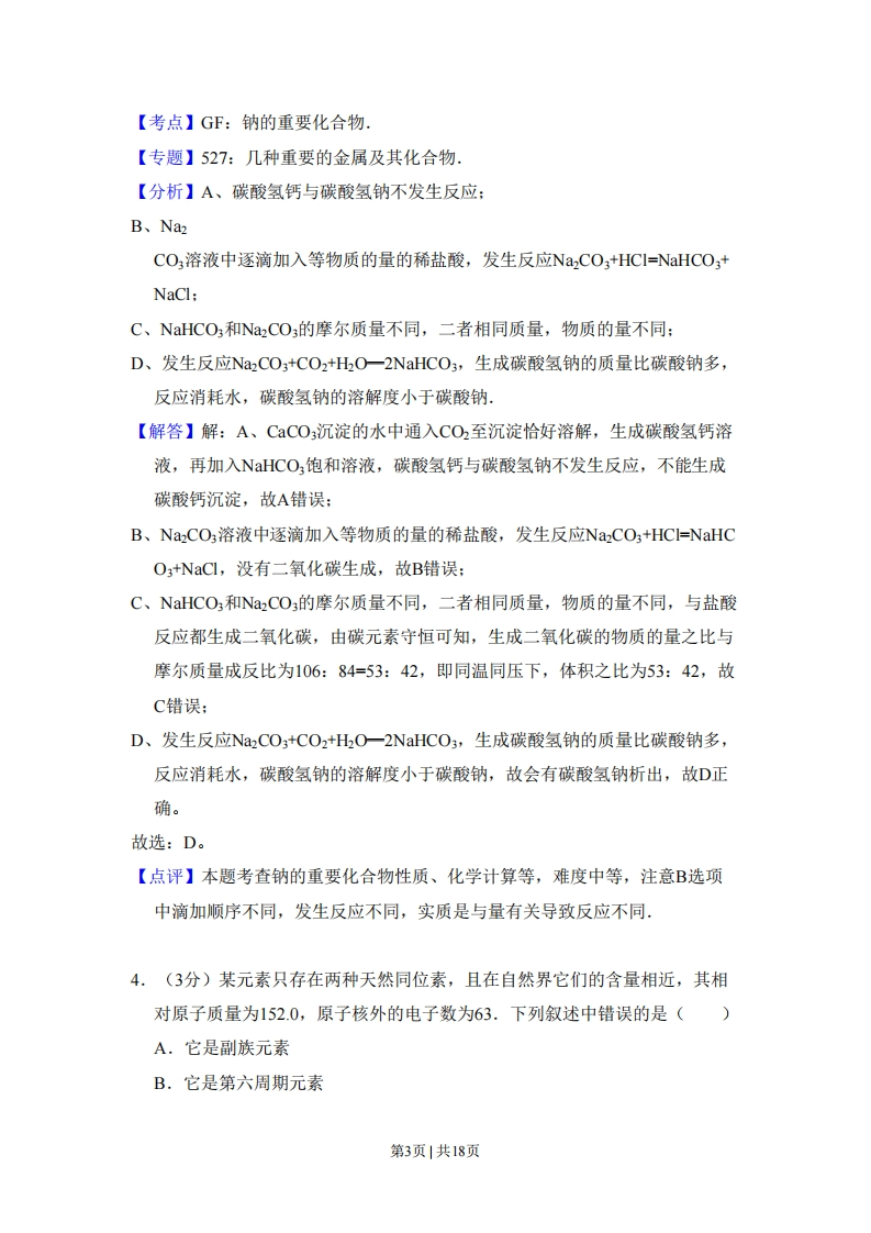 2009年全国统一高考化学试卷(全国卷Ⅱ)事考答案与试题佩折一、选择题1.(3分)物质的量之比为2:5的锌与稀硝酸反应,若硝酸被还原的产物为N2O,反应结束后锌没有剩余,则该反应中被还原的硝酸与未被还原的硝酸的物质的量之比是()A.1:4B.1:5C.2:3D.2:5【考点】BQ:氧化还原反应的计算:EG:硝酸的化学性质,【专题】515:氧化还原反应专题:524:氮族元素.【分析】锌与稀硝酸反应时硝酸既表现酸性又表现氧化性,根据原子守恒和电子守恒规律来解决,【解答】解:锌与稀硝酸反应时硝酸既表现酸性又表现氧化性,根据原子守恒和电子守恒,2mol锌失去4mol电子,生成2mol锌离子,由于生成硝酸锌,则其结合的硝酸根离子是4mol,则剩余的1mol的硝酸被还原为N20就得到4mol电子,硝酸也全部反应,则该反应中被还原的硝酸与未被还原的硝酸的物质的量之比是1:4,即4Zn+10HNO3(一般稀)=4Zn(NO3)2+N20↑+5H20.故选A。【点评】本题是对硝酸的氧化性知识的考查,注意电子守恒思想在氧化还原反应中的运用.2.(3分)下列关于溶液和胶体的叙述,正确的是()A.溶液是电中性的,胶体是带电的B.通电时,溶液中的溶质粒子分别向两极移动,胶体中的分散质粒子向某一极移动C.溶液中溶质分子的运动有规律,胶体中分散质粒子的运动无规律,即布朗运动D.一束光线分别通过溶液和胶体时,后者会出现明显的光带,前者则没有第1页1共18页【考点】66:胶体的重要性质.【专题】51A:溶液和胶体专题.【分析】A、胶体是电中性的:B、通电时溶质电离出的阴阳离子分别移向两极,溶质是非电解质时不移向任何电极:C、溶液中溶质分子运动无规律D、胶体能发生丁达尔现象,溶液没有:【解答】解:A、溶液是电中性的,胶体也是电中性的,胶体粒子吸附了带电的离子,故A错误:B、通电时,溶液中的溶质粒子是电解质,电离出的阴阳离子分别向两极移动,若溶质是非电解质不移向电极,胶体中的分散质粒子向某一极移动,故B错误:C、胶体的分散质粒子在显微镜观察下呈现无规则运动,这就是胶体的布朗运动特性。溶液中的离子呈现自由态,其运动是无规律可言的。故C错误:D、溶液没有丁达尔现象而胶体存在,故胶体出现明显的光带,故D正确:故选:D。【点评】本题考查了胶体、溶液的性质区别,较简单,注意胶体粒子的吸附离子作用.3.(3分)下列叙述中正确的是()A,向含有CaCO,沉淀的水中通入CO2至沉淀恰好溶解,再向溶液中加入NaHCO3饱和溶液,又有CaCO3沉淀生成B.向Na2CO3溶液中逐滴加入等物质的量的稀盐酸,生成的CO2与原Na2CO3的物质的量之比为1:2C.等质量的NaHCO,和Na2CO3分别与足量盐酸反应,在同温同压下,生成的C02体积相同D.向Na2CO3饱和溶液中通入CO2,有NaHCO,结晶析出第2页|共18页【考点】GF:钠的重要化合物.【专题】527:几种重要的金属及其化合物.【分析】A、碳酸氢钙与碳酸氢钠不发生反应:B、NaCO3溶液中逐滴加入等物质的量的稀盐酸,发生反应Na2CO3+HCl=NaHCO3+NaCl;C、NaHCO,和Na2CO3的摩尔质量不同,二者相同质量,物质的量不同:D、发生反应Na2CO3+CO2+HO一2 NaHCO3,生成碳酸氢钠的质量比碳酸钠多,反应消耗水,碳酸氢钠的溶解度小于碳酸钠【解答】解:A、CCO3沉淀的水中通入CO2至沉淀恰好溶解,生成碳酸氢钙溶液,再加入NHCO3饱和溶液,碳酸氢钙与碳酸氢钠不发生反应,不能生成碳酸钙沉淀,故A错误:B、Na2CO3溶液中逐滴加入等物质的量的稀盐酸,发生反应NaCO3+HCl=NaHCO3+NaCl,没有二氧化碳生成,故B错误:C、NaHCO3和Na2CO3的摩尔质量不同,二者相同质量,物质的量不同,与盐酸反应都生成二氧化碳,由碳元素守恒可知,生成二氧化碳的物质的量之比与摩尔质量成反比为106:84=53:42,即同温同压下,体积之比为53:42,故C错误:D、发生反应Na2CO3+CO2+HO一2 NaHCO3,生成碳酸氢钠的质量比碳酸钠多,反应消耗水,碳酸氢钠的溶解度小于碳酸钠,故会有碳酸氢钠析出,故D正确。故选:D。【点评】本题考查钠的重要化合物性质、化学计算等,难度中等,注意B选项中滴加顺序不同,发生反应不同,实质是与量有关导致反应不同.4.(3分)某元素只存在两种天然同位素,且在自然界它们的含量相近,其相对原子质量为152.0,原子核外的电子数为63.下列叙述中错误的是()A.它是副族元素B.它是第六周期元素第3页1共18页